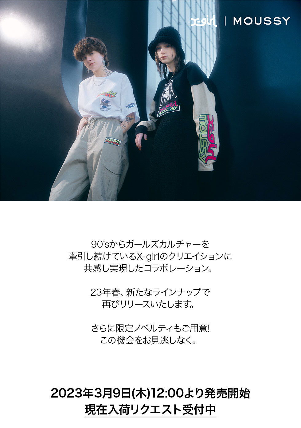 - ※3.9(木)12:00からSHEL'TTER WEB STOREにて MOUSSYの対象X-girlコラボアイテムを一回のご注文で、1点以上購入して頂いたお客様に「X-girl ショッピングバッグ」をプレゼント致します。