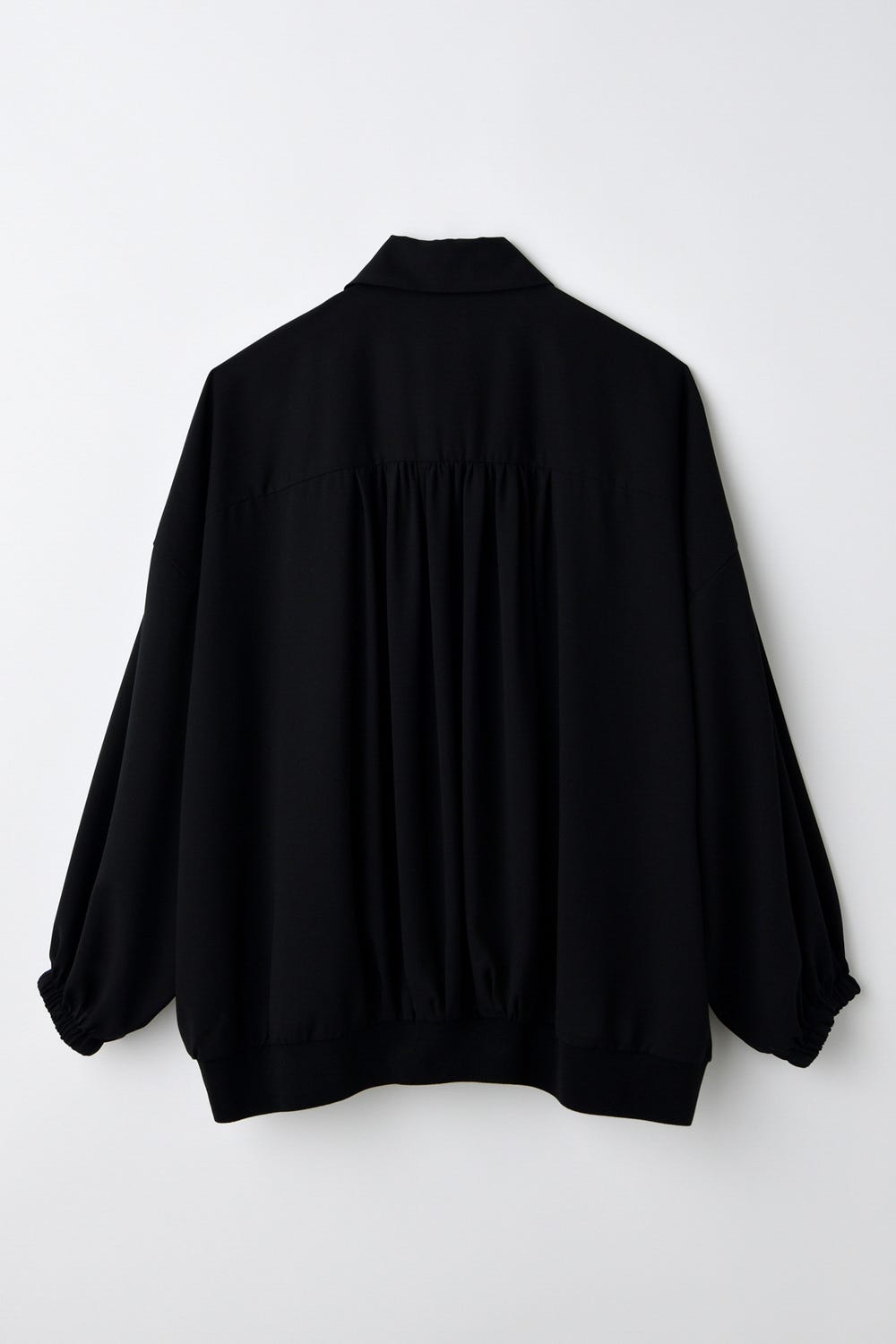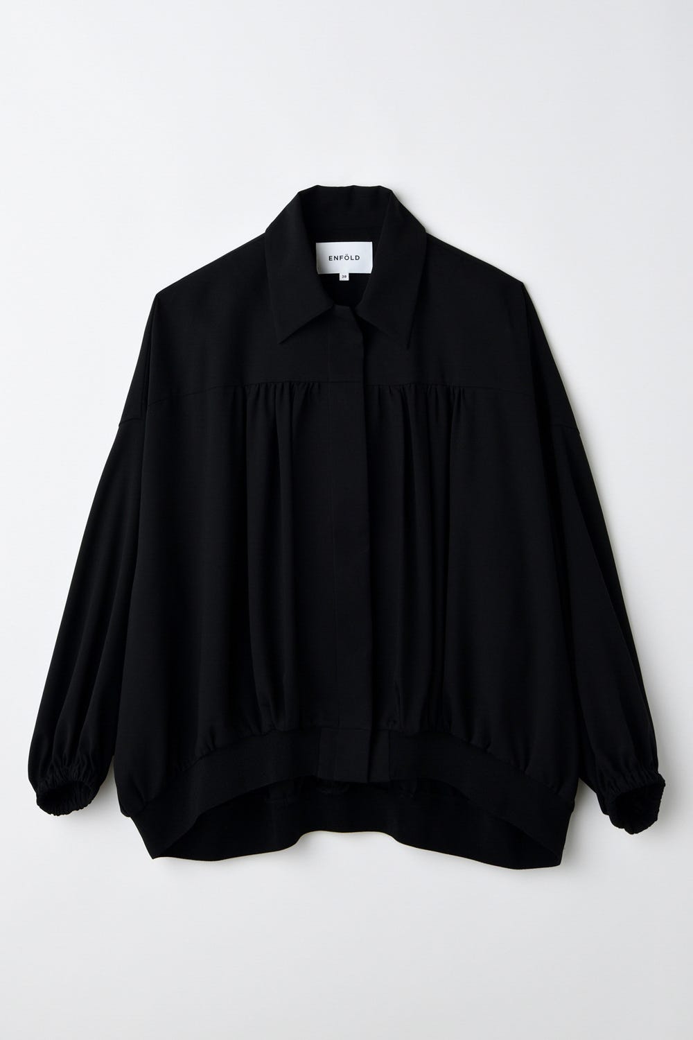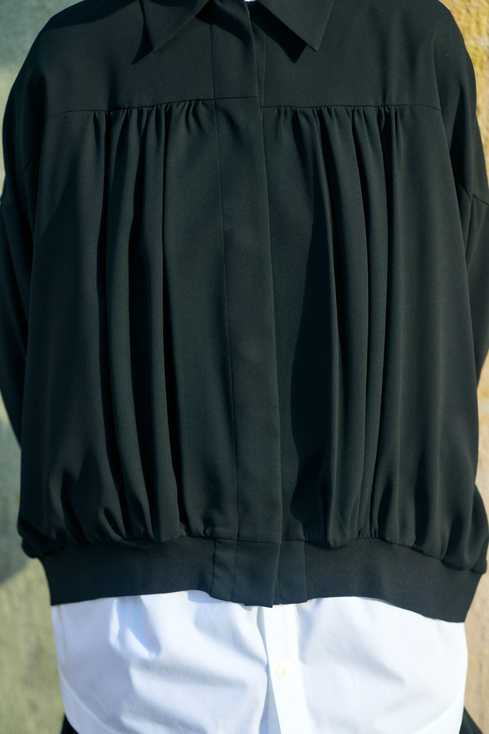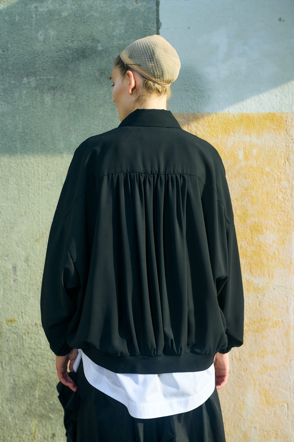 ギャザーによる縦のラインが美しいカーブヘムが特徴のBIGシルエットブルゾン。