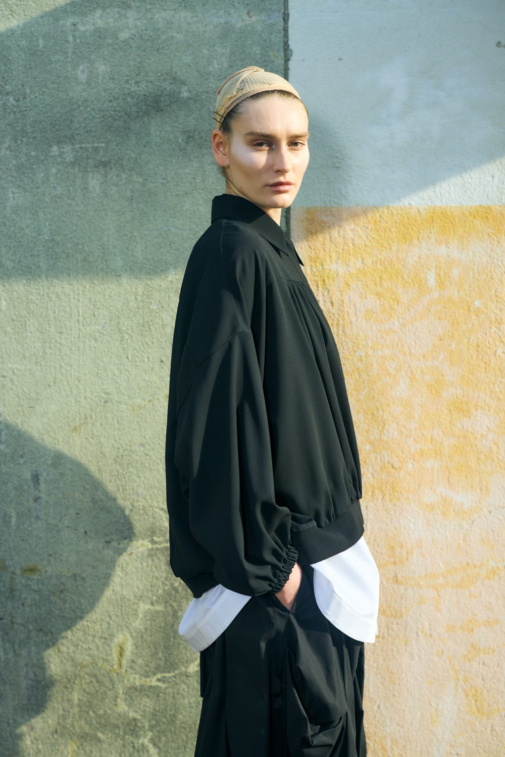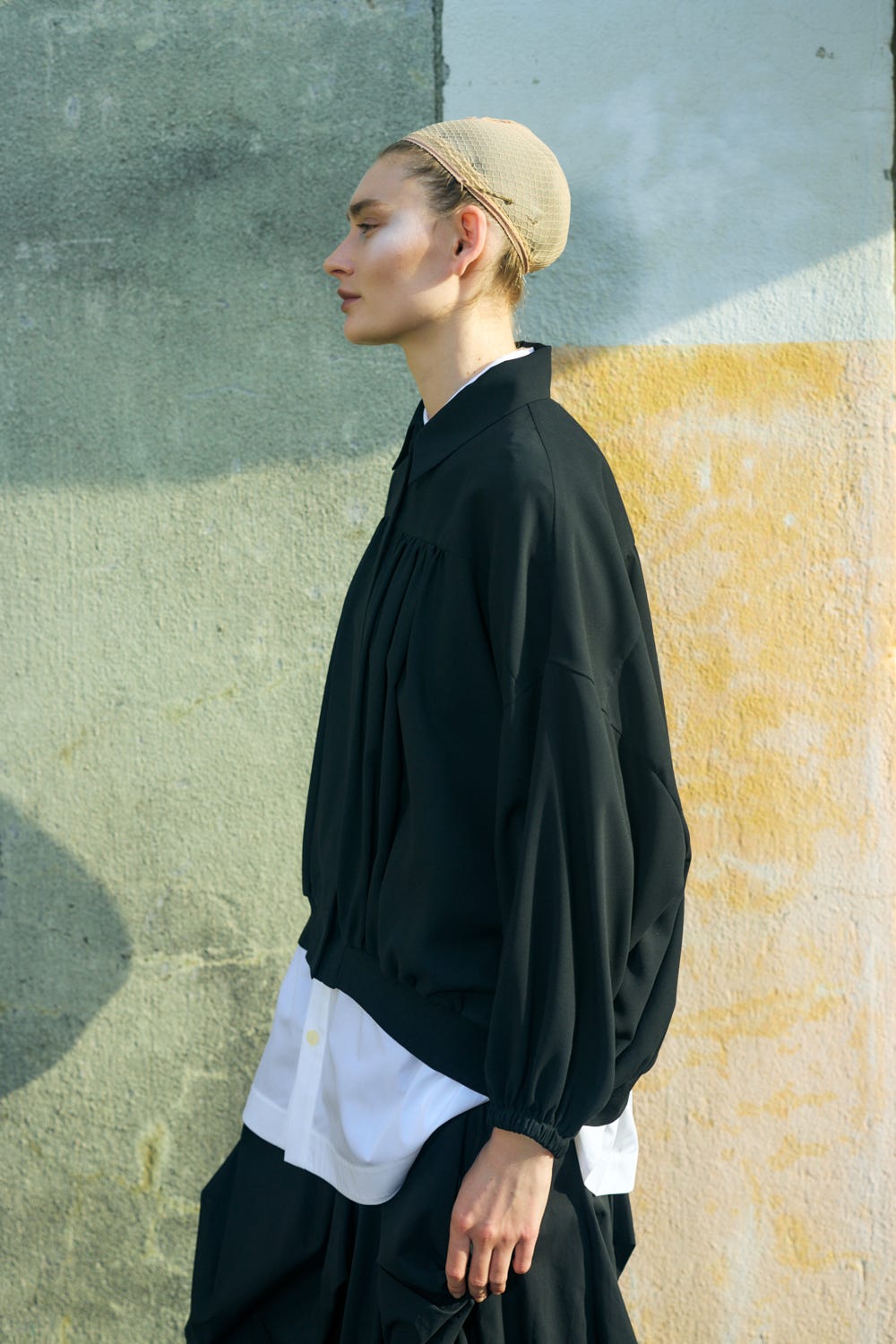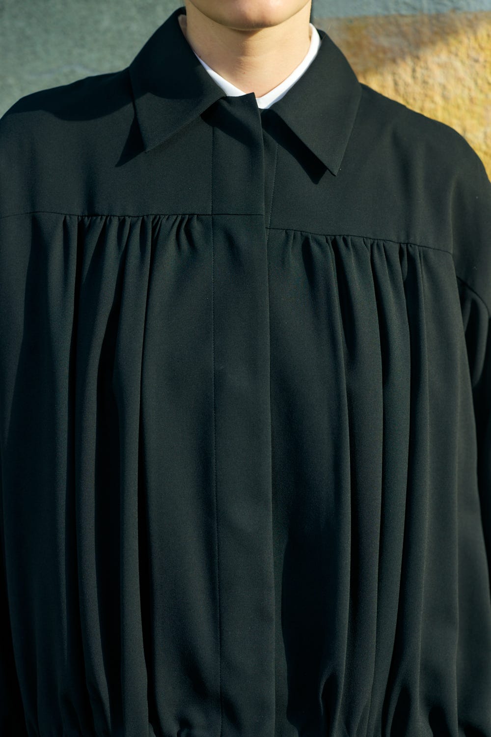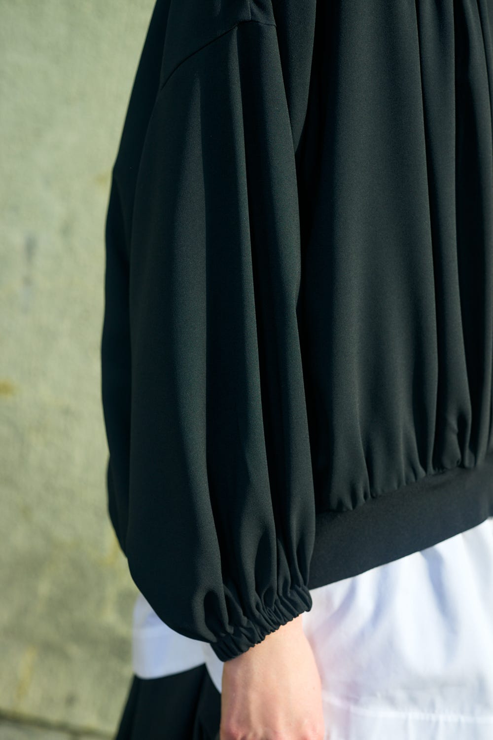 ギャザーによる縦のラインが美しいカーブヘムが特徴のBIGシルエットブルゾン。