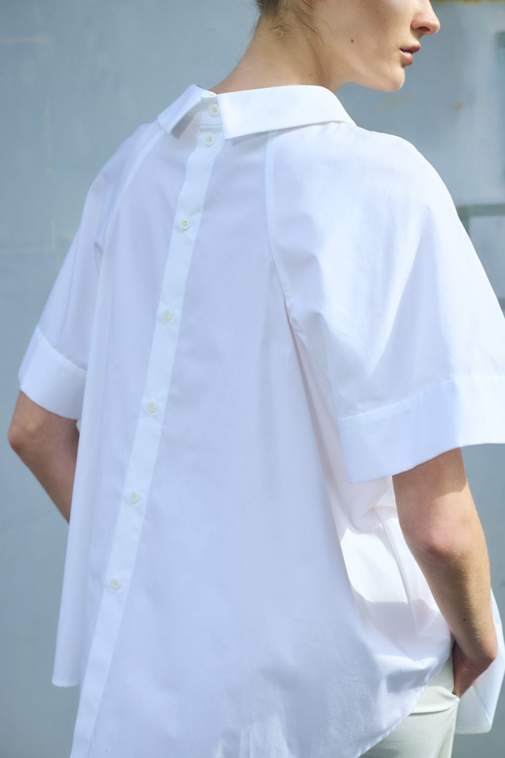 袖口に芯を貼って立体的に仕上げたワイドアームと首元を隠す対比がモードかつ非コンサバで格好良いまとまりに。