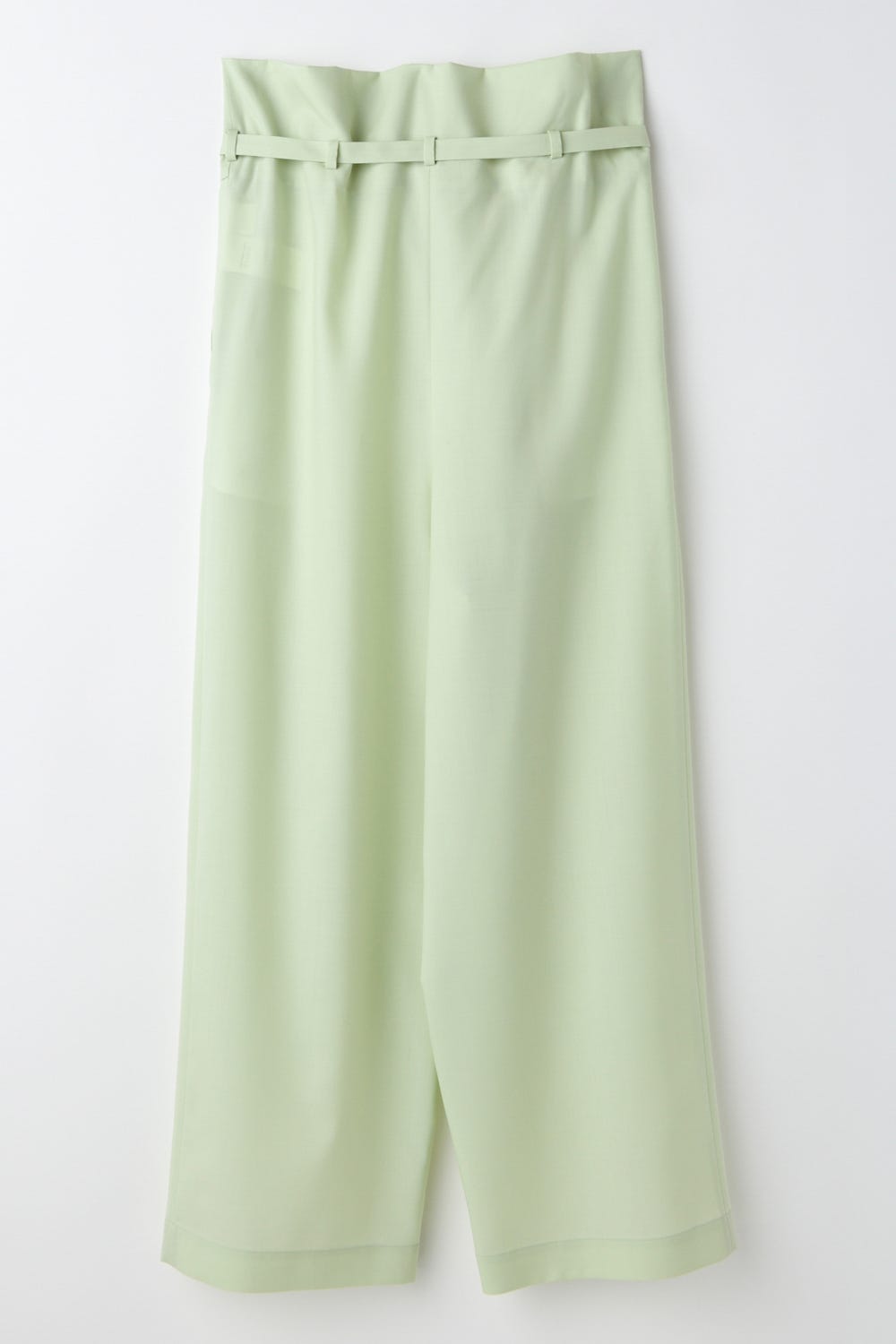 重なった前身のタックはおなかまわりの目くらましにもなるデザインで、ウエストのベルトがすっきりした印象に。