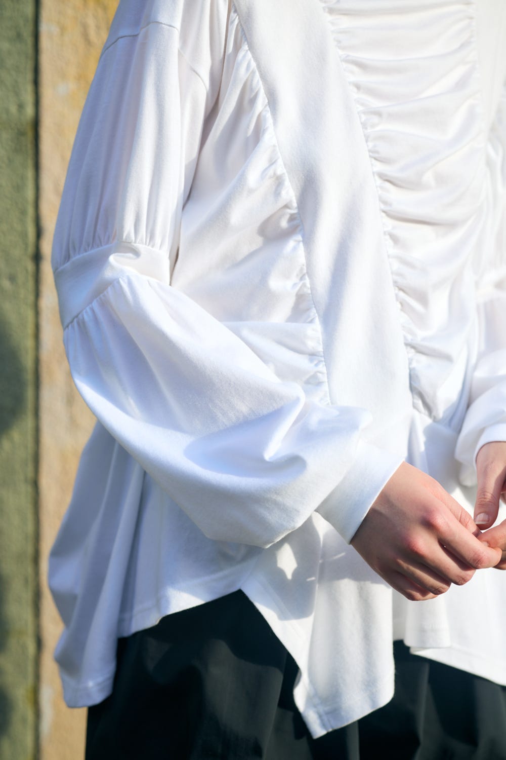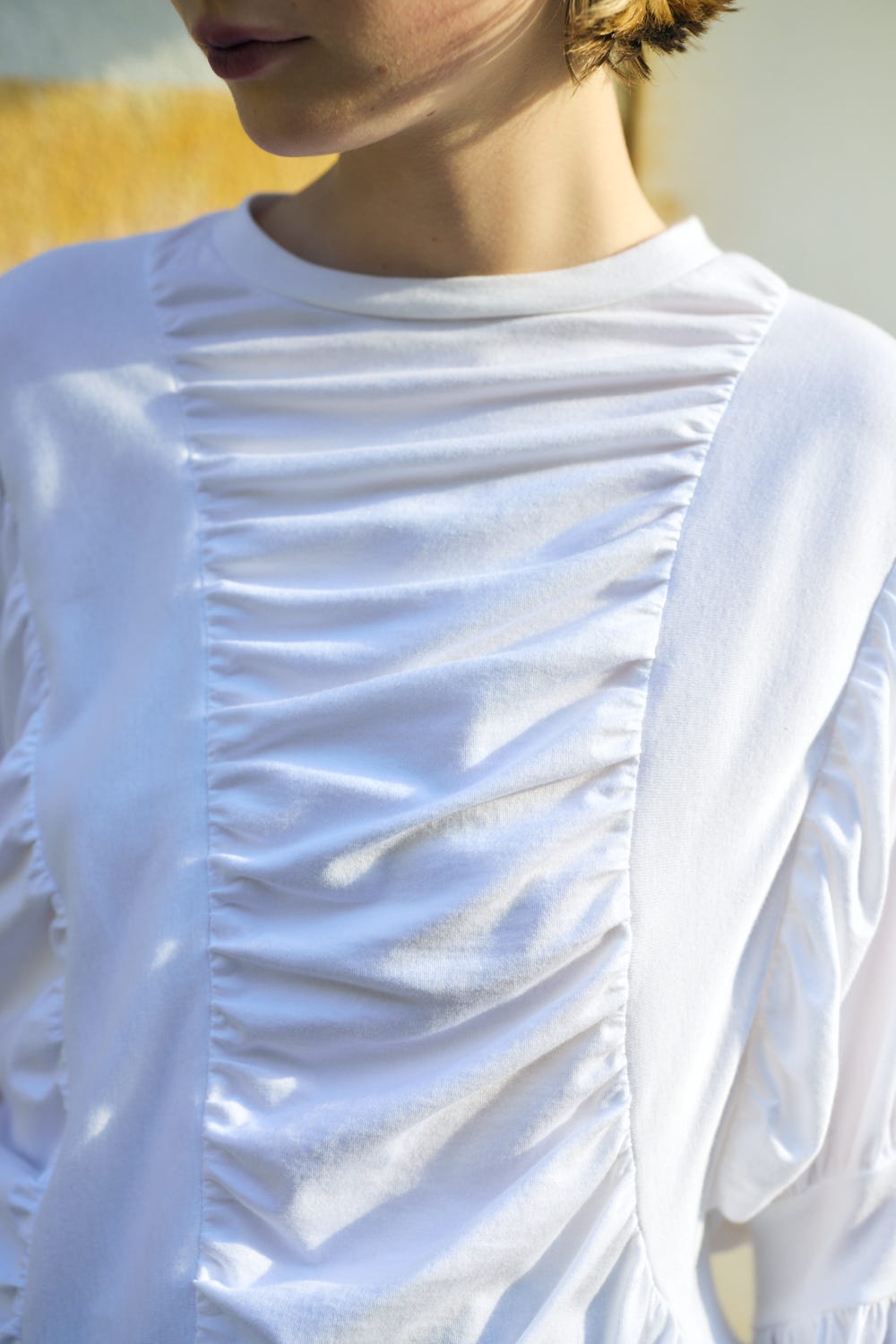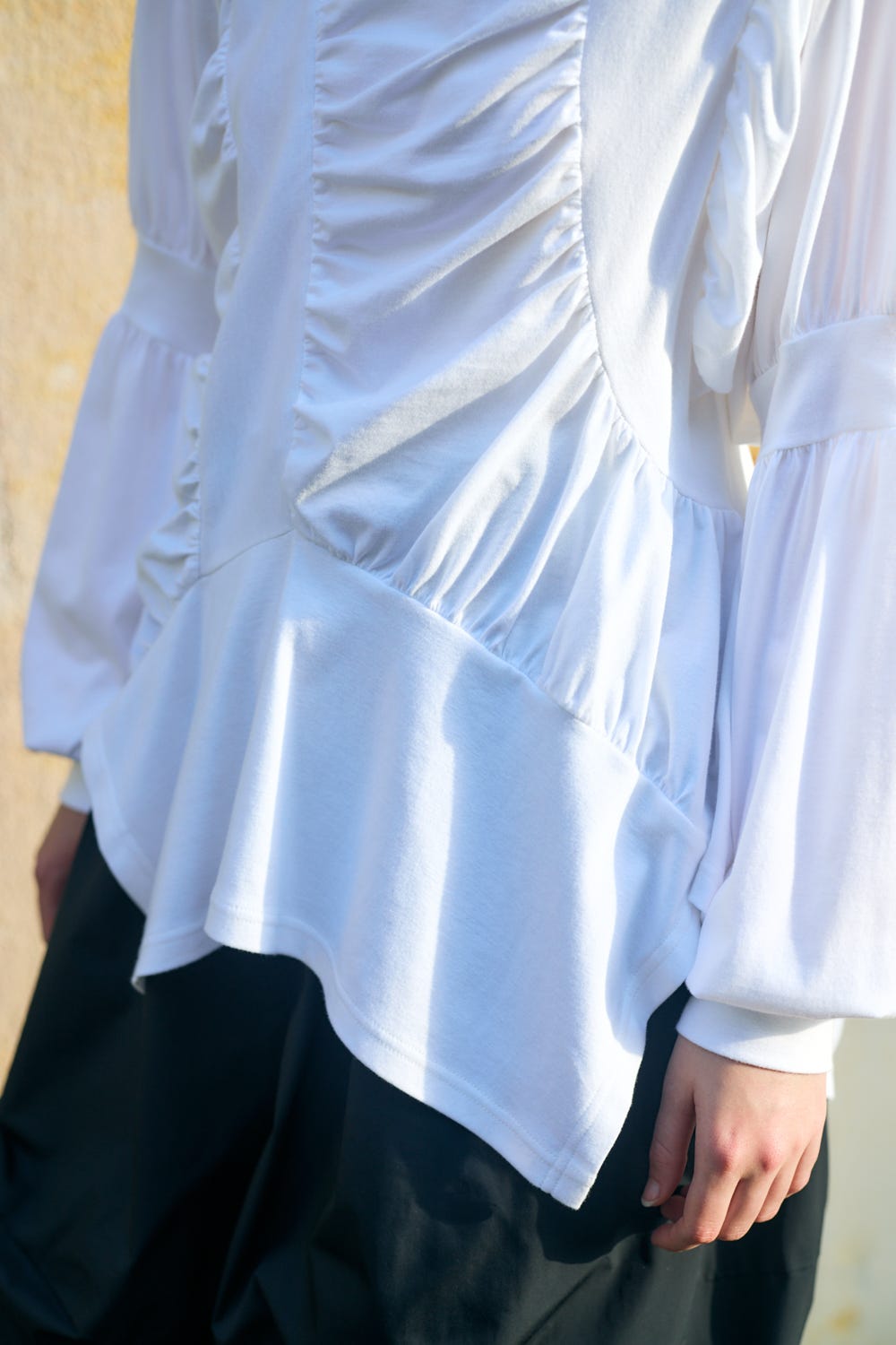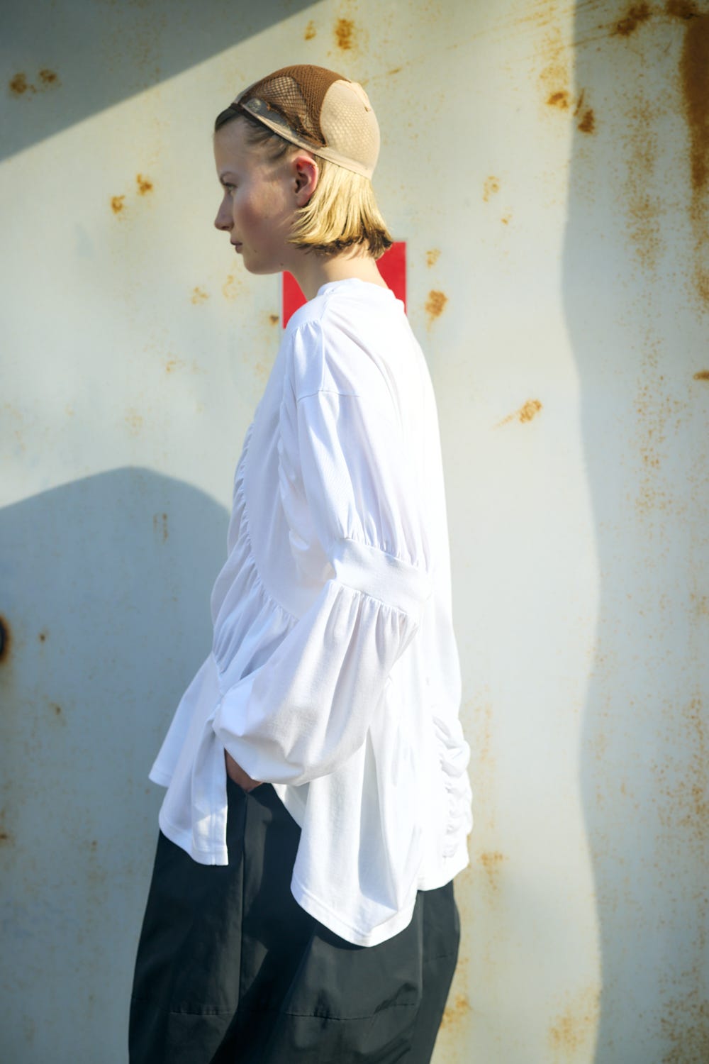 今季テーマ”Orchestra”より、音・曲調の強弱など波のある状態を表すように大胆に形がうねったカットソーの伸縮性を活かしたデザインロンT。