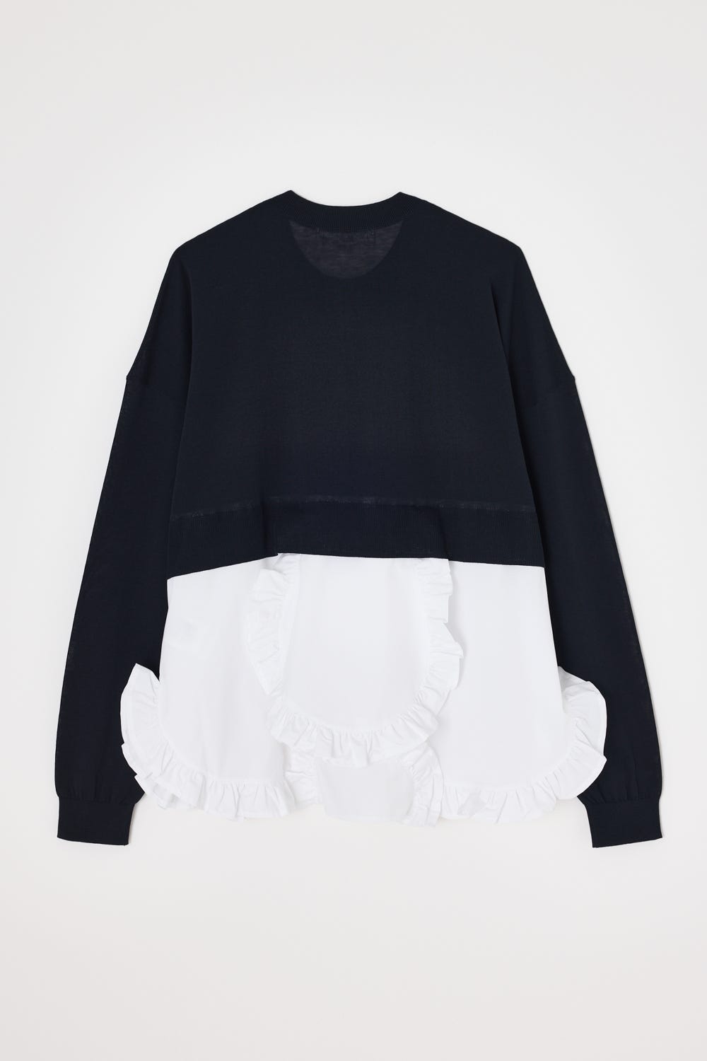 カーブしたサークルシルエットにフリルをあしらったユニークなデザインが特徴のシャツとドッキングされたデザインのカーディガン。