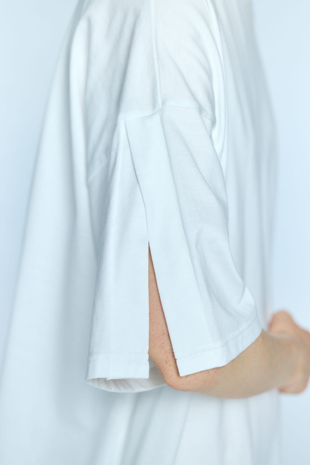 スリットの入った袖で抜け感を出して、涼しく上手に二の腕カバーができます。