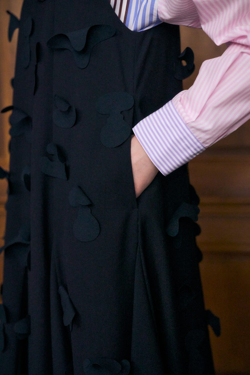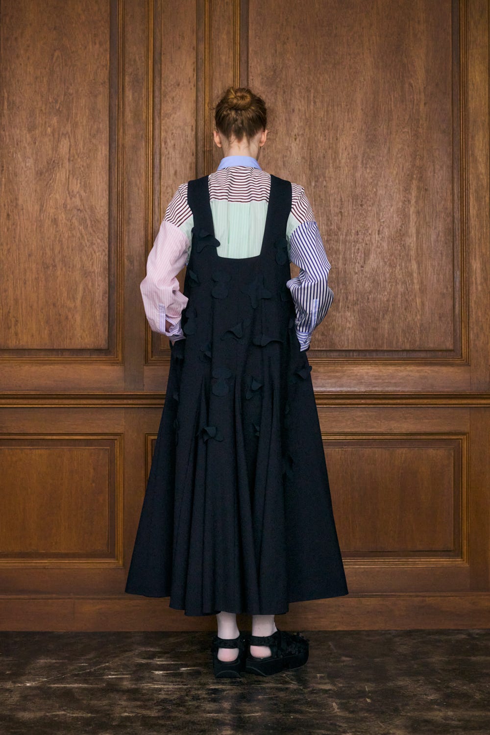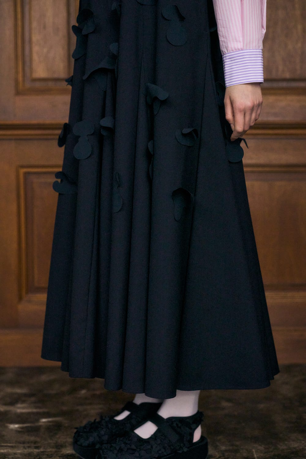 切り替えにマチをはめ込むことで分量感たっぷりの上品なフレアシルエットを作り出しています。