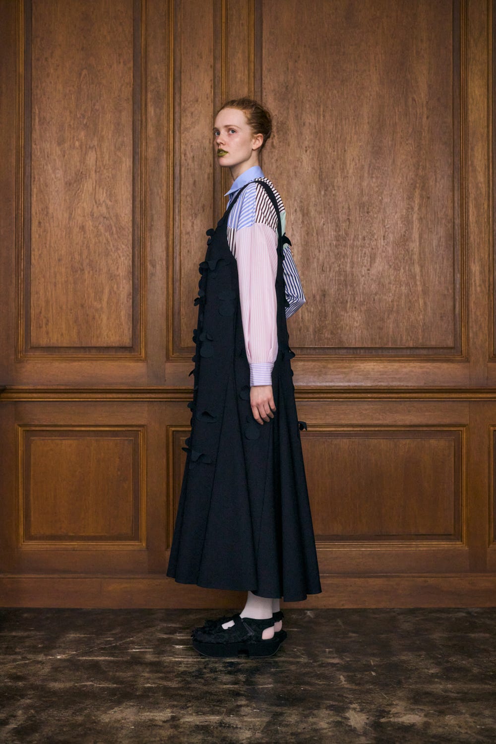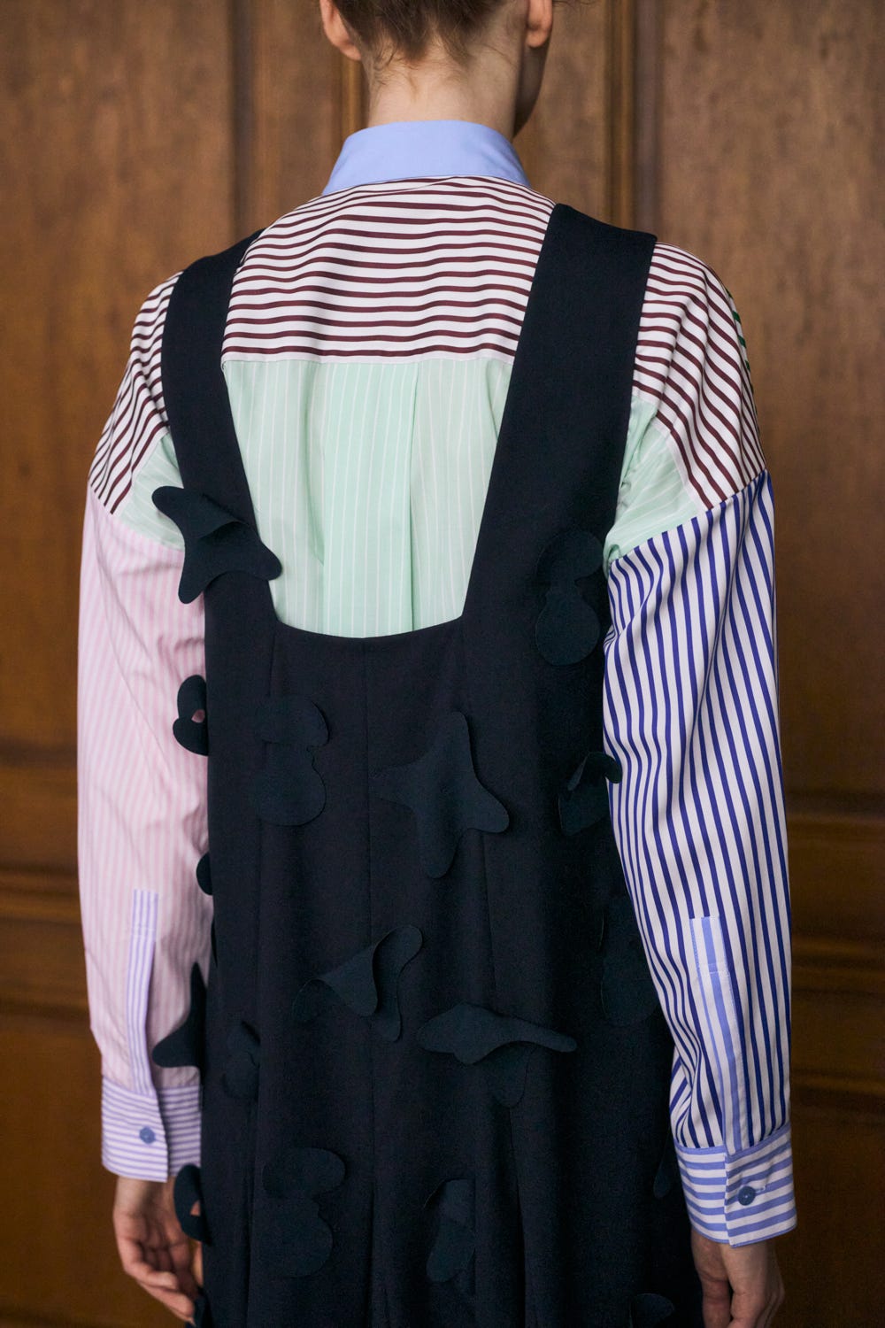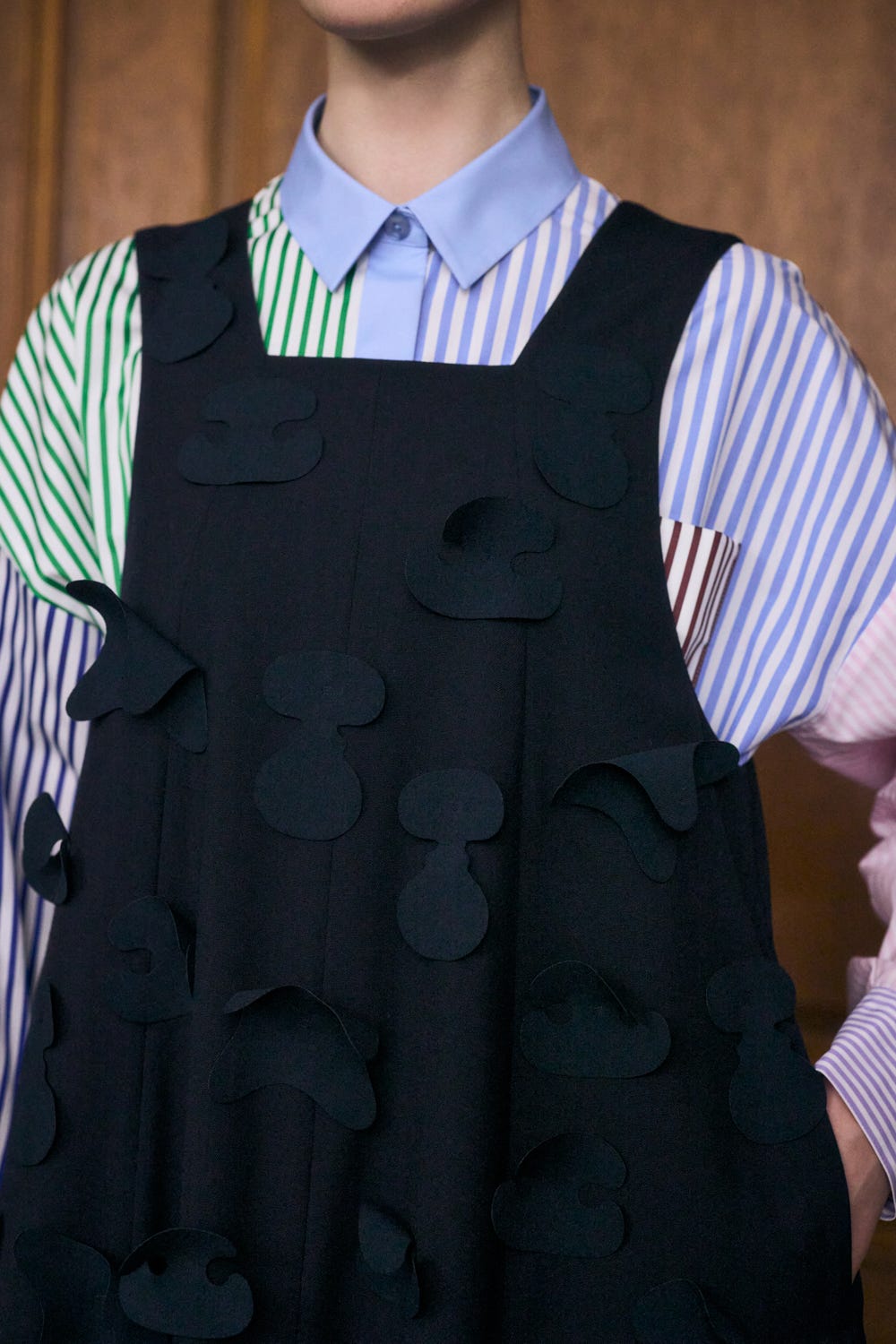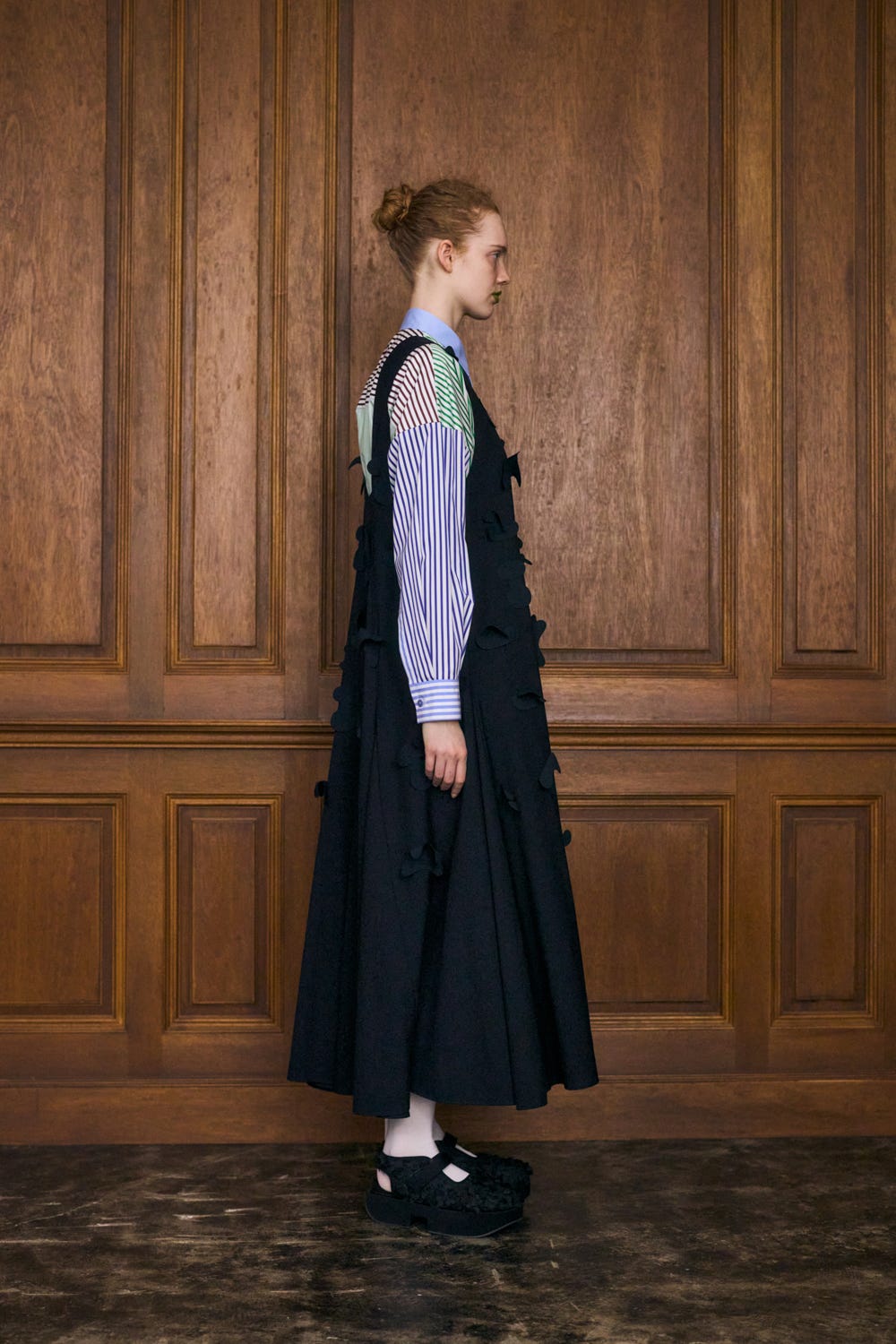 切り替えにマチをはめ込むことで分量感たっぷりの上品なフレアシルエットを作り出しています。