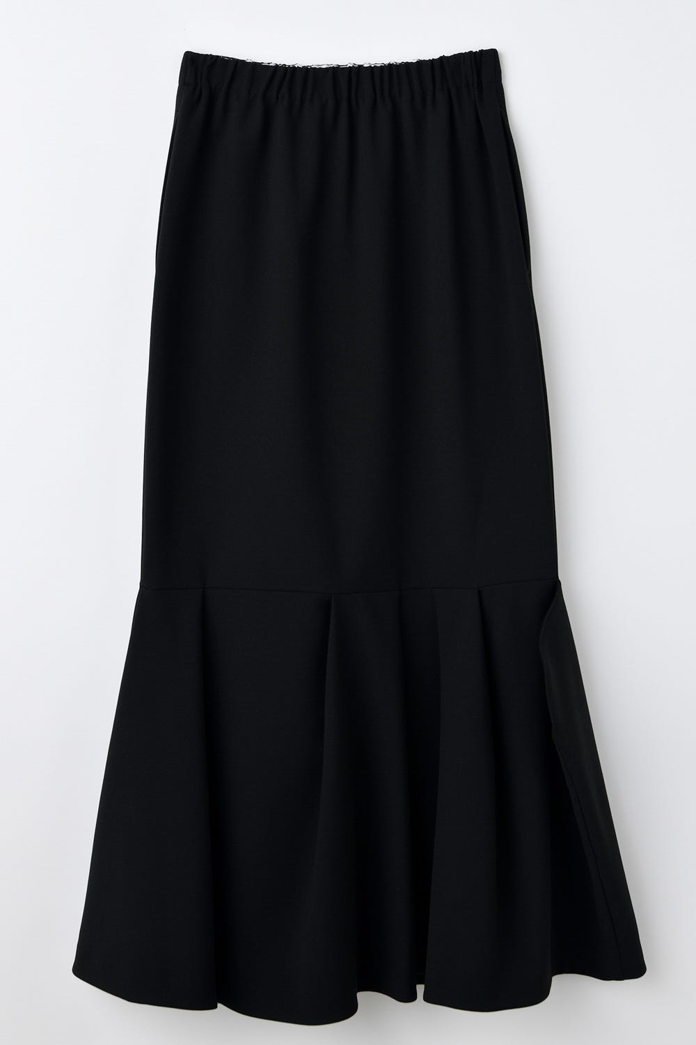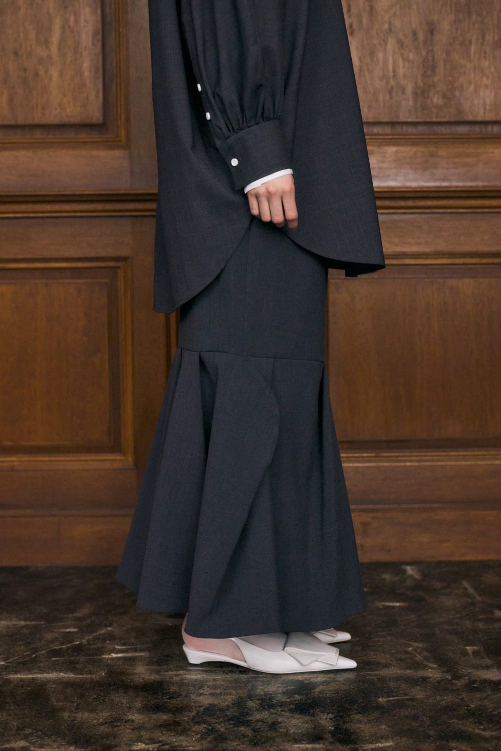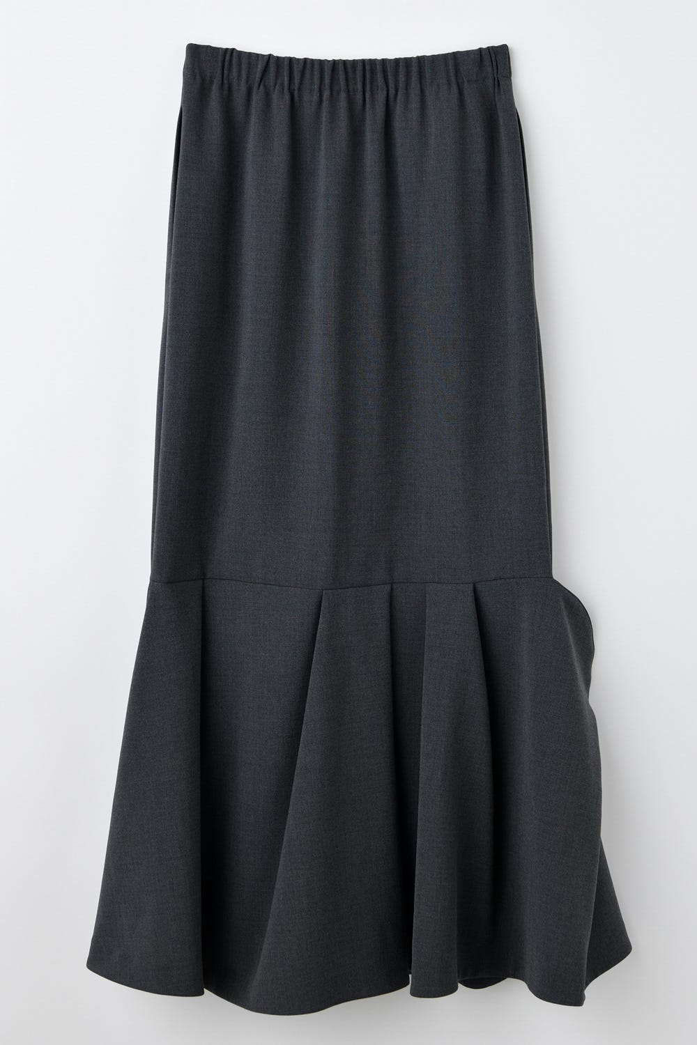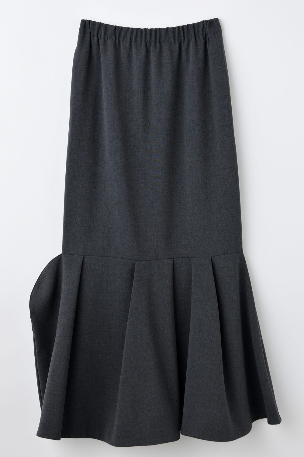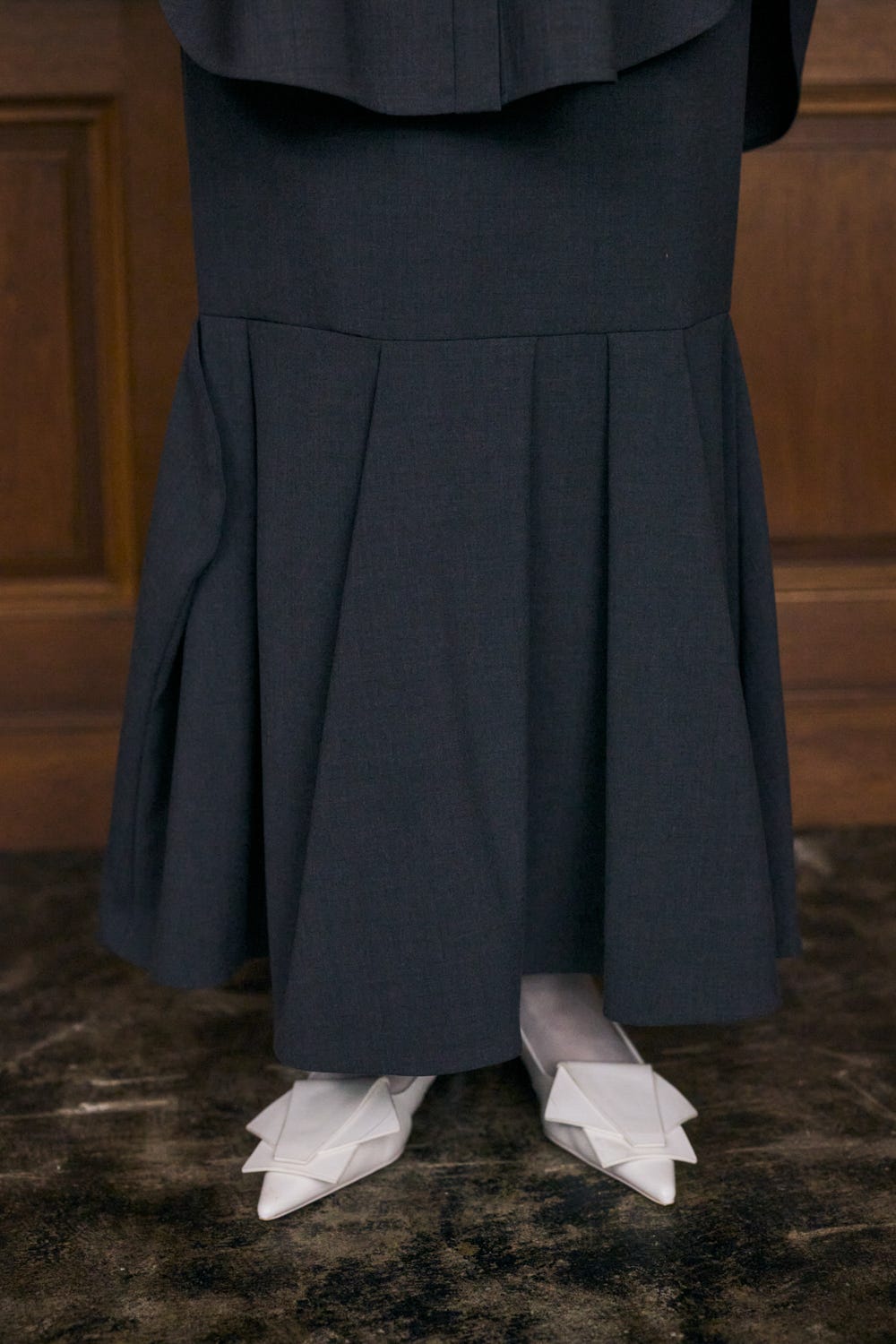 鍵穴のような丸みのある脇シルエットの下からフレアタックシルエットが広がるスカート。