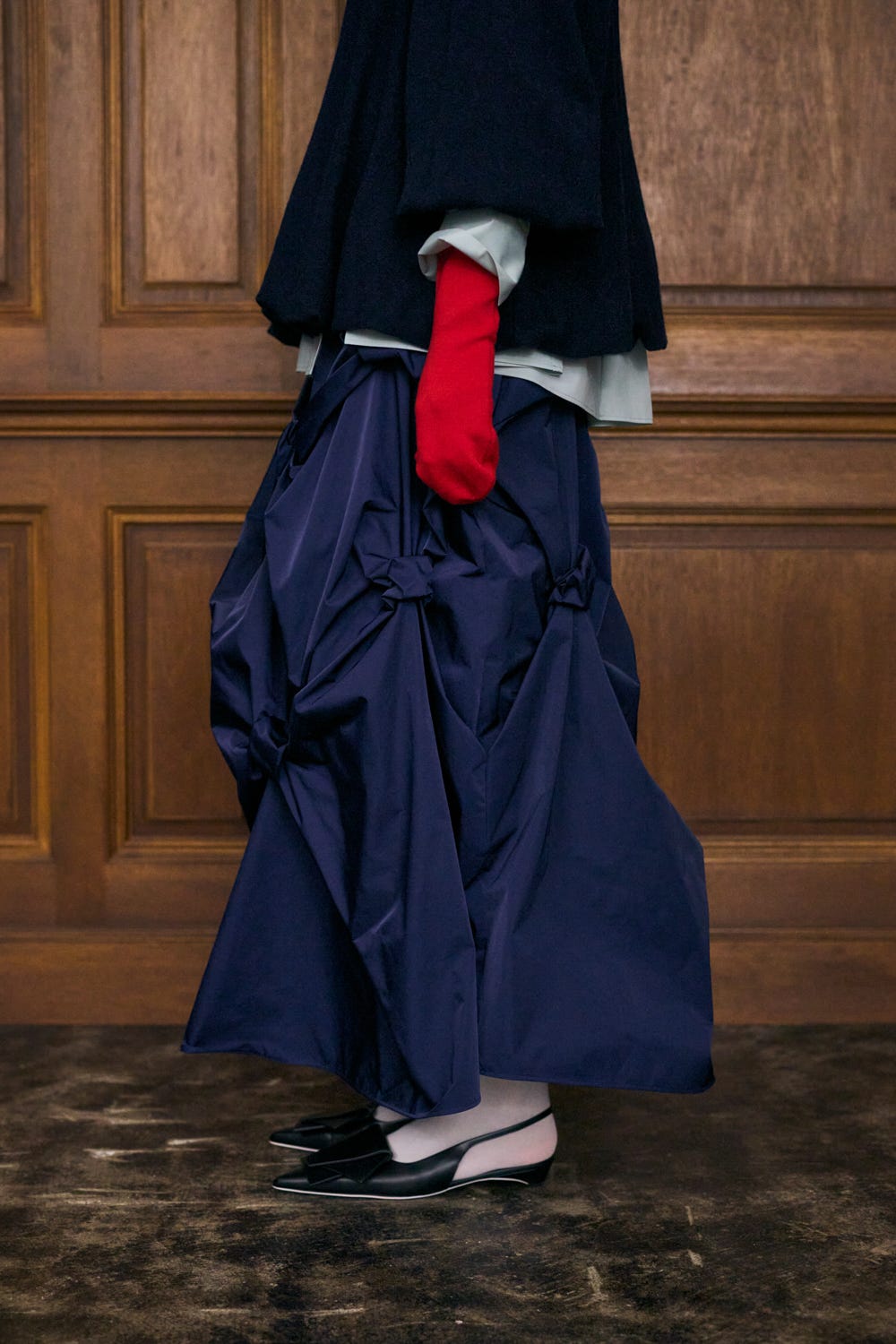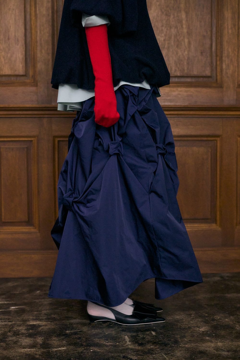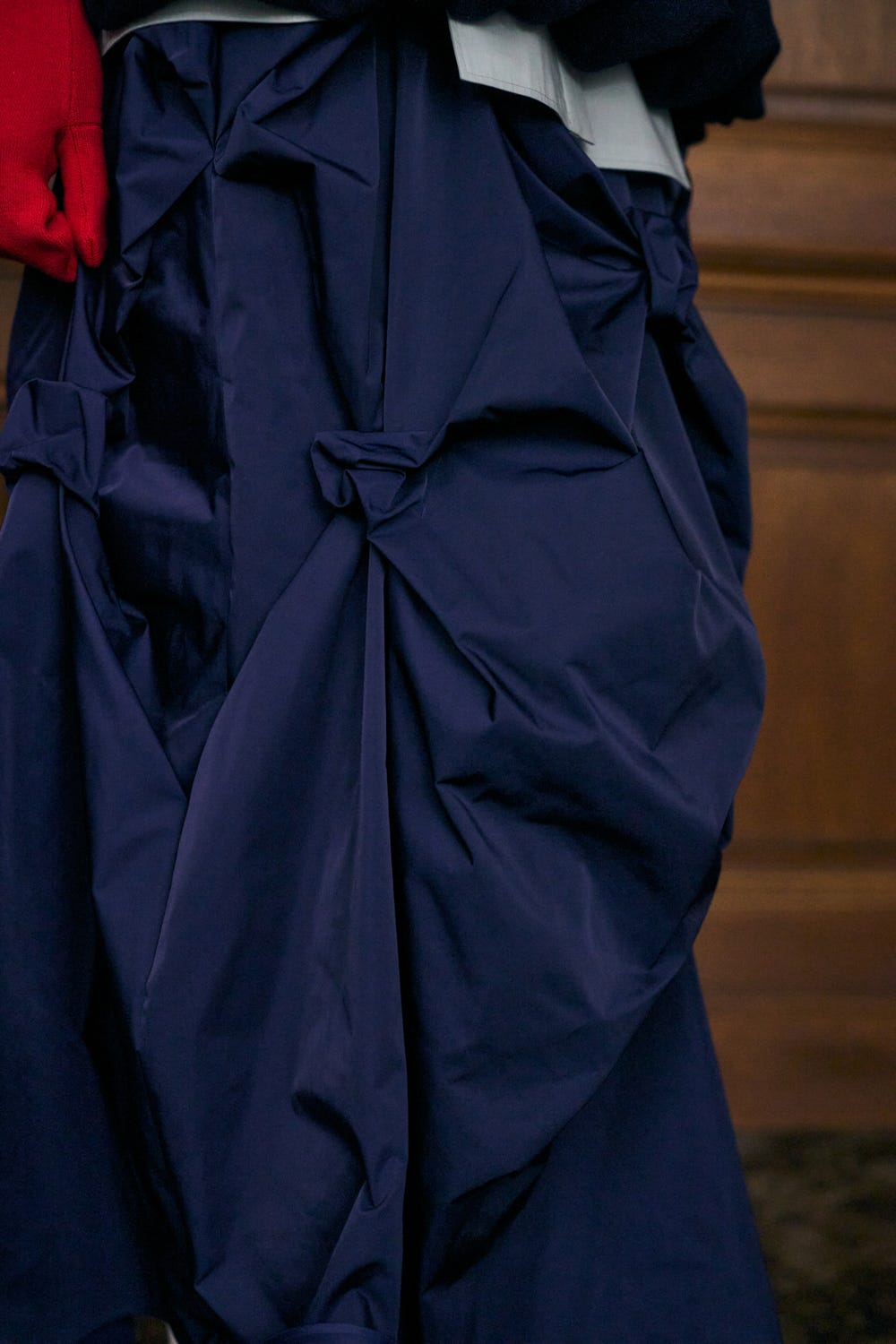 ランダムにタックを取った凹凸した表面感で、陰影のあるボリュームスカート。