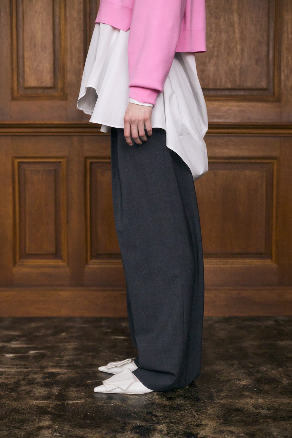 ウエストは圧のないベルトレスタイプですっきりして履ける上にフロントタックや重なったディティールは目くらまし効果でおなかまわりを上手にカバーしてくれます。