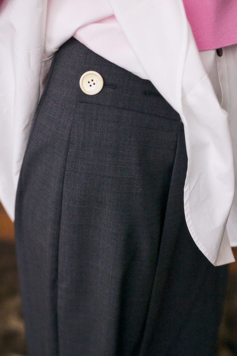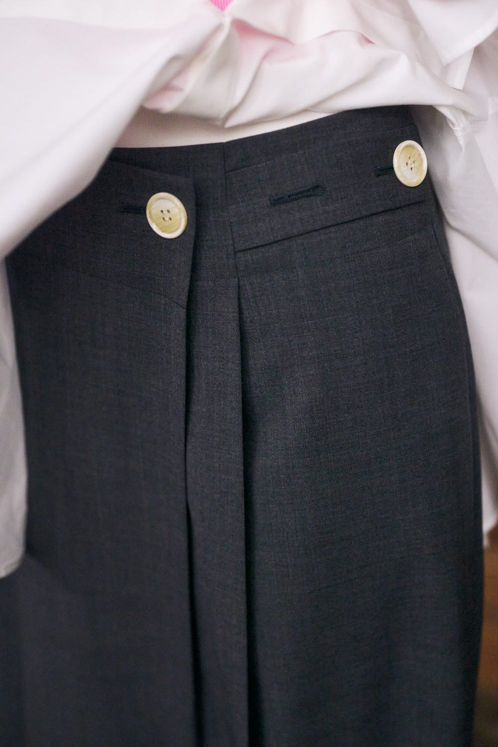 ウエストにアジャストベルトが付いていてシルエットとサイズに変化をつけられるトラウザー。