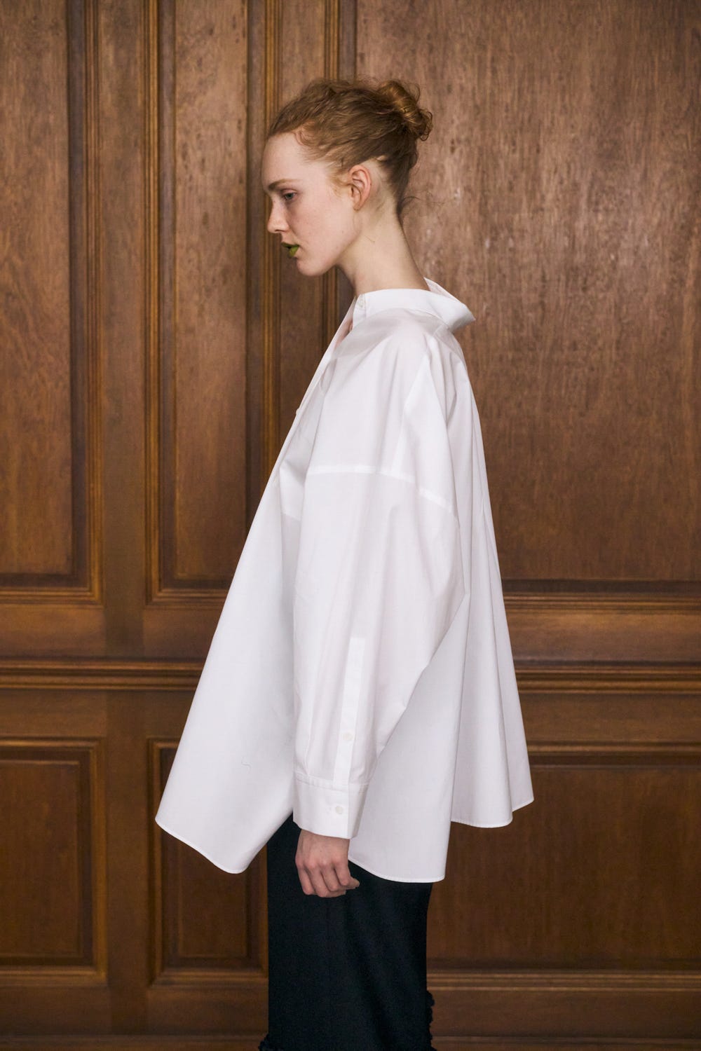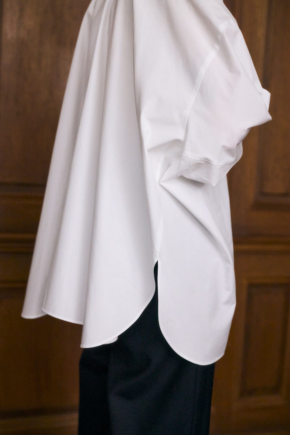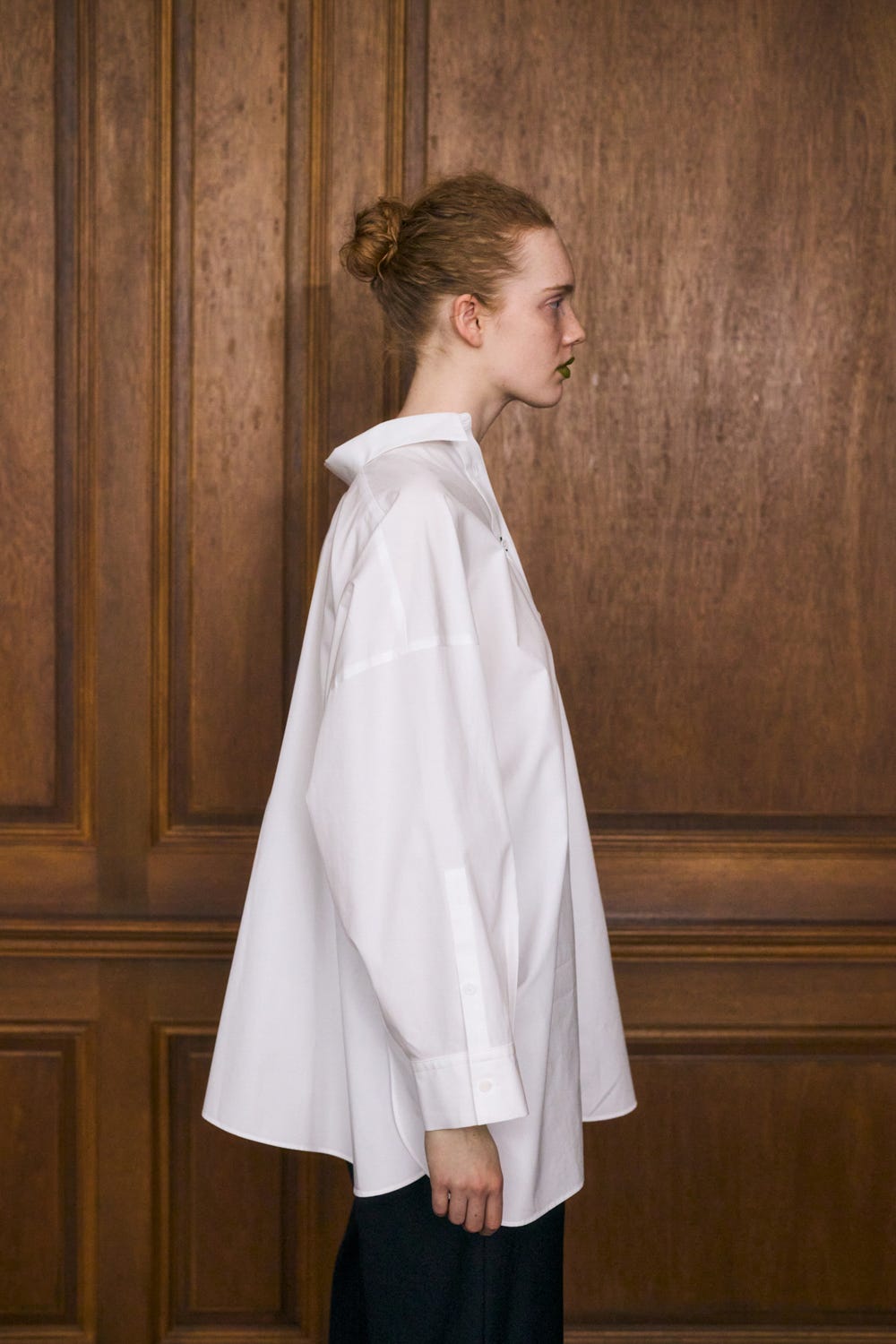 着物の抜き衿をイメージした”うなじ”を見せる、首を後ろに抜いて着るタイプのユニークなパターンで作られたBIGシルエットシャツ。