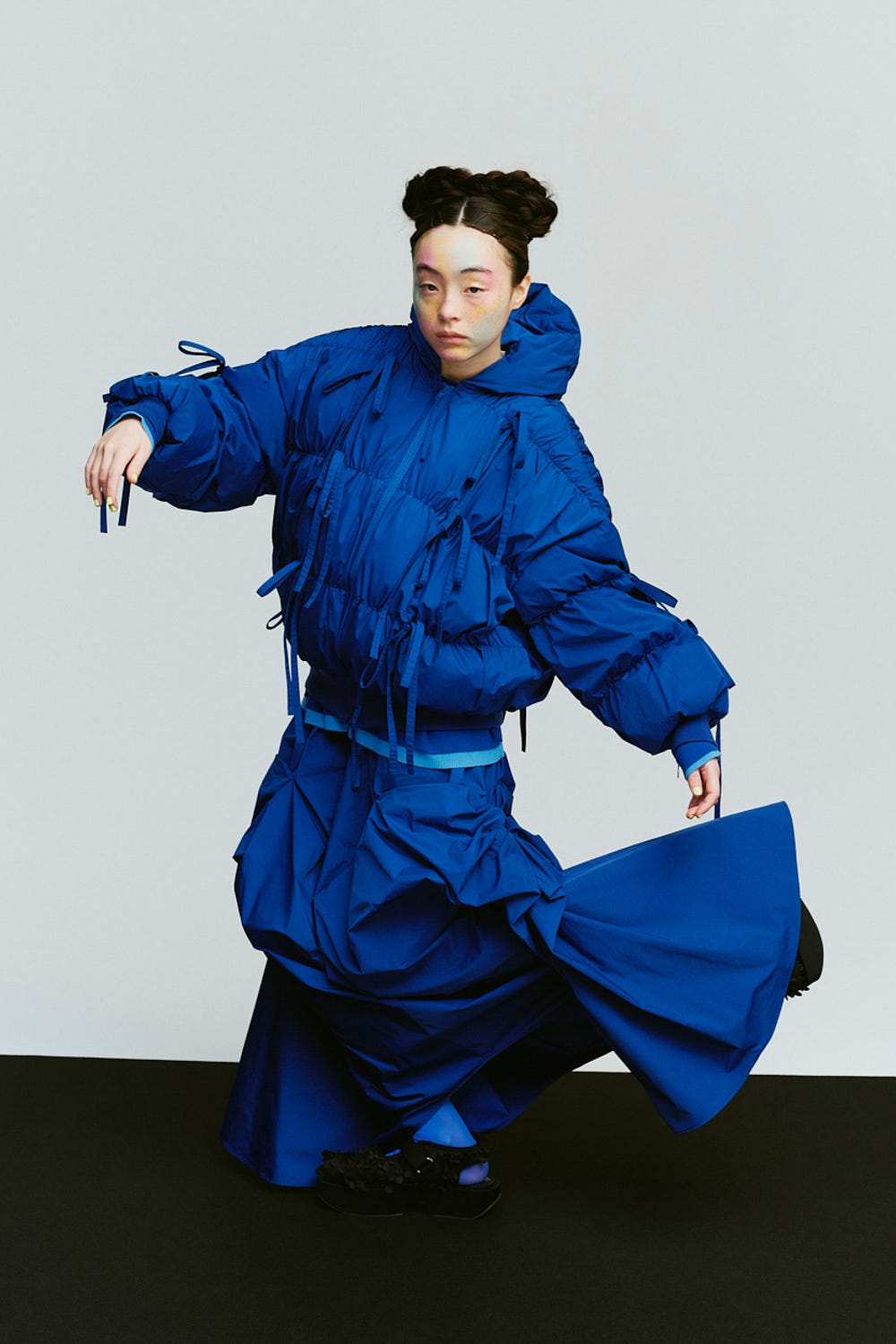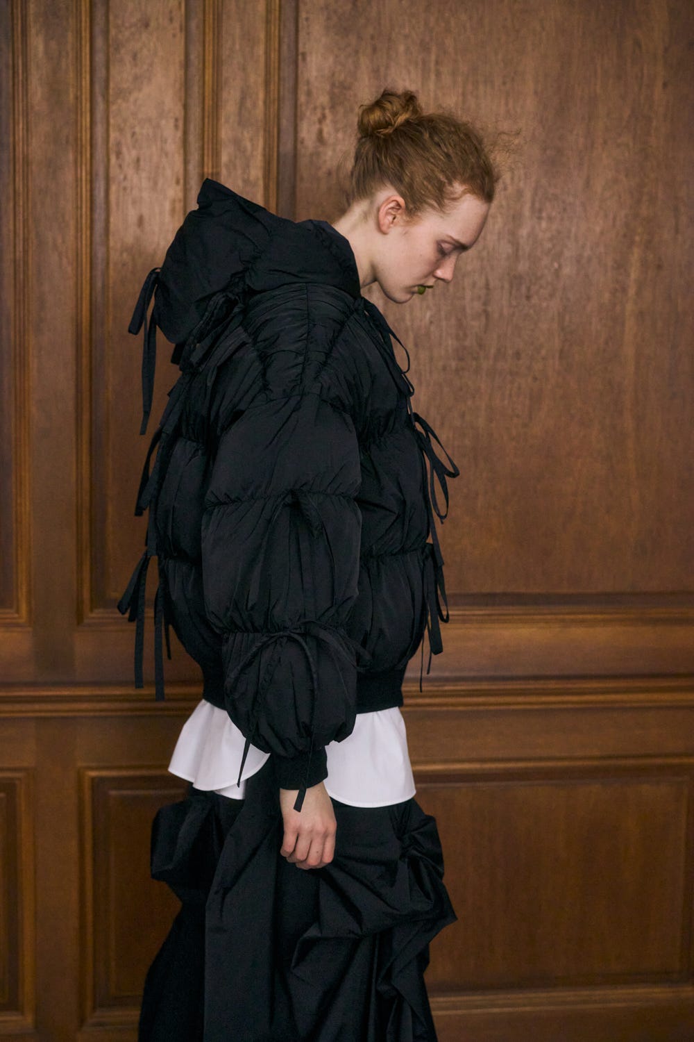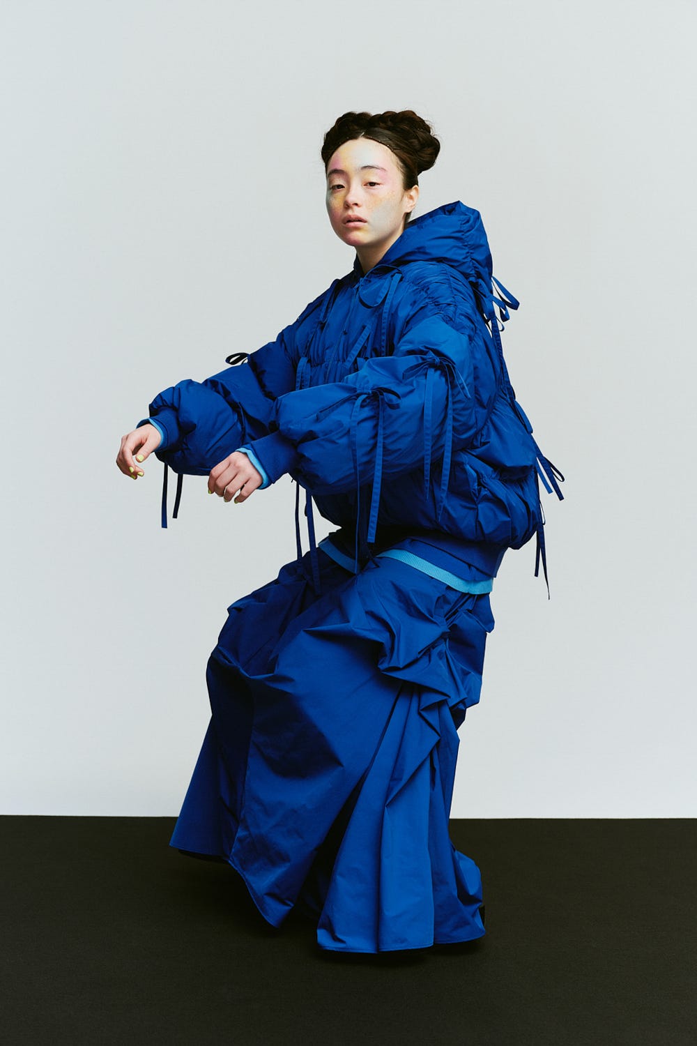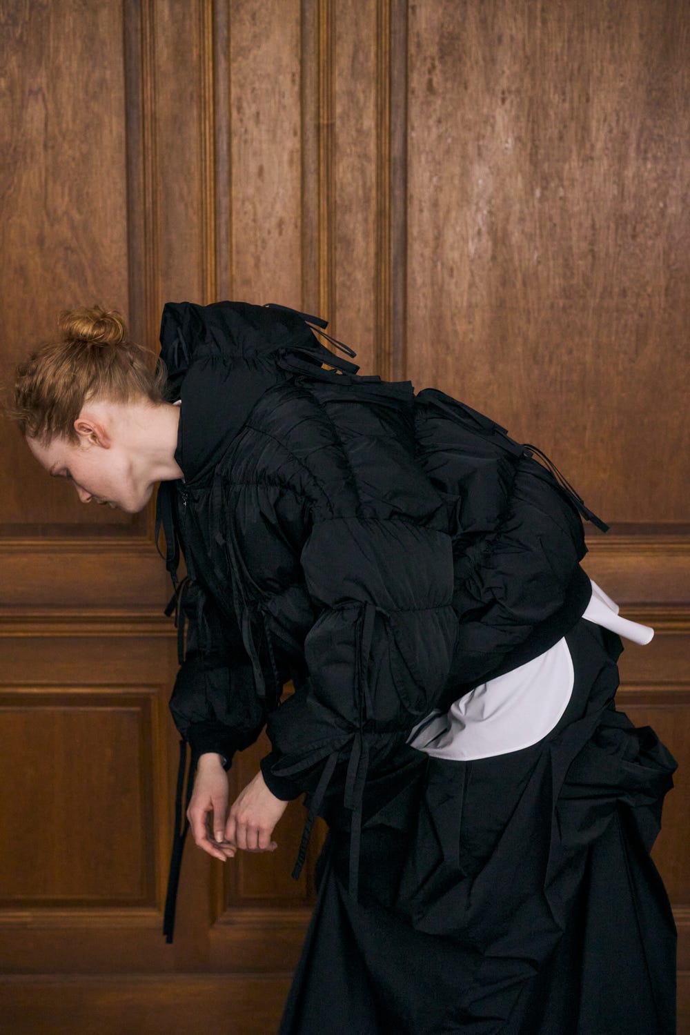 リボンが付いた椅子のクッションをイメージしたダウンジャケット。