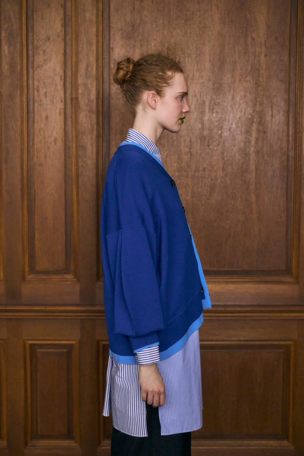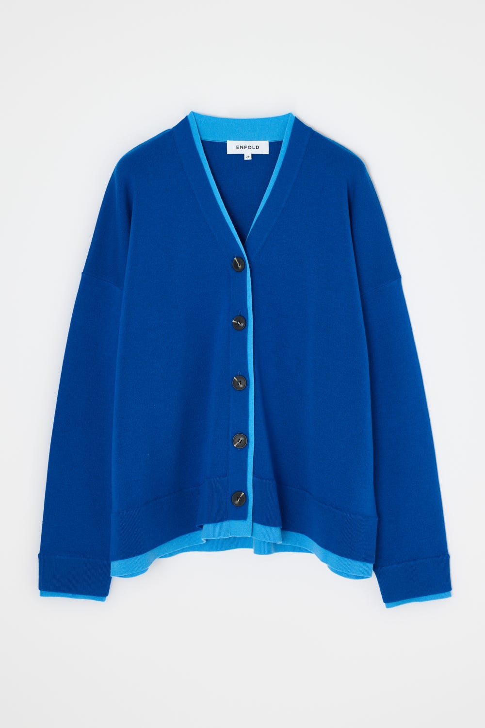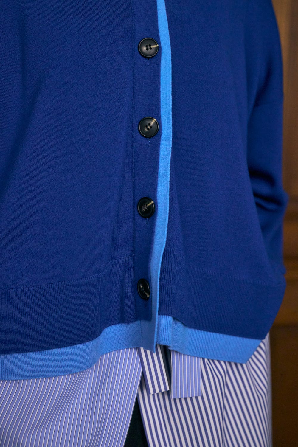あたかもカーディガンを2枚重ね着しているかのようなありそうでなかった配色ディティールがスタイリングにさりげなく彩りをプラスしてくれます。