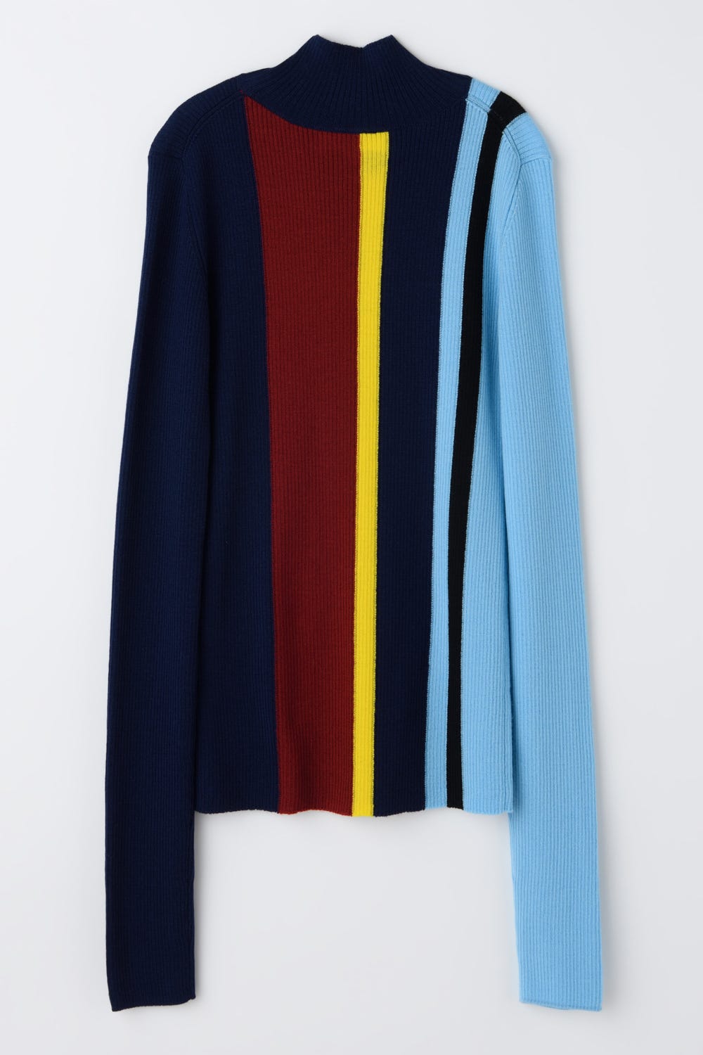1枚着としてもインナー使いとしてもこの時期に使えるコンパクトなリブハイネックニットに配色ストライプVerが登場。