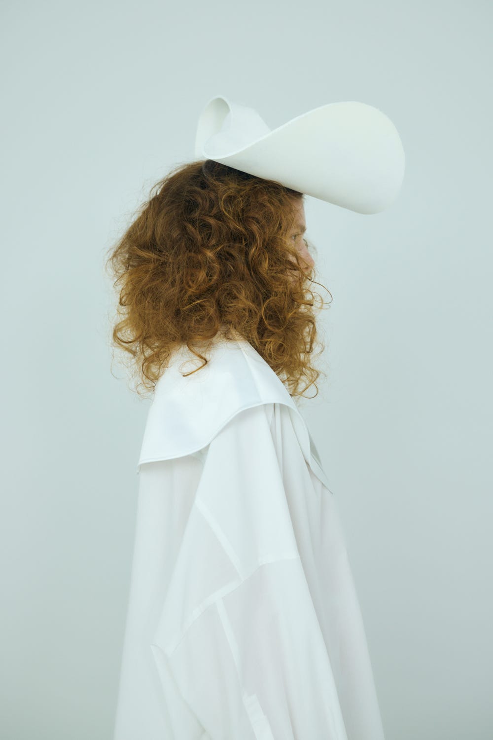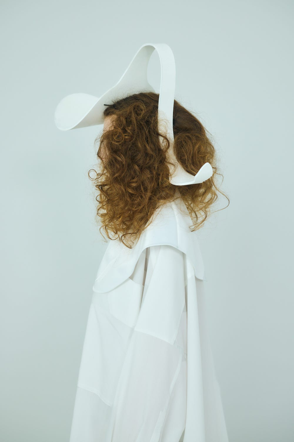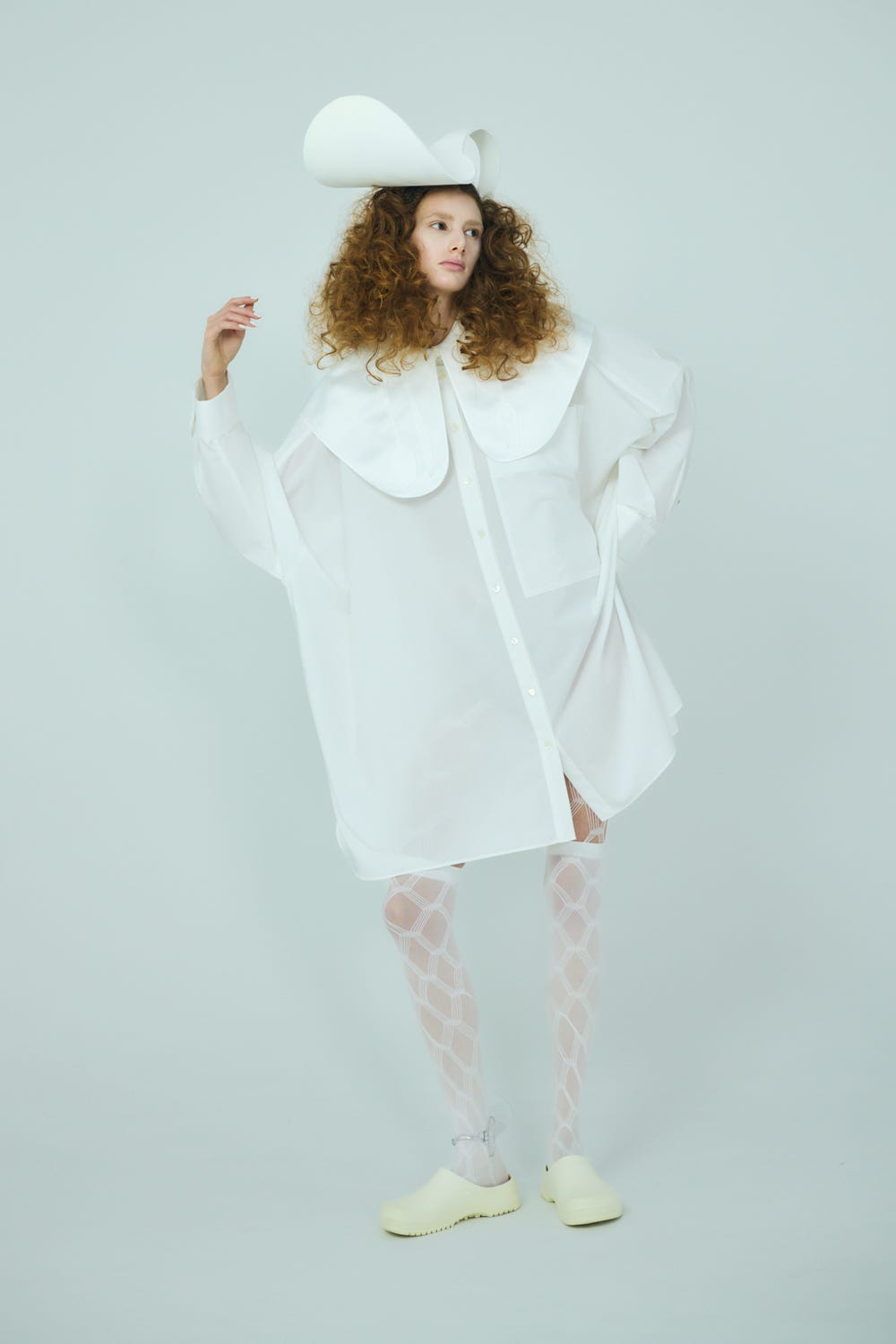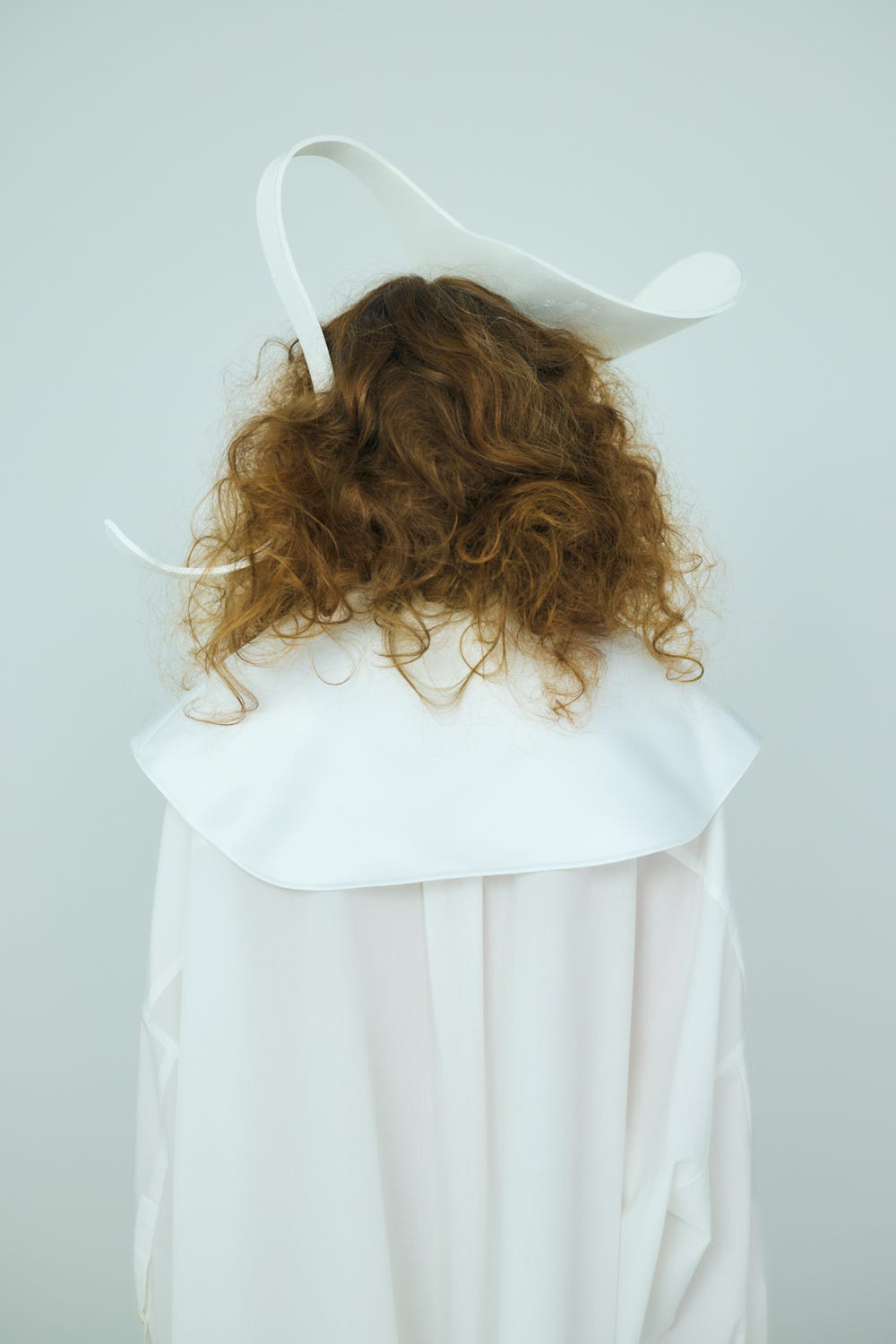 様々なかたちのお皿、サークル型、トライアングル型、正方形型、それぞれが違った表情をみせるドレープパーツとなり、個性的なシルエットを演出します。