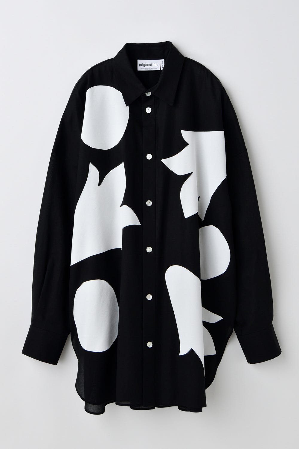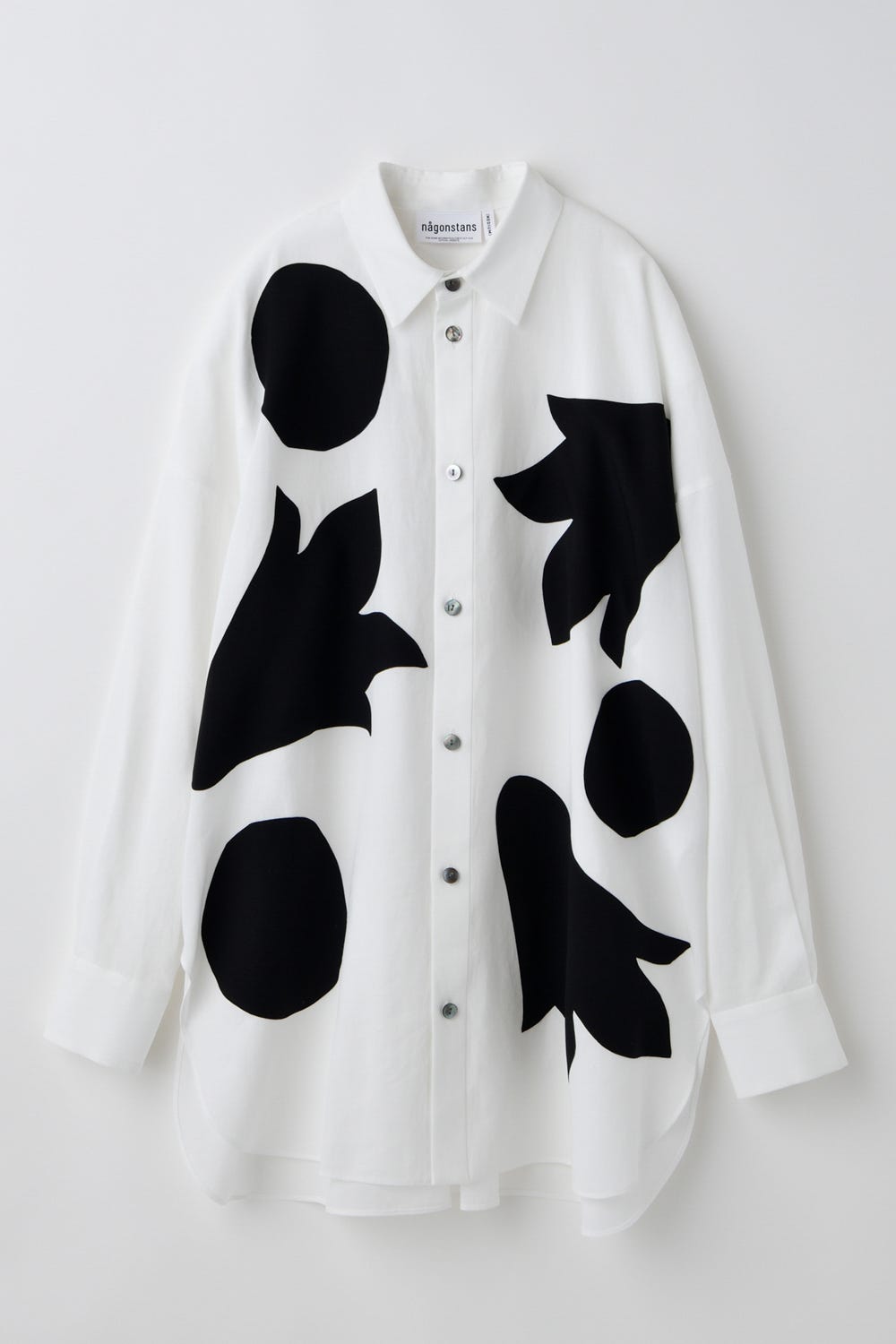 高山植物「イワギキョウ」の形を抽象化して、切り絵風に身頃にあしらったデザインシャツ。