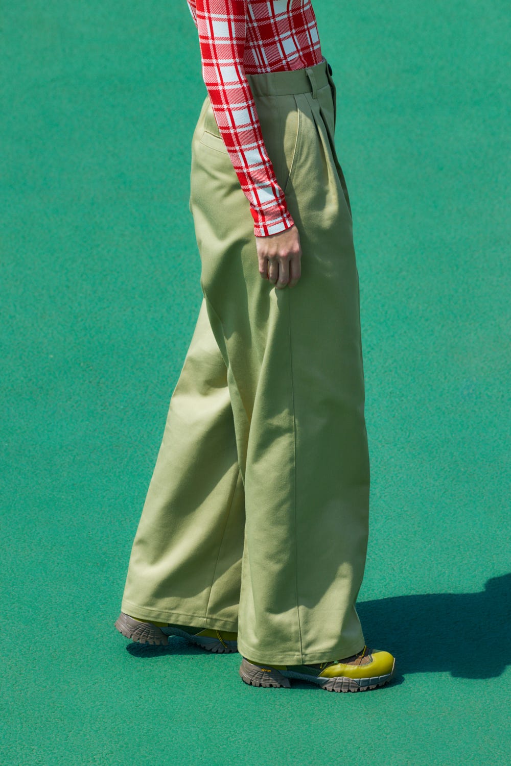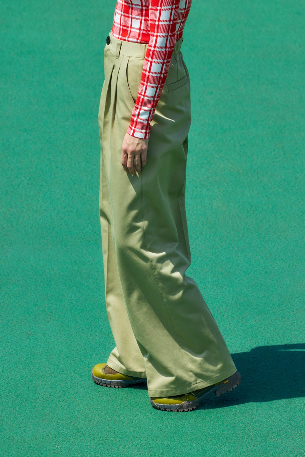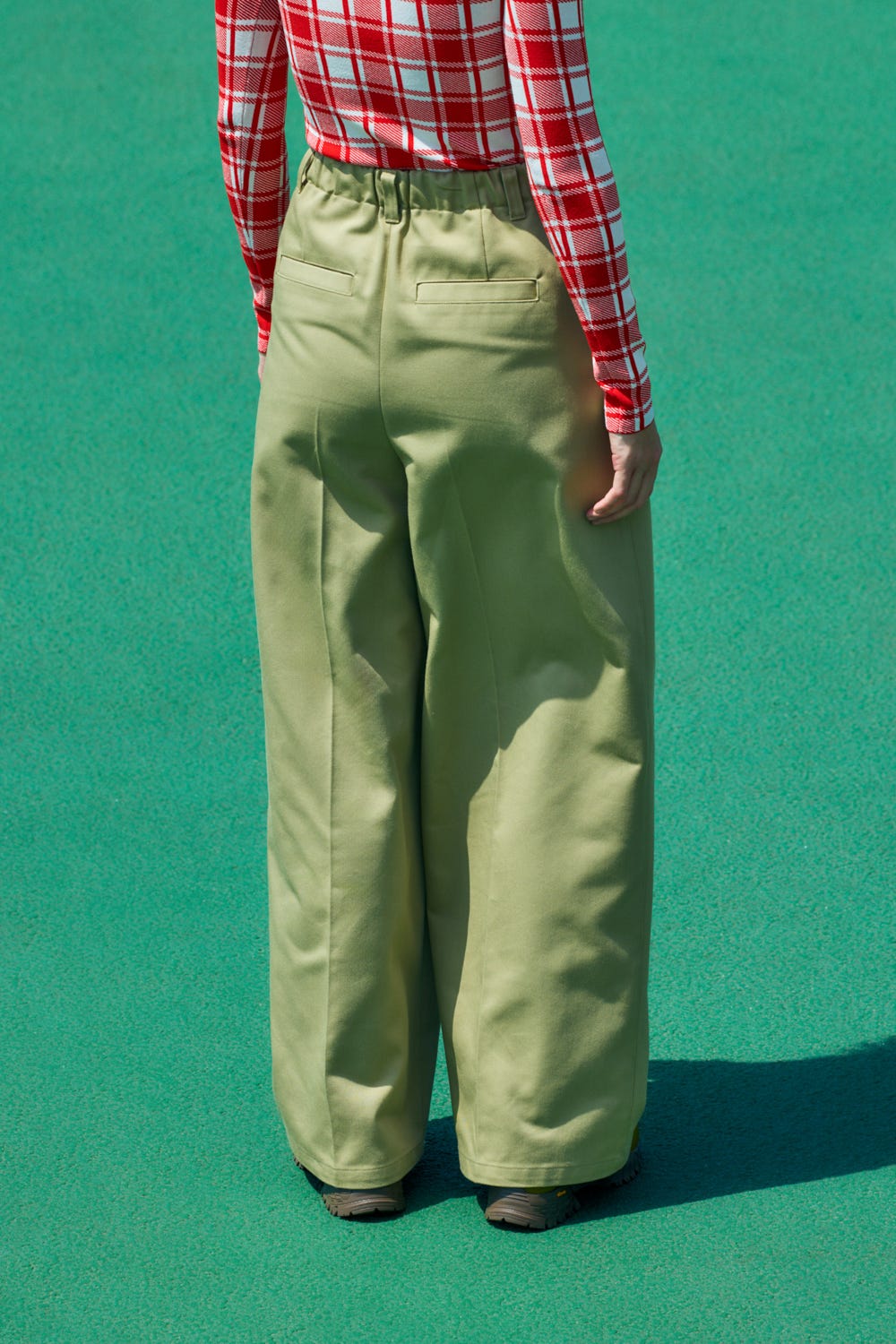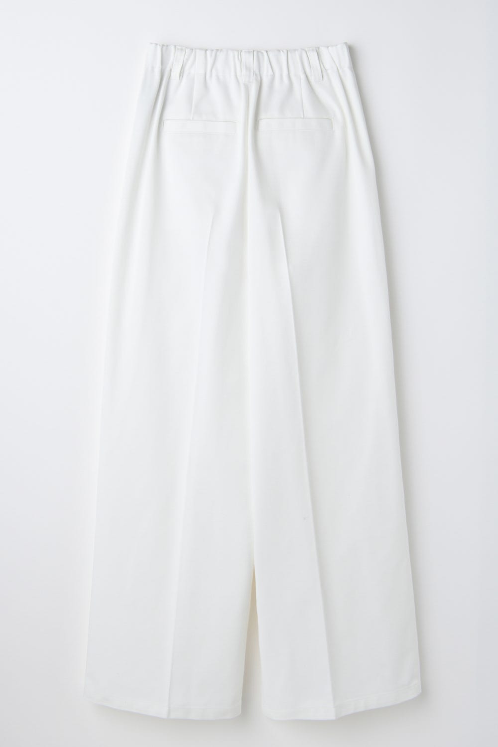 前後にセンタープレスを入れることで太めのストレートシルエットでもすっきりとした印象のパンツアイテム。