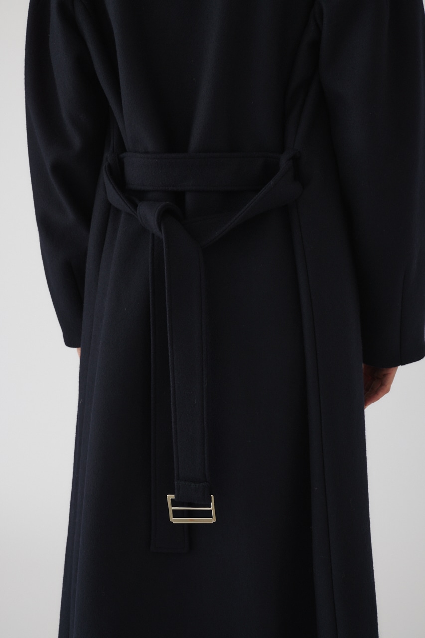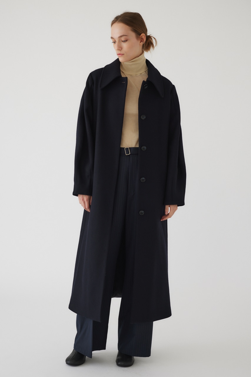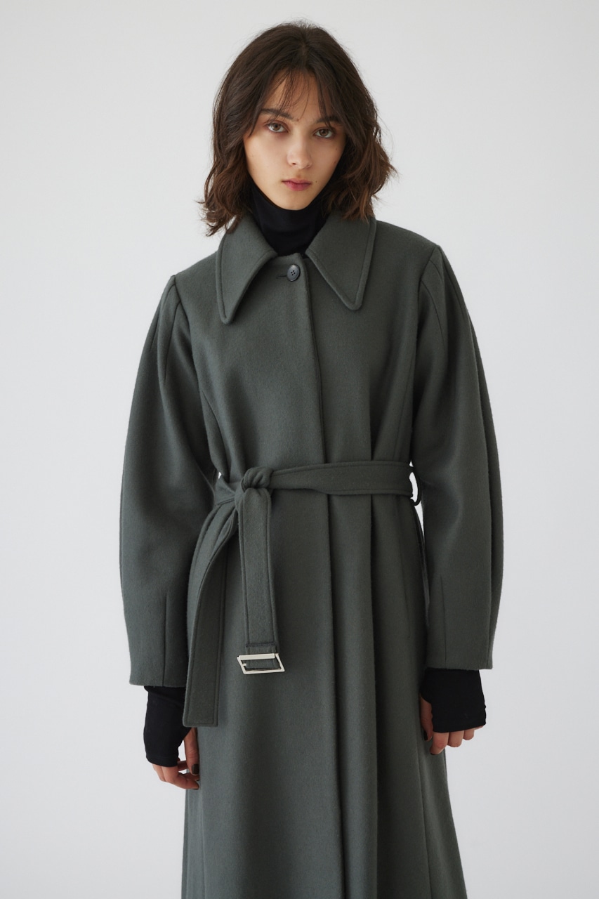 世界三大毛織物産地の尾州にて生産された、ハードプレス加工を施したことによるハリ感と程よい光沢感が特徴の生地を使用したStand collar melton CT。今季のコートのラインナップの中でも、たっぷりとしたロング丈が大人な印象の、特にRIM.ARKらしいモードなウールコートに仕上げました。袖のカーブラインは、メルトンが作り出すきれいなシルエットと立体感を活かしたデザイン。裏地付きで両サイドにスリットを入れることで、足運びの良さと歩いた際の表情まで考えられた一枚。ベルトを使用することでシルエットの変化も楽しむことができる、しなやかな肌触りとウール本来の良さを感じさせるアイテムです。