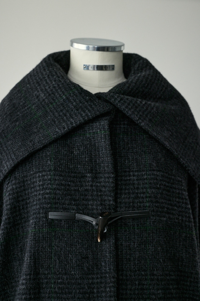 小顔効果も期待できるモードな印象の大きな襟と水牛トグルがアクセントになった、他にない都会的なデザイン性が魅力のコートです。使用したのはオリジナルで制作したグレンチェック柄のウール生地。RIM.ARKのシンボリックカラーである、深いグリーンのラインをチェック柄に取り入れました。ややオーバーサイズで贅沢な分量感が目を惹くルックスに反し、軽量で柔かな風合いの生地を使用しているため着心地も快適です。
