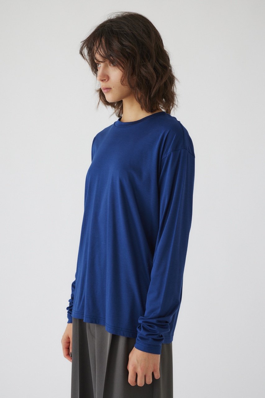 独特の滑らかな質感を持った高級超長綿ギザとリヨセルを混紡することで実現した、しっとりとした風合いと柔らかな肌触りが快適なスムースを使用。程良い光沢と艶が美しく一枚でサマになるのはもちろん、袖を長めに設定し、ニットやスウェットとレイヤードしてもこなれたスタイルが完成するように製作しています。