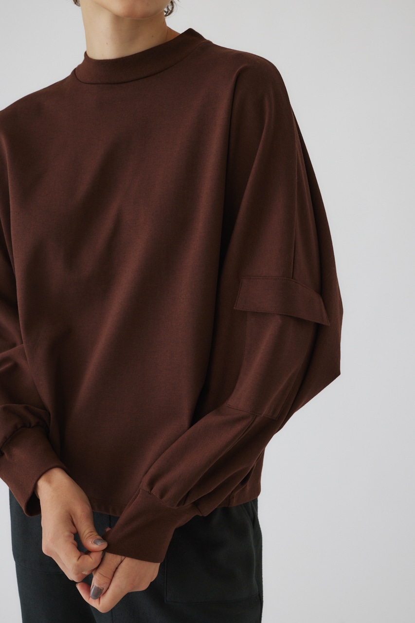ポリエステル・コットンの天竺編みカットソー生地を使用した、ミドルネックのロングTシャツ。ゆとりのある身頃にドルマンスリーブ、袖のフラップ付きポケットがデザインポイントになったカットソーは、着心地もさることながらシンプルすぎず、コーディネートのバランスも取りやすい1枚。シルエットがモダンで、こなれた雰囲気を演出します。