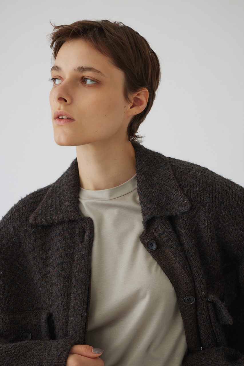 ウール混のざっくりローゲージな表情のある編み地で製作したニットブルゾン。コートまで行かない中間の季節に活躍するカーディガンのようなブルゾンは、外でも室内でも羽織れて秋冬らしい暖かみのあるアイテム。オーバーサイズでメンズライクなルックスに振り切ったモダンなデザインだからこそ、かえって女性のカッコ良さが際立ち、大人カジュアルを格上げする1着です。