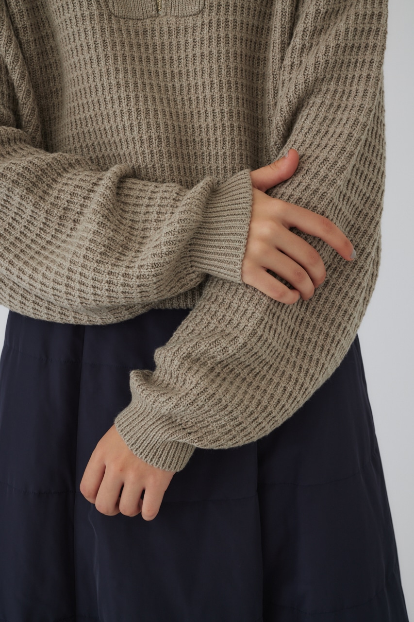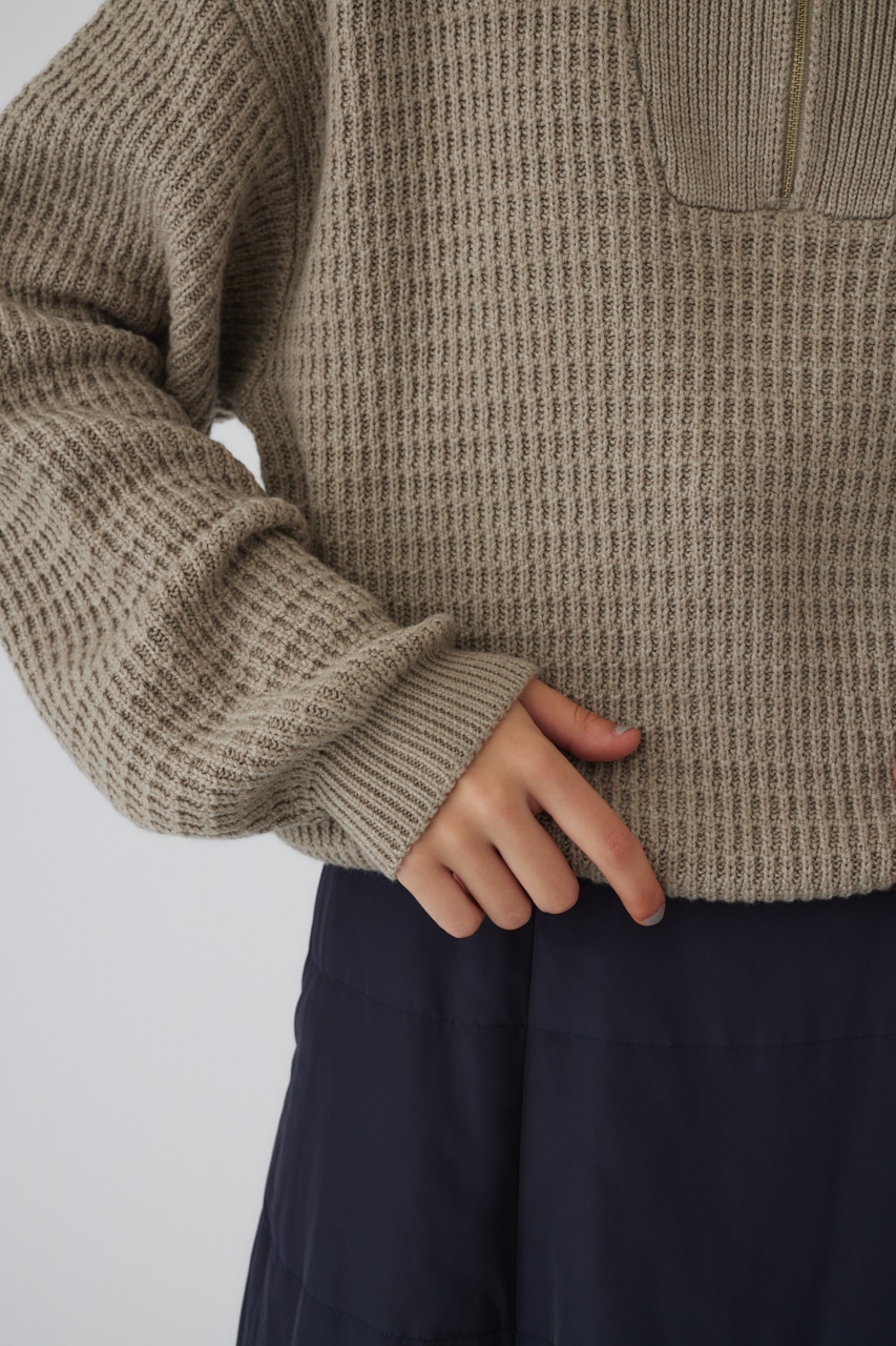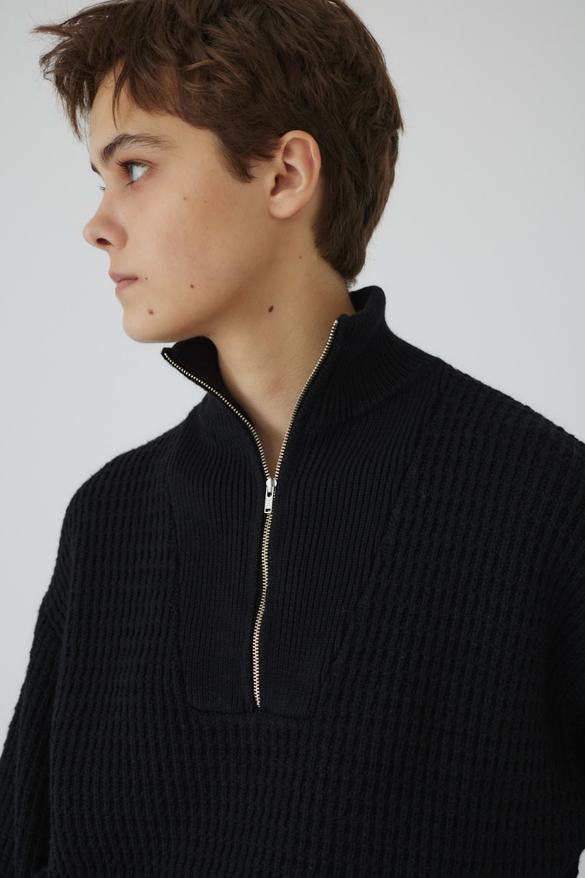 ウール混の糸をタック編みで編み上げた、メンズライクなルックスのジップアップニット。ややオーバーサイズでゆったり柔らかな着心地、バランスの取りやすいサイズ感にこだわり、着るだけでどこか雰囲気のある1着に仕上がりました。ハイネックのジップディティールはアウターの中から覗いてもさりげないポイントになり、暖かみのある厚みが寒い季節に重宝する1着です。