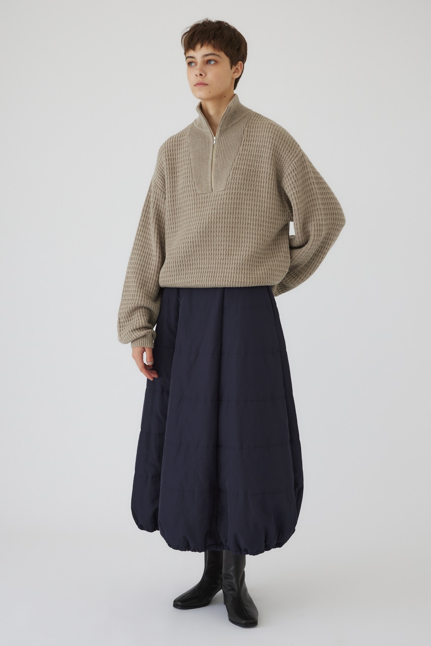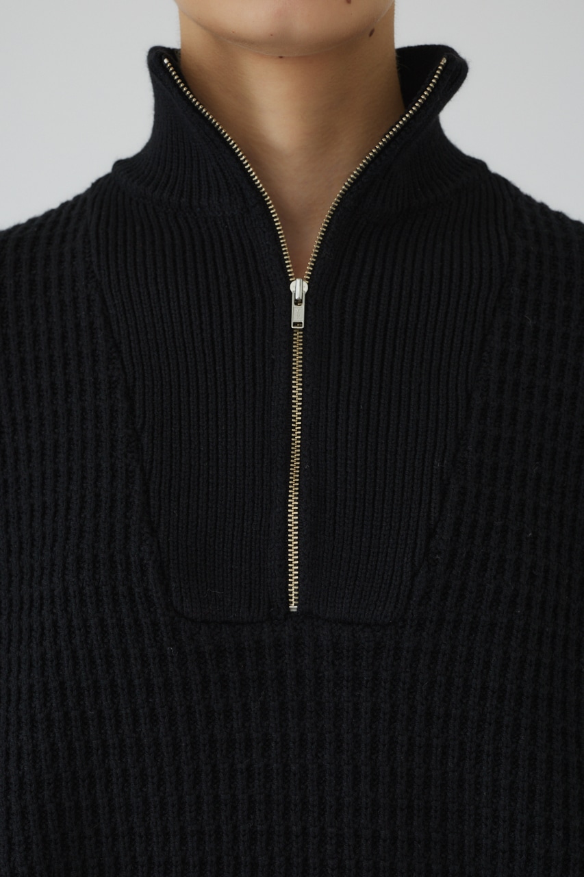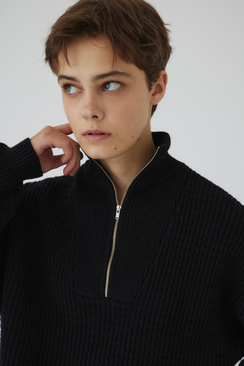 ウール混の糸をタック編みで編み上げた、メンズライクなルックスのジップアップニット。ややオーバーサイズでゆったり柔らかな着心地、バランスの取りやすいサイズ感にこだわり、着るだけでどこか雰囲気のある1着に仕上がりました。ハイネックのジップディティールはアウターの中から覗いてもさりげないポイントになり、暖かみのある厚みが寒い季節に重宝する1着です。