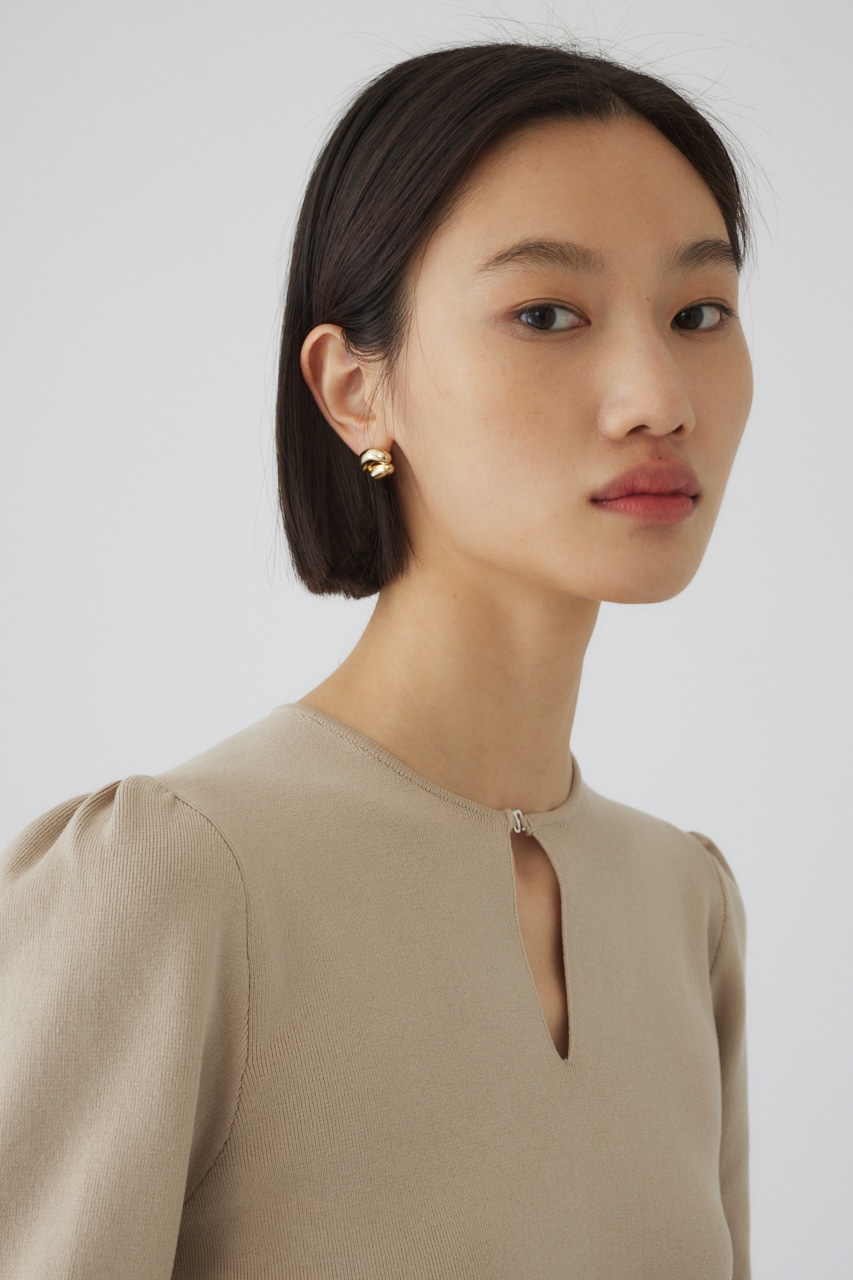 ビーンズのフォルムから着想を得て作成したピアス。ぷっくりとした丸みと曲線が女性らしさを感じる雰囲気で、RIM.ARKを纏うシックな女性を引き立てるアイテムです。