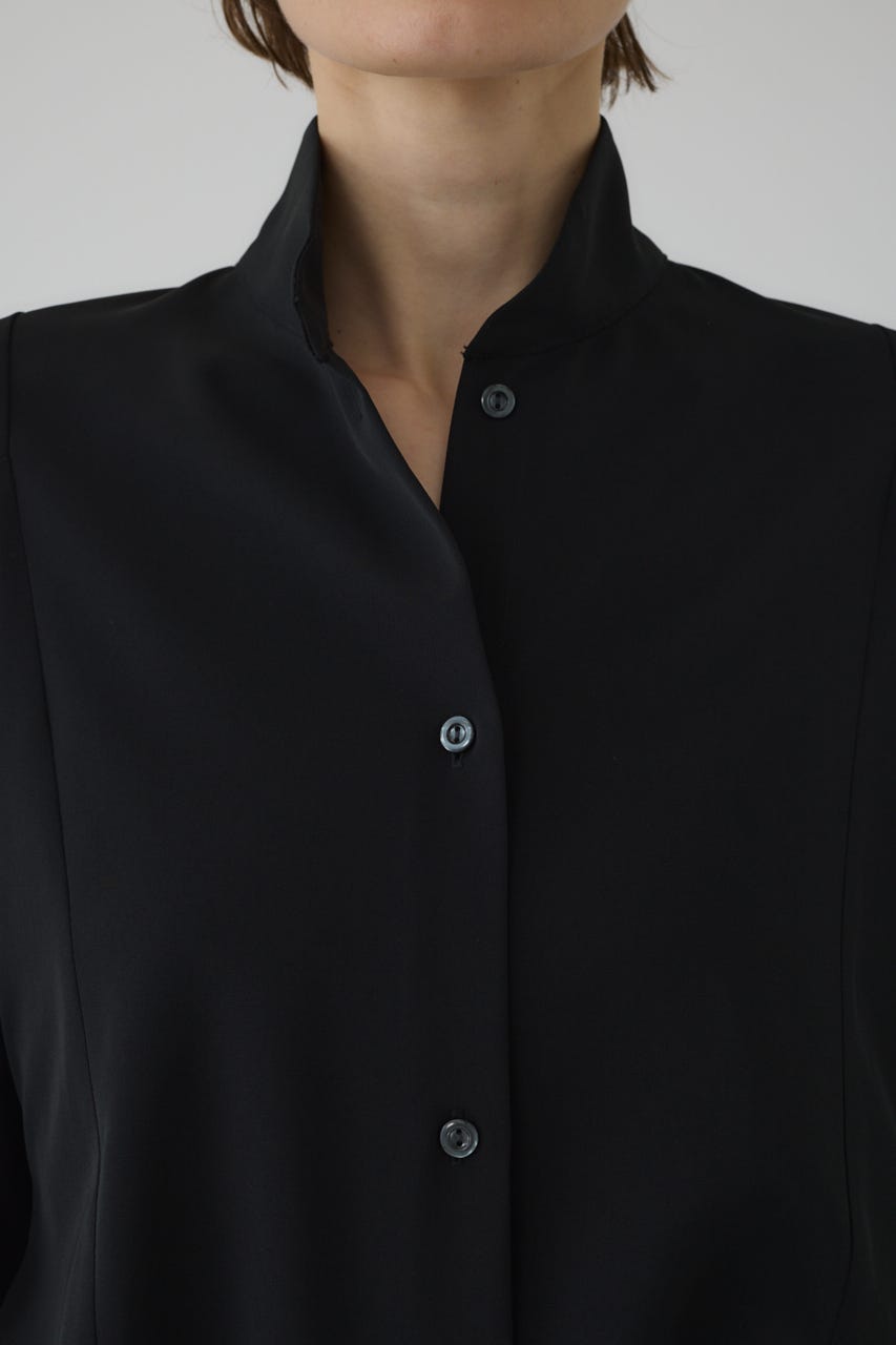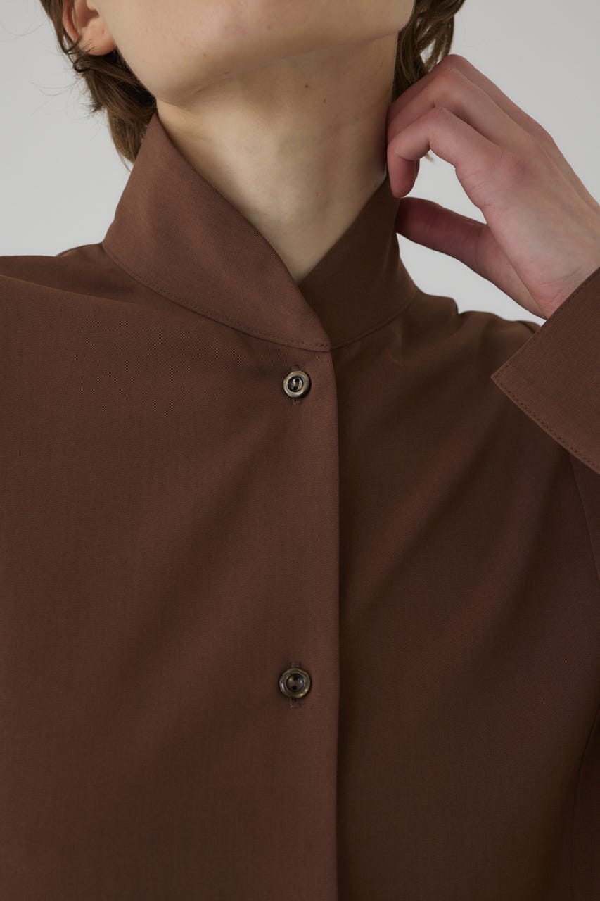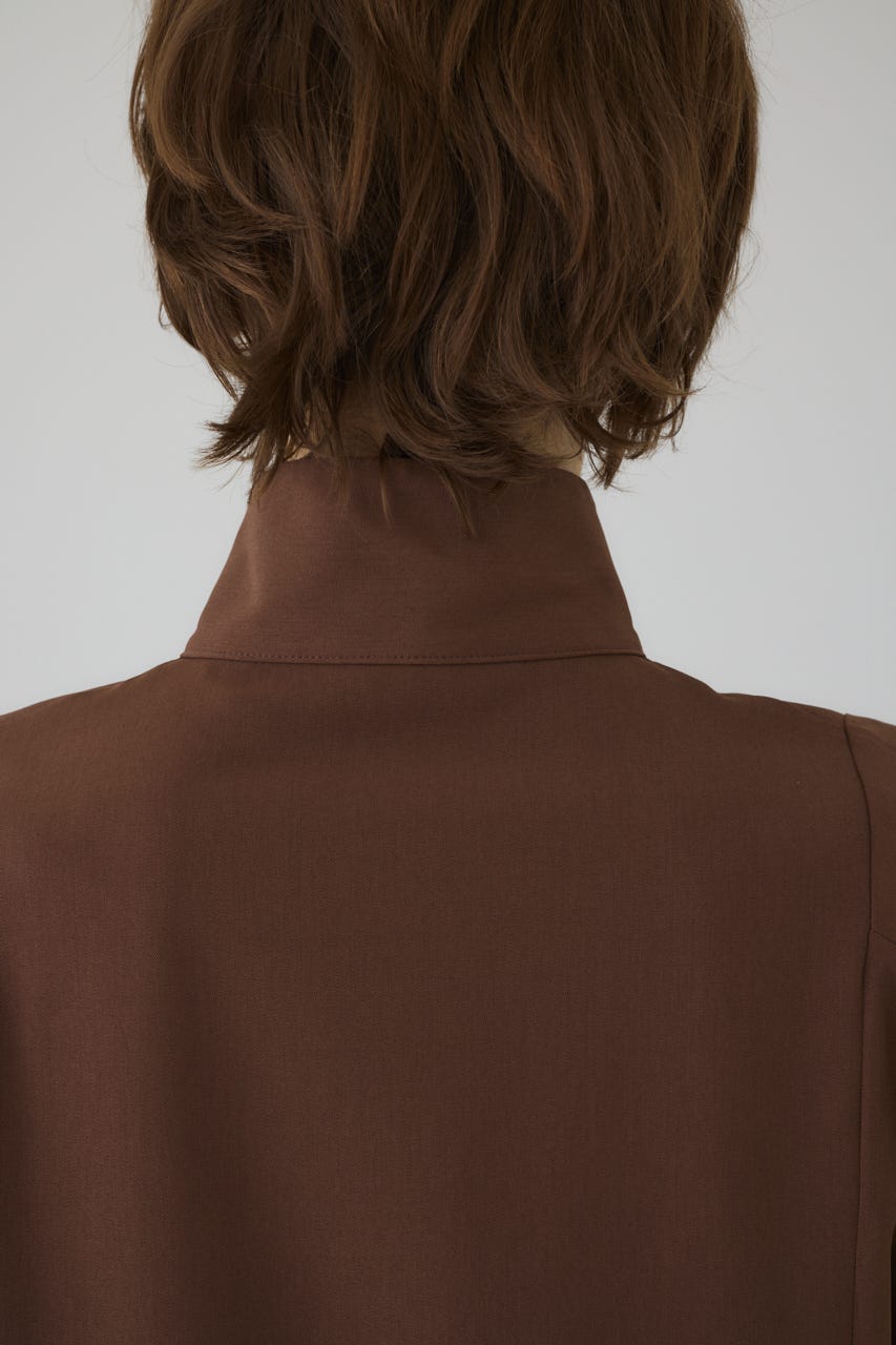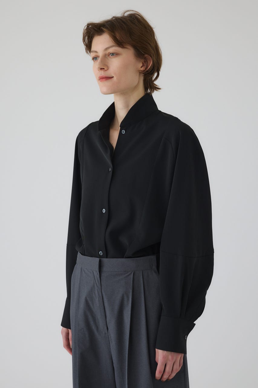 ■POINT:細番手の糸を特殊な撚糸機で撚糸し、滑らかな質感と美しい光沢感を出した生地を使用したスタンドカラーブラウス。