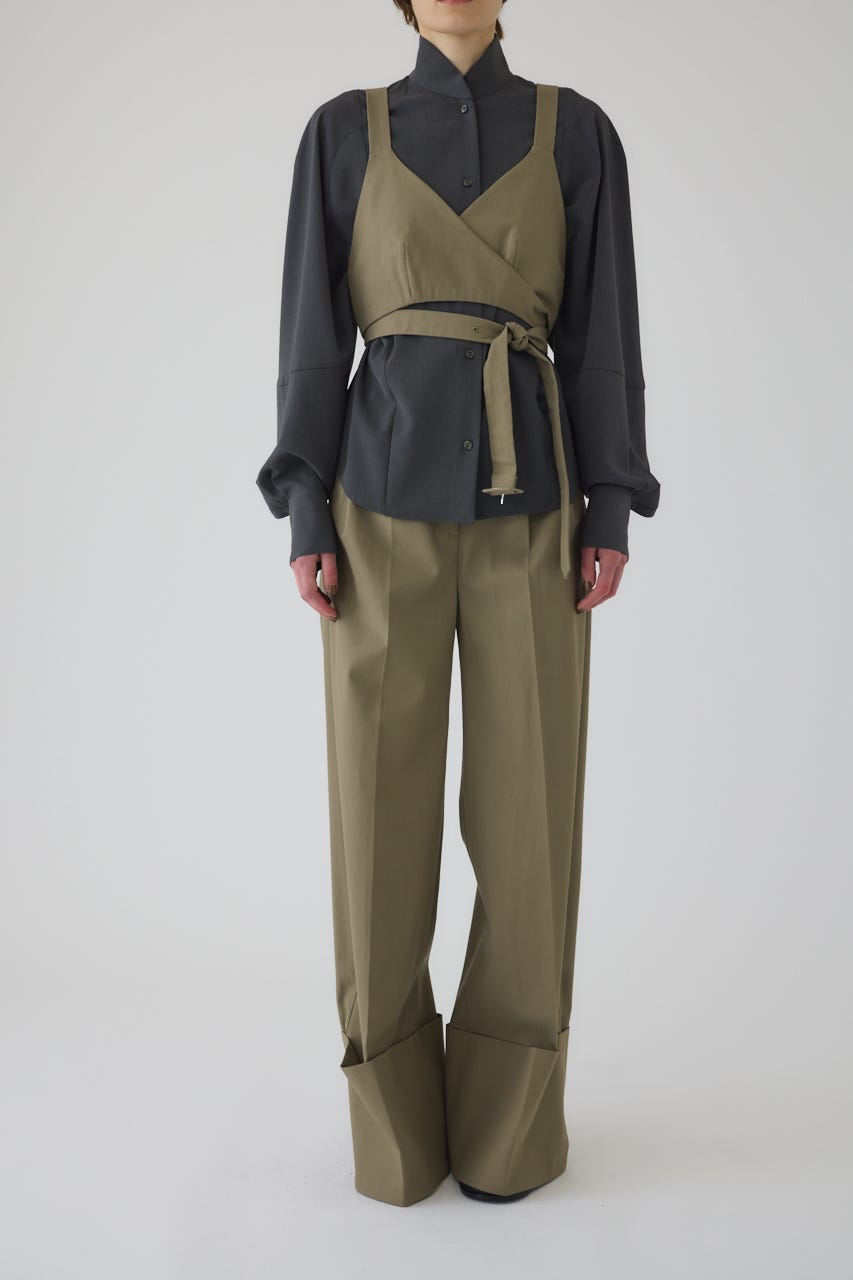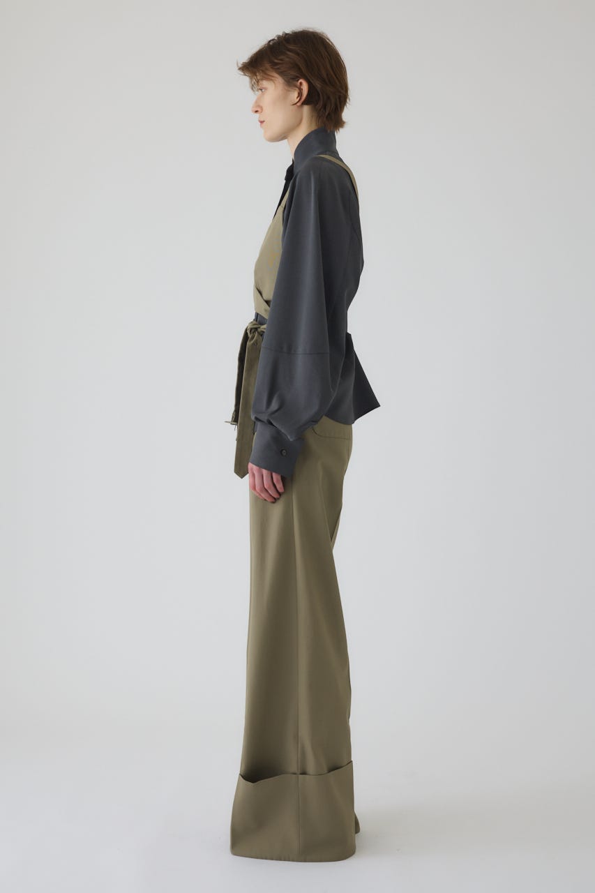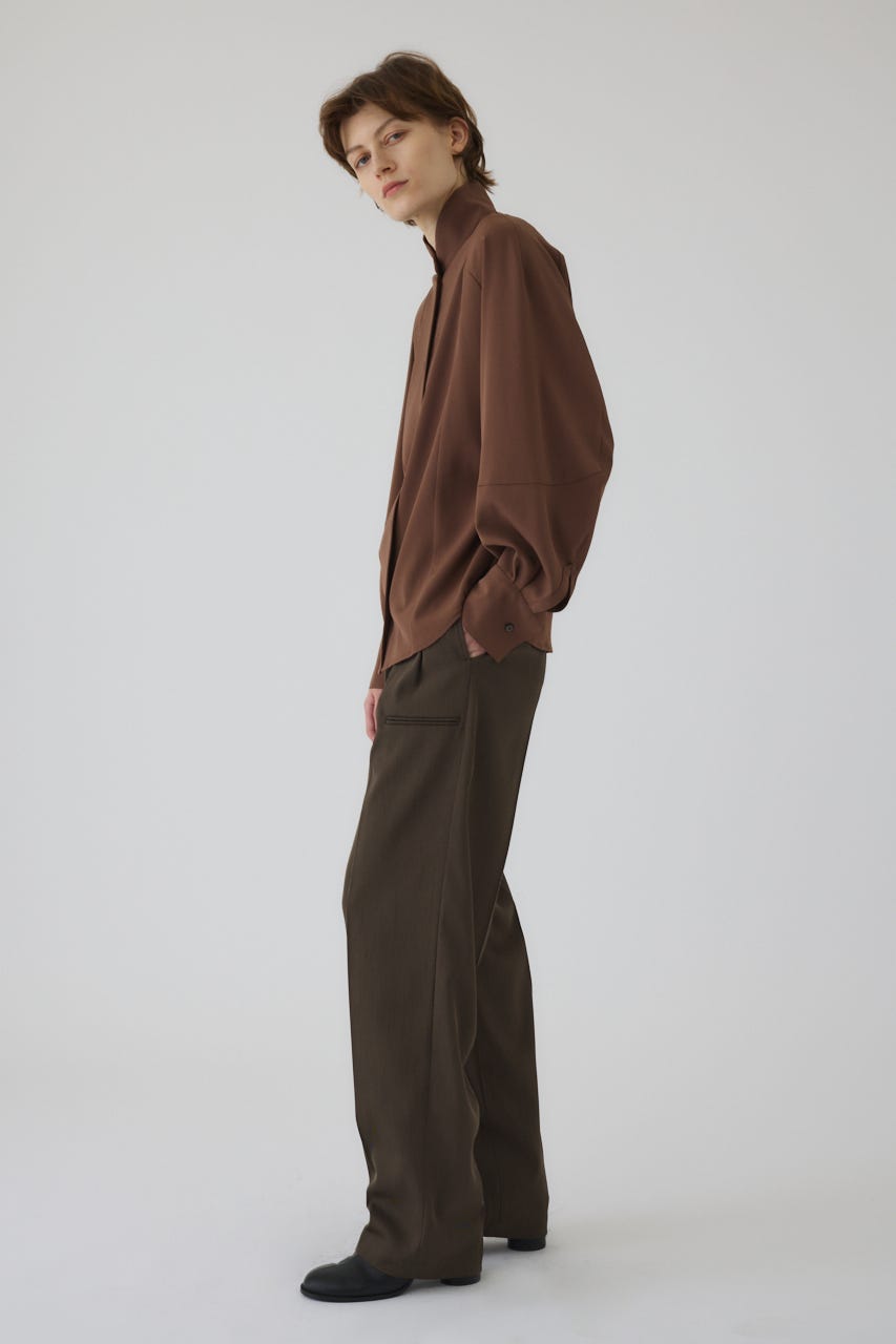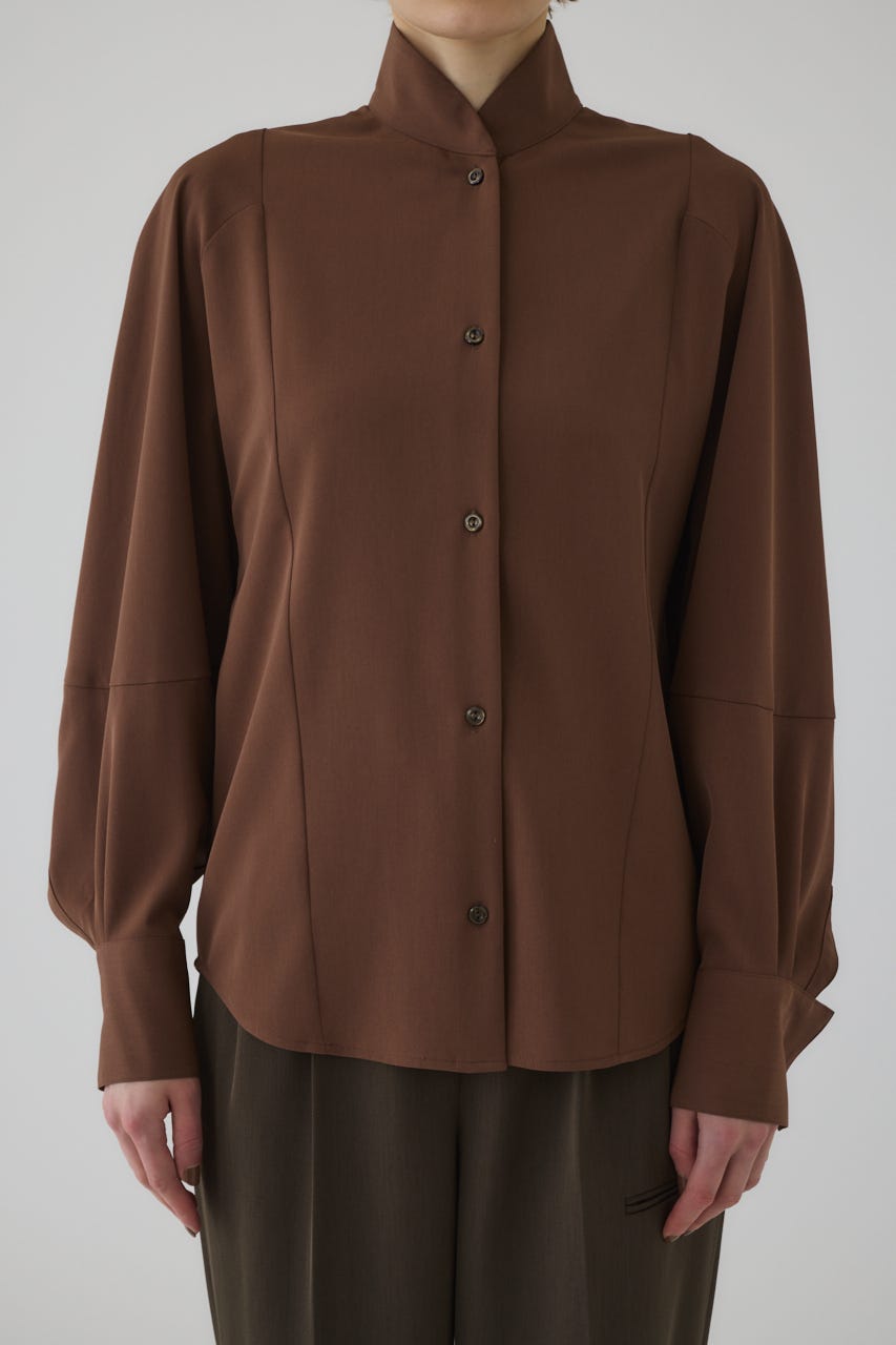 ■POINT:細番手の糸を特殊な撚糸機で撚糸し、滑らかな質感と美しい光沢感を出した生地を使用したスタンドカラーブラウス。