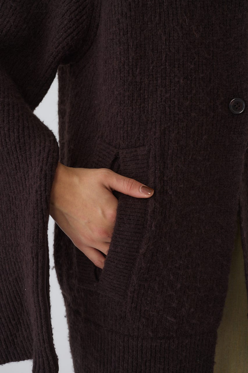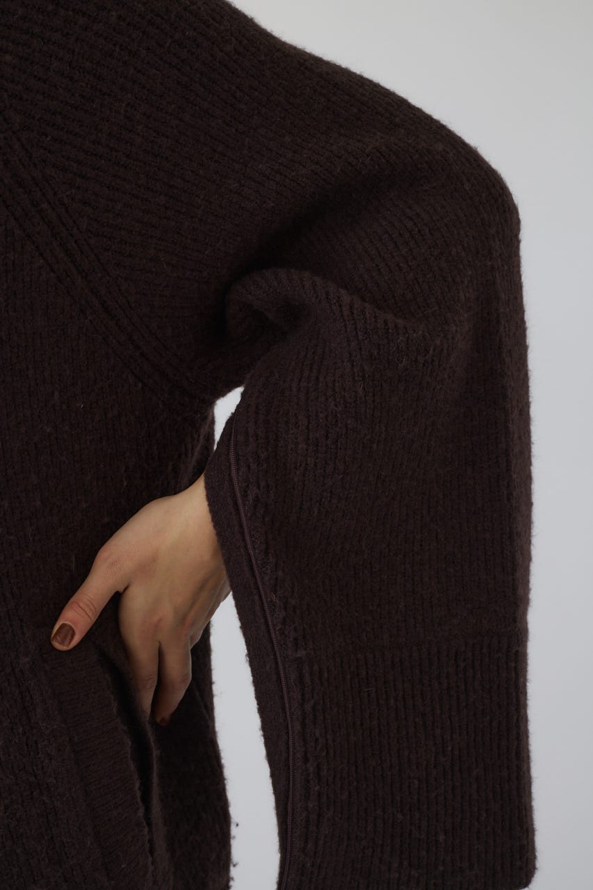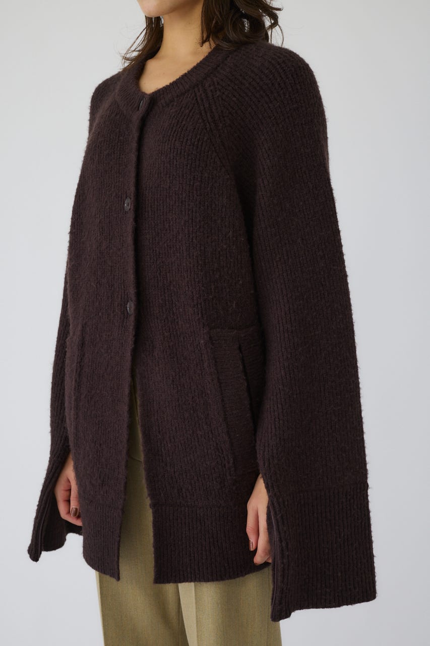 ■POINT:袖口のコンシールファスナーを開けるとポンチョのような新鮮なルックスに変化するニットカーディガン。