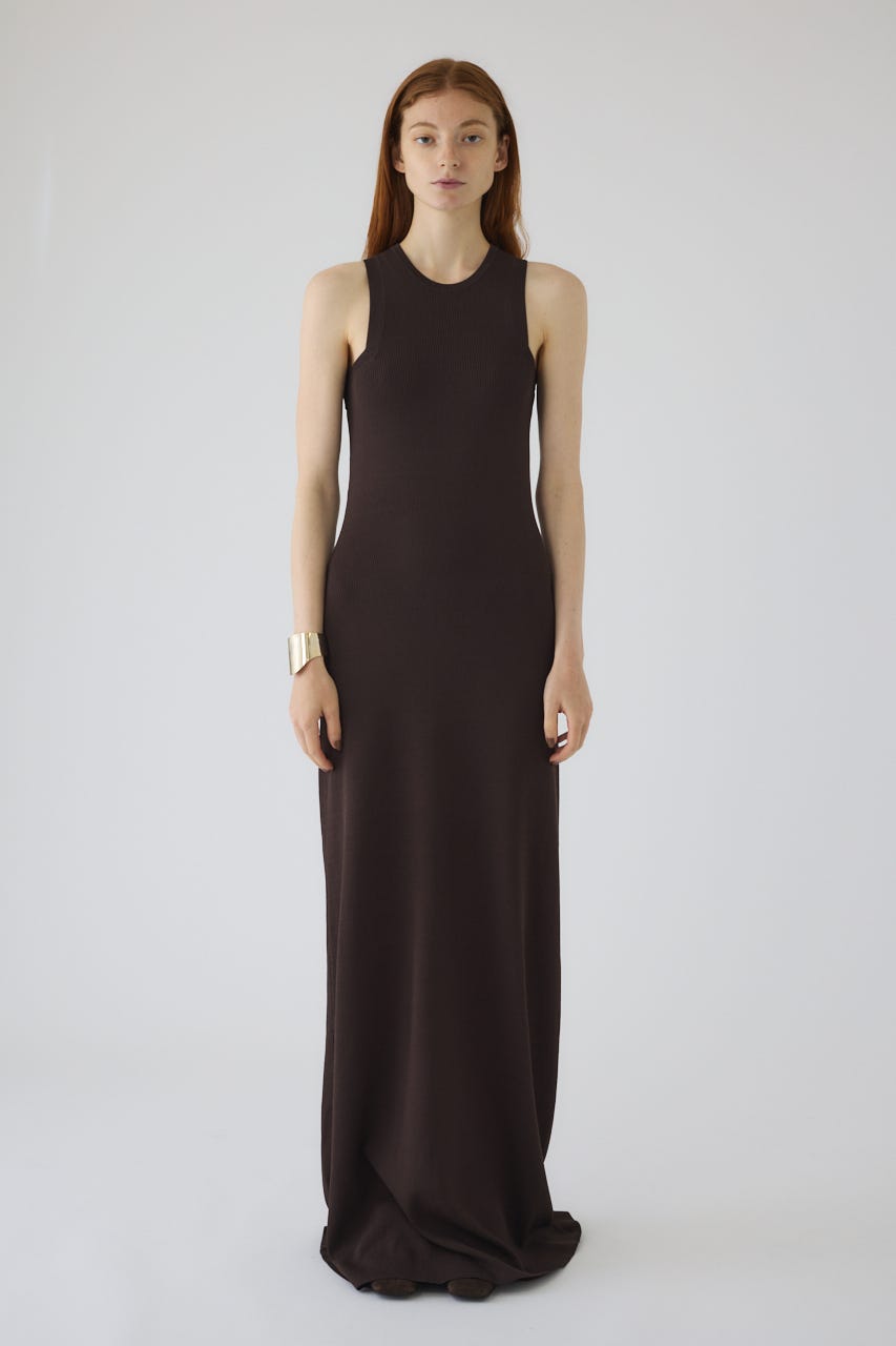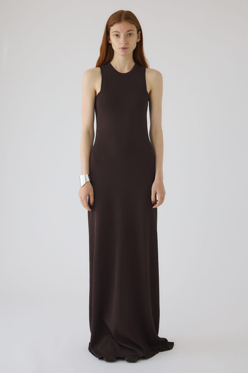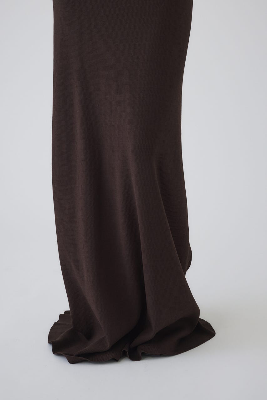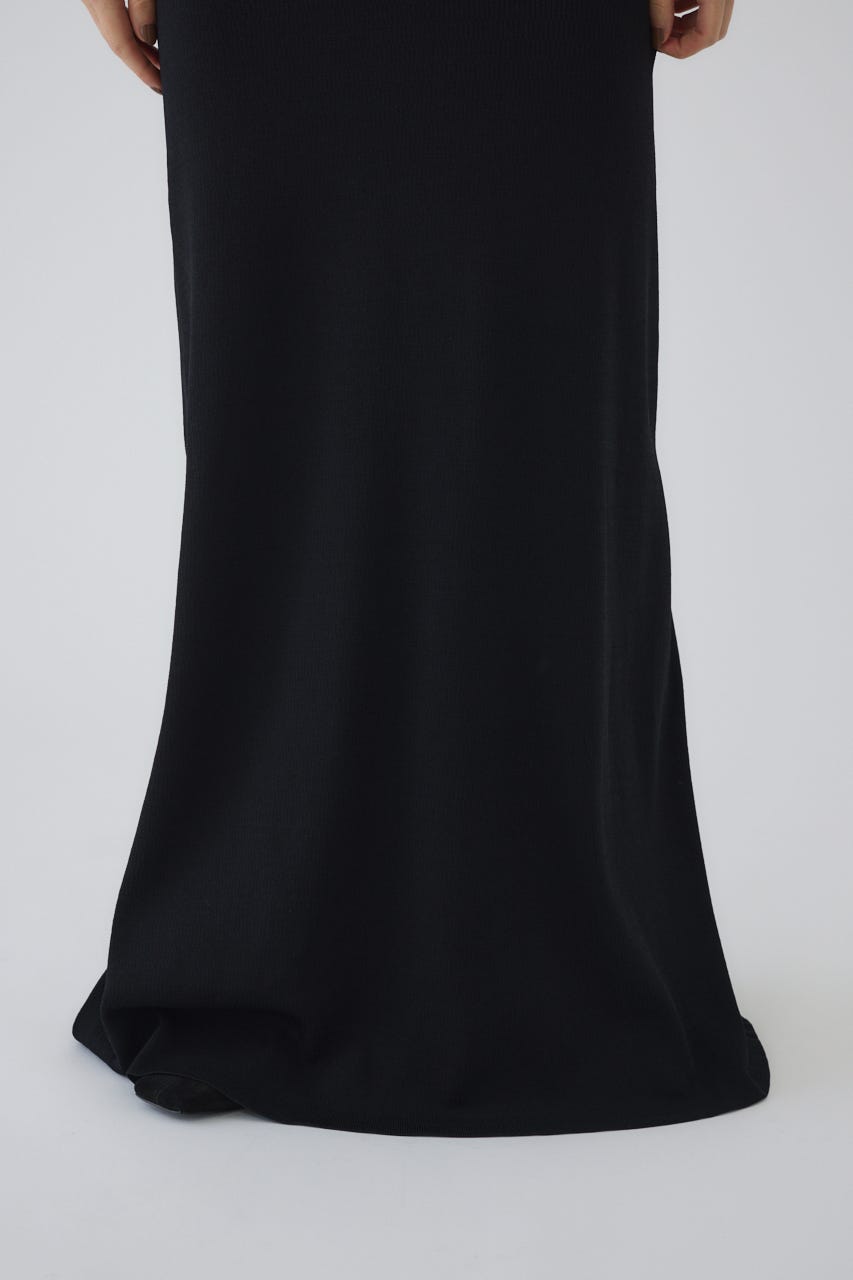 ボディラインを美しく見せるマキシ丈で、編み地にはさりげない柄編みを施し、表情を加えています。