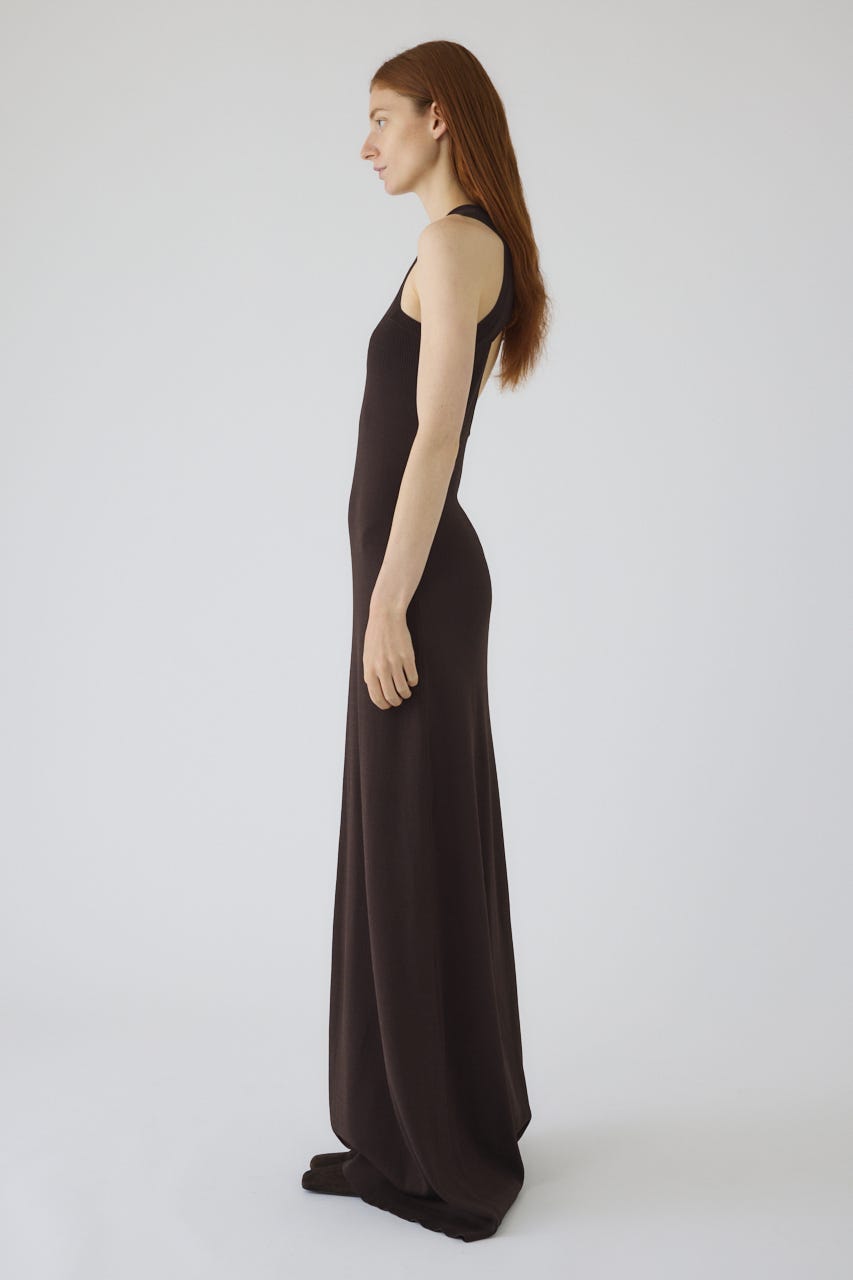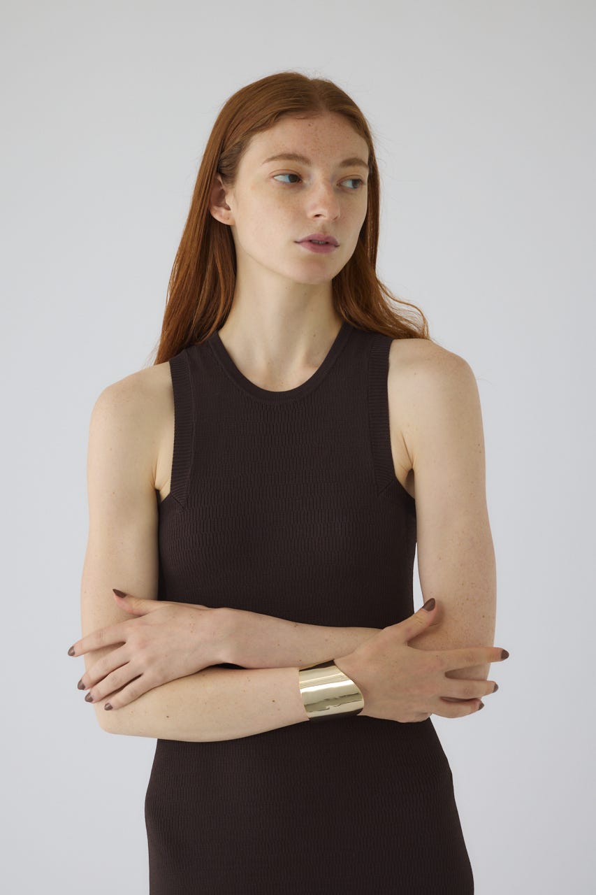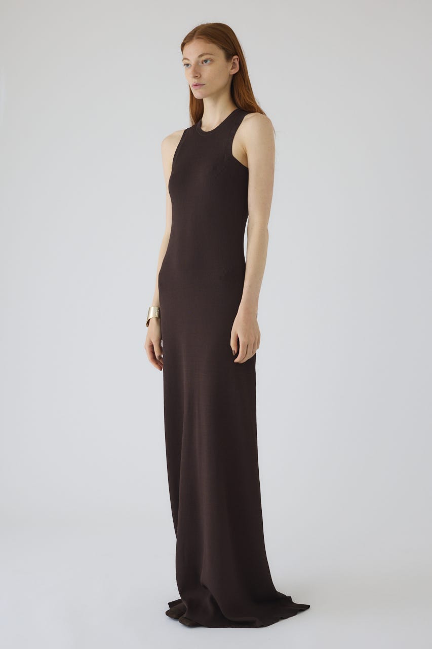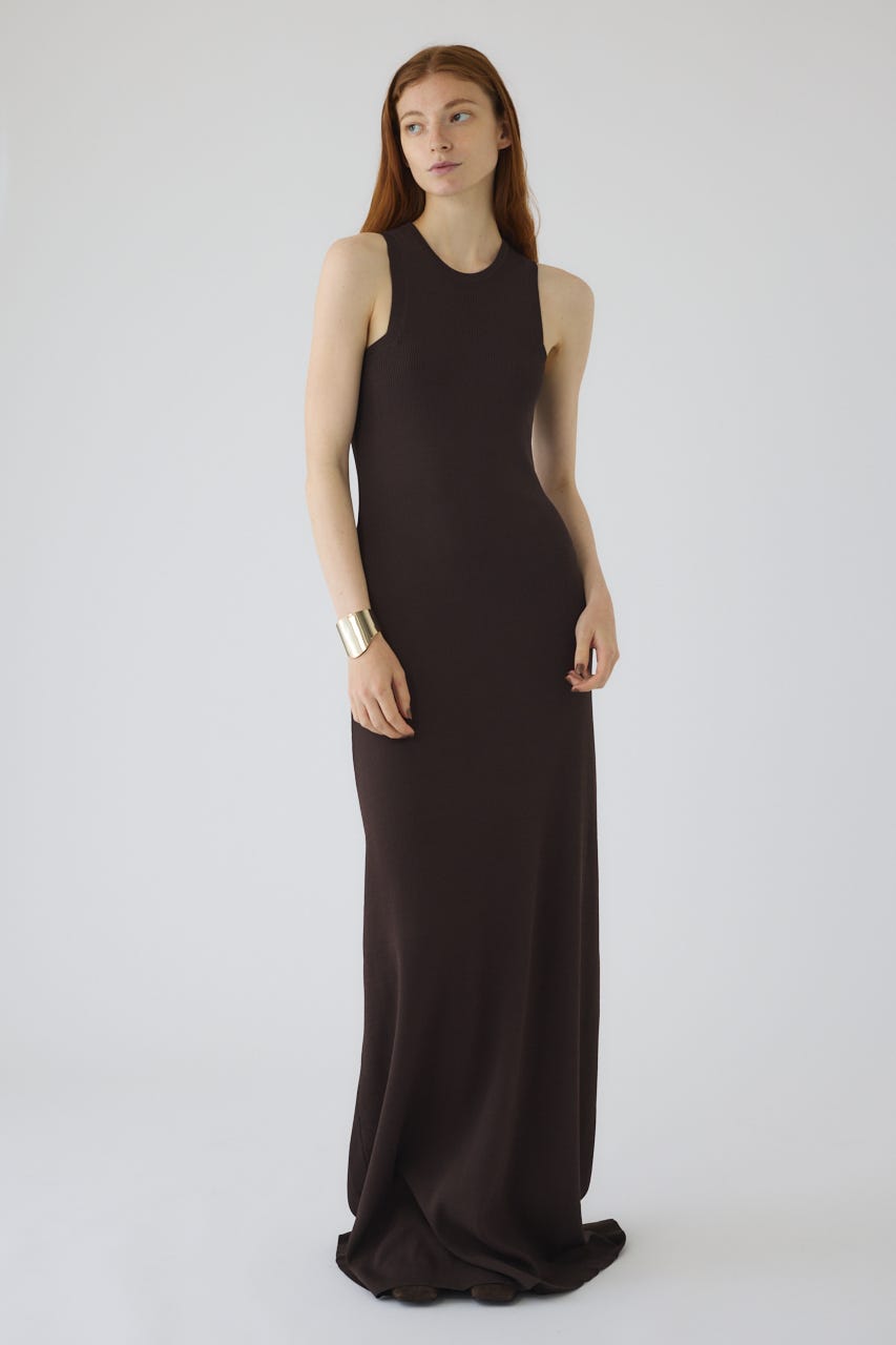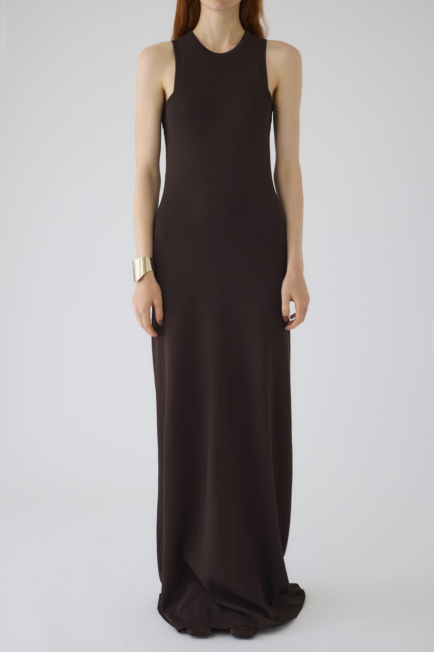 ボディラインを美しく見せるマキシ丈で、編み地にはさりげない柄編みを施し、表情を加えています。