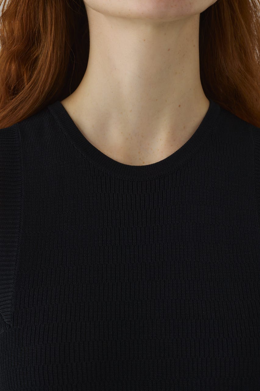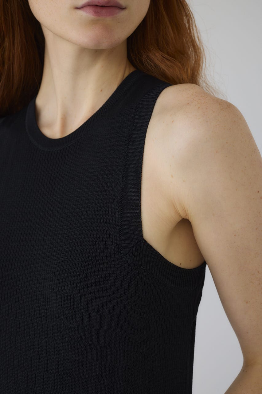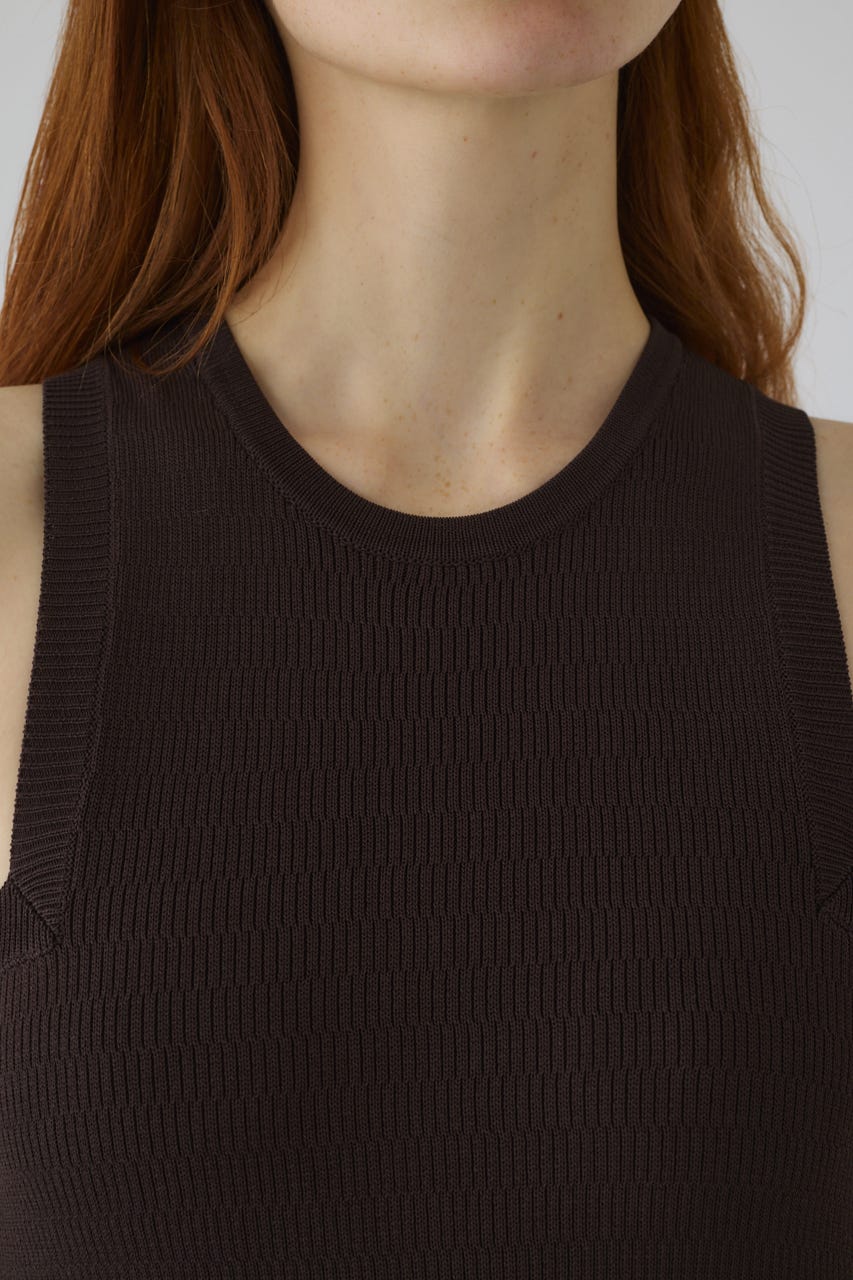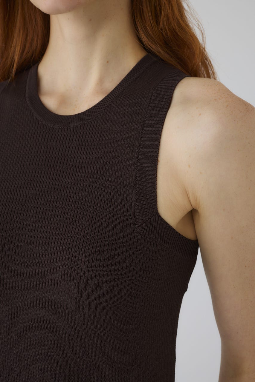 ボディラインを美しく見せるマキシ丈で、編み地にはさりげない柄編みを施し、表情を加えています。
