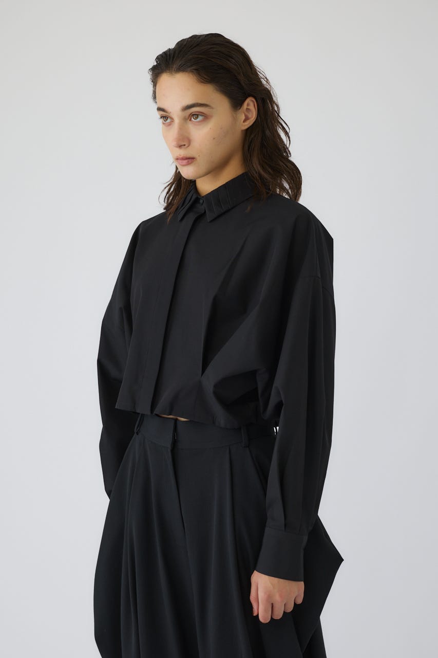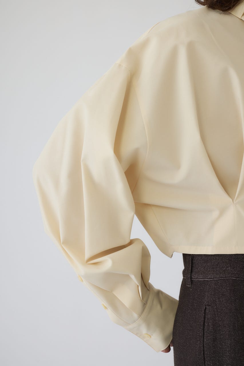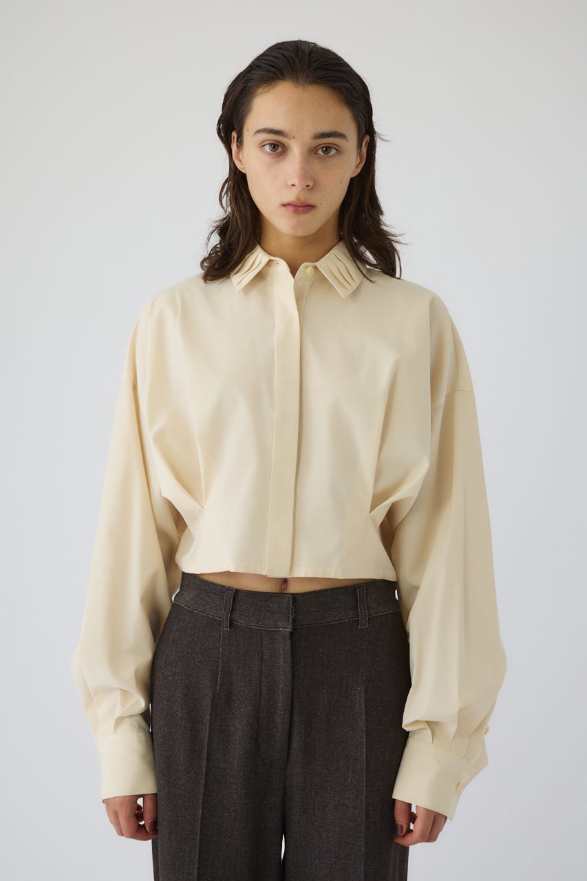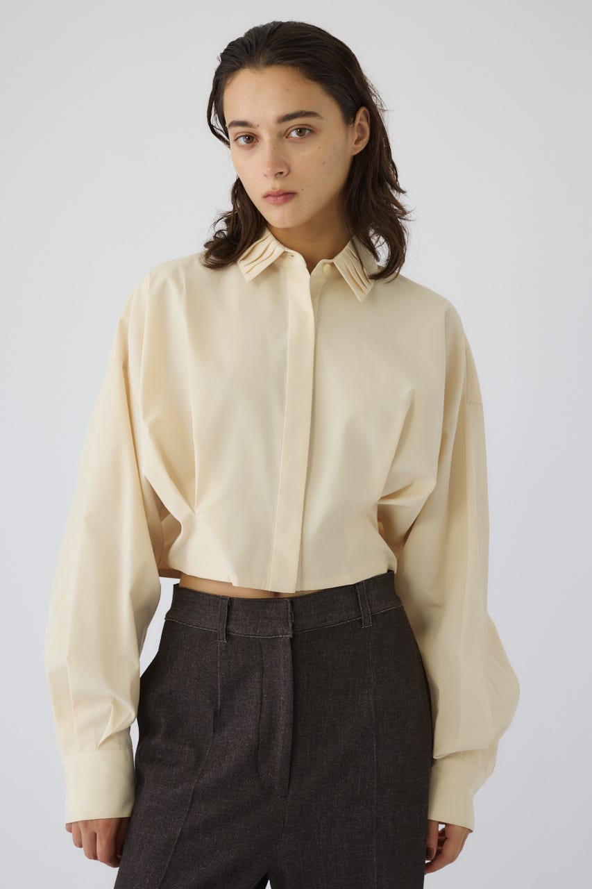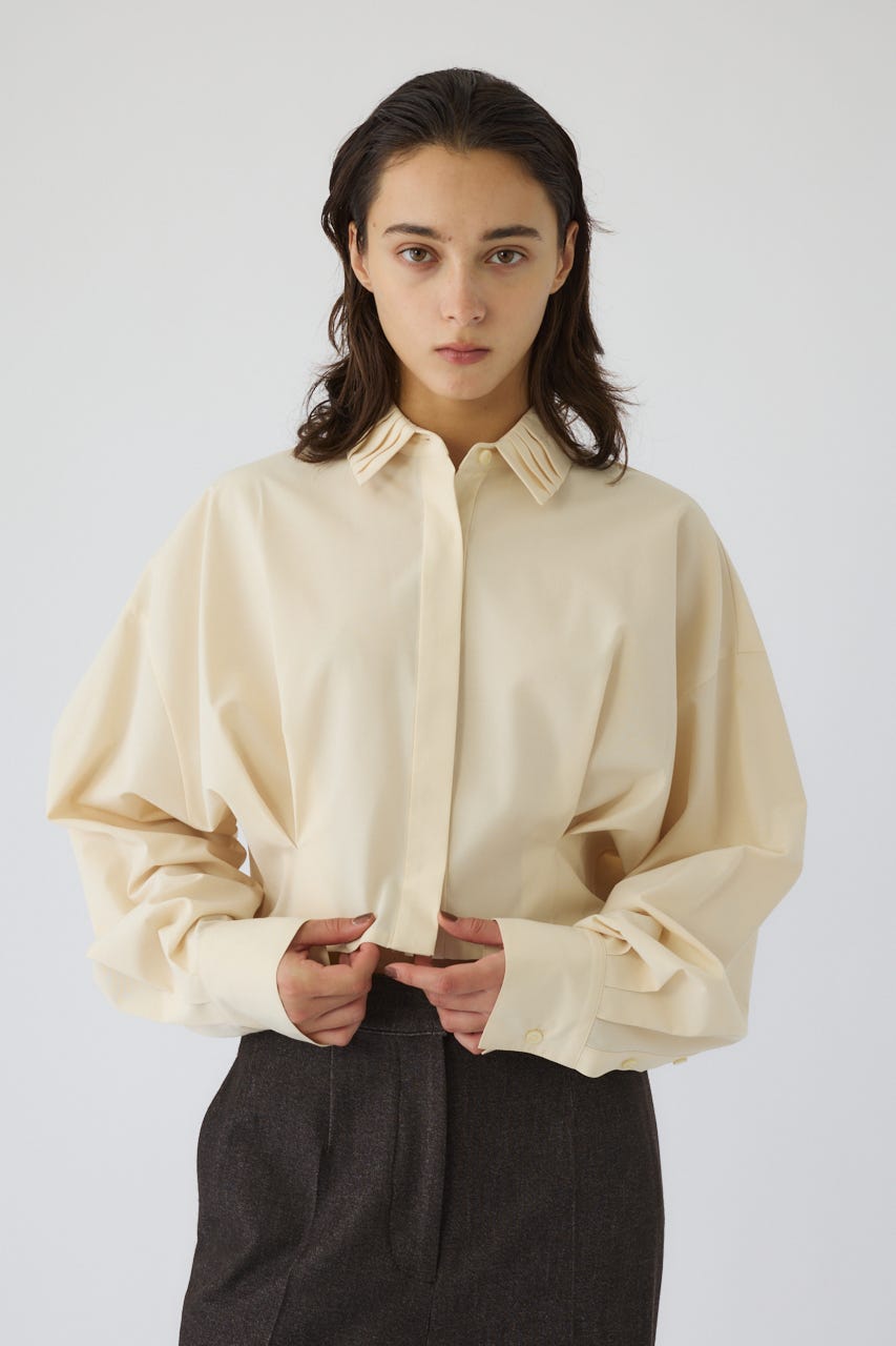 ■POINT:ハリ感とタックで生まれる構築的な丸みのあるフォルムが印象的なシャツ。