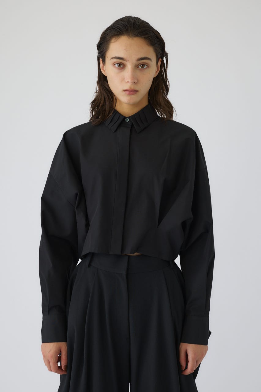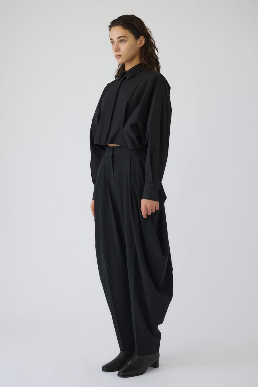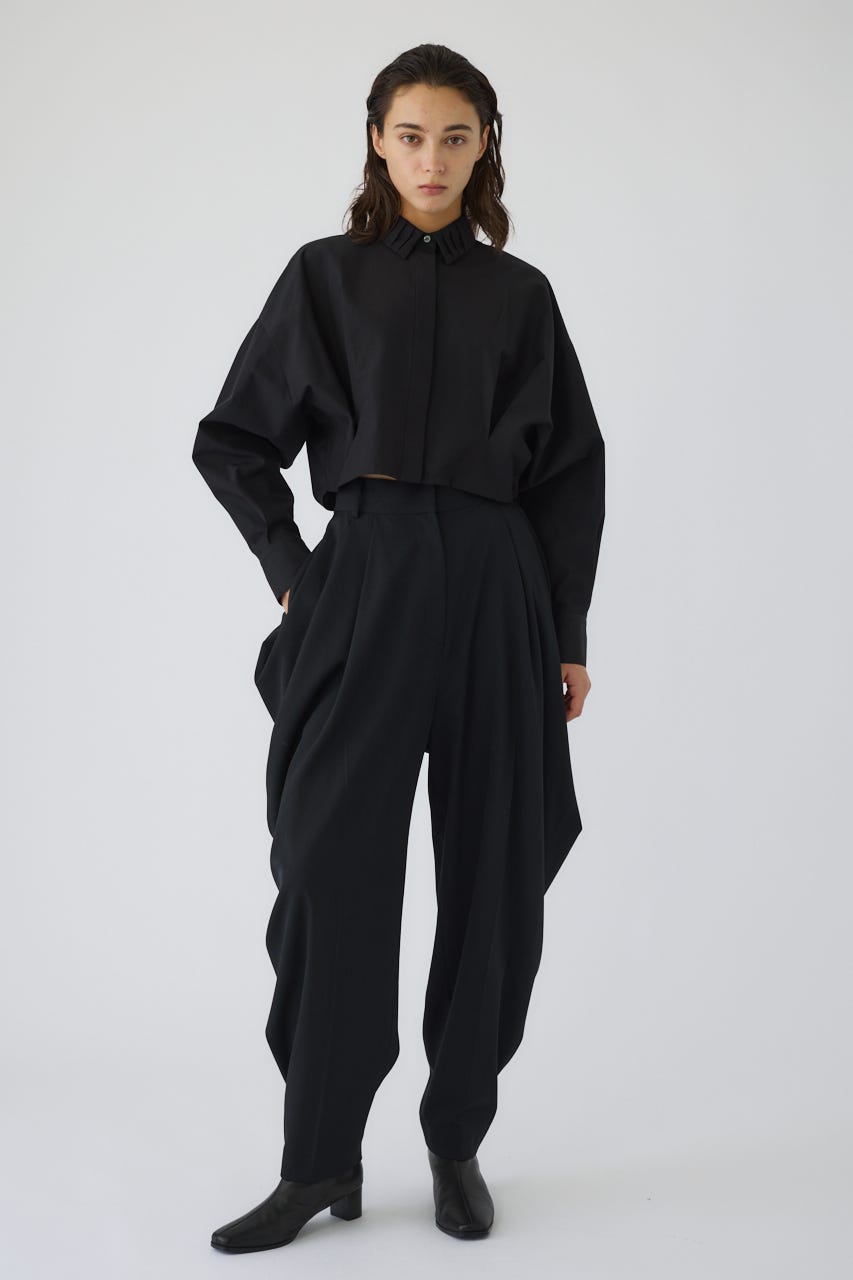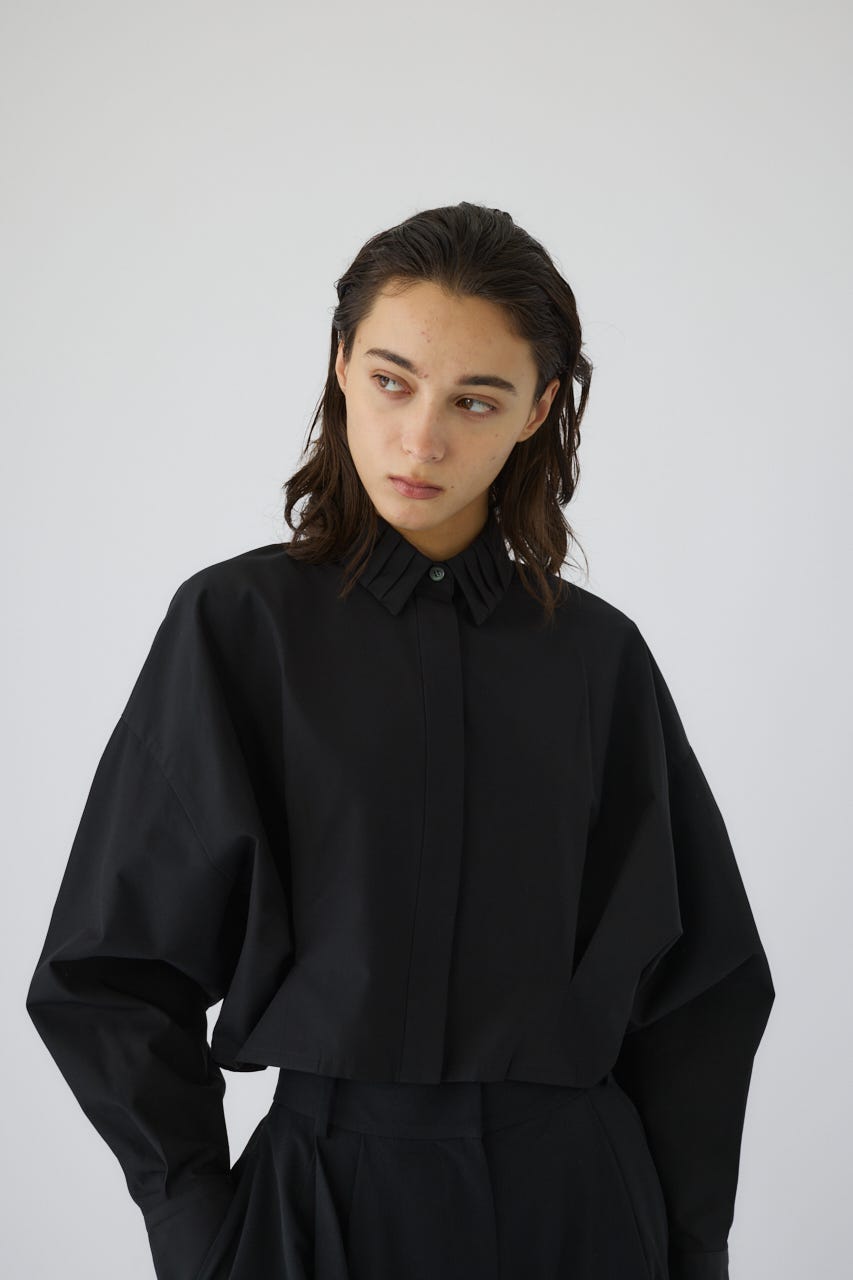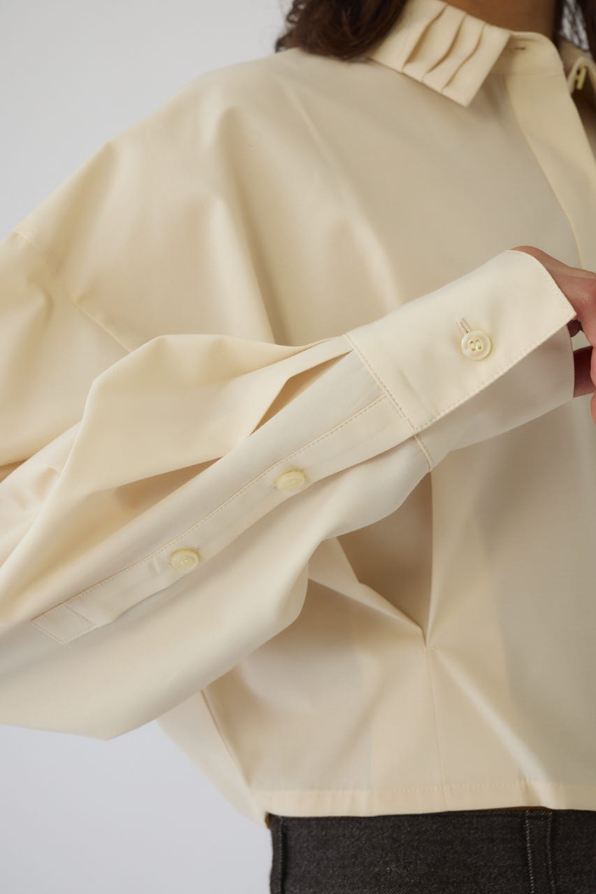 ■POINT:ハリ感とタックで生まれる構築的な丸みのあるフォルムが印象的なシャツ。