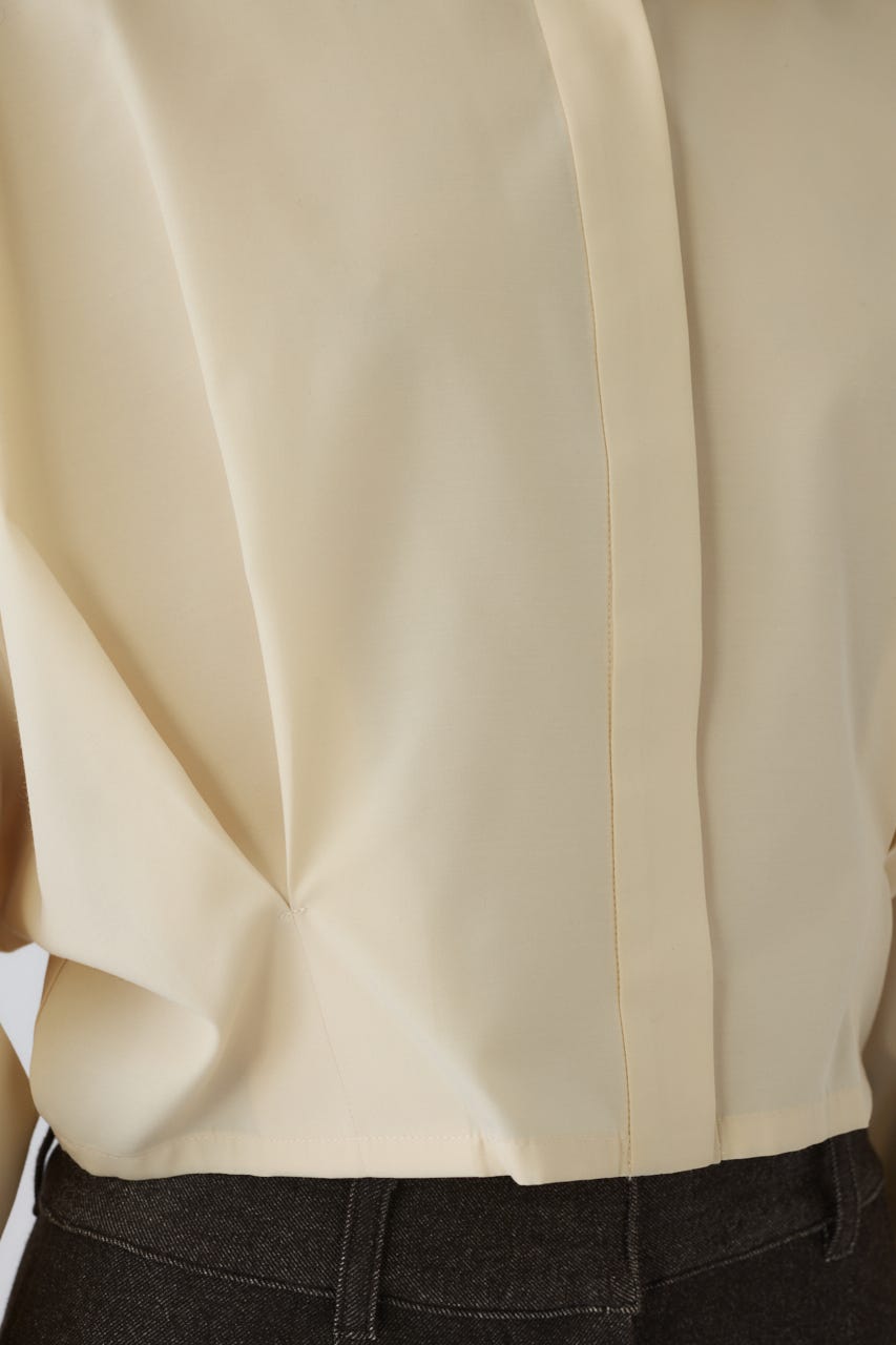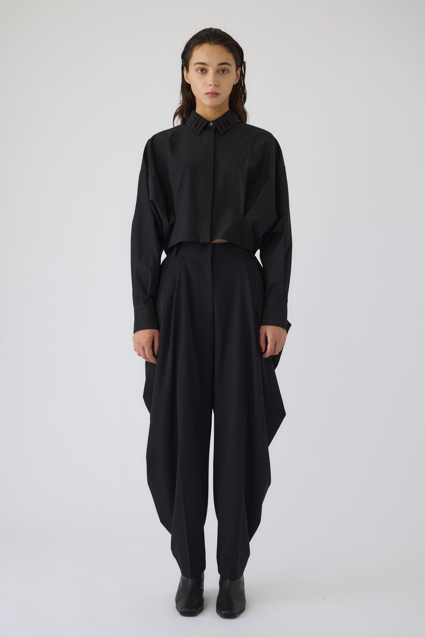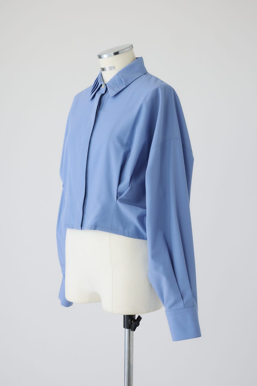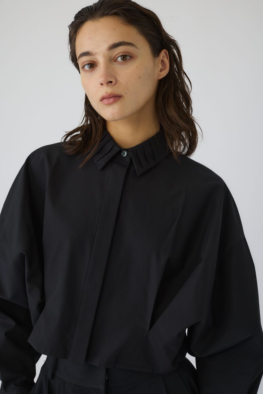 ■POINT:ハリ感とタックで生まれる構築的な丸みのあるフォルムが印象的なシャツ。