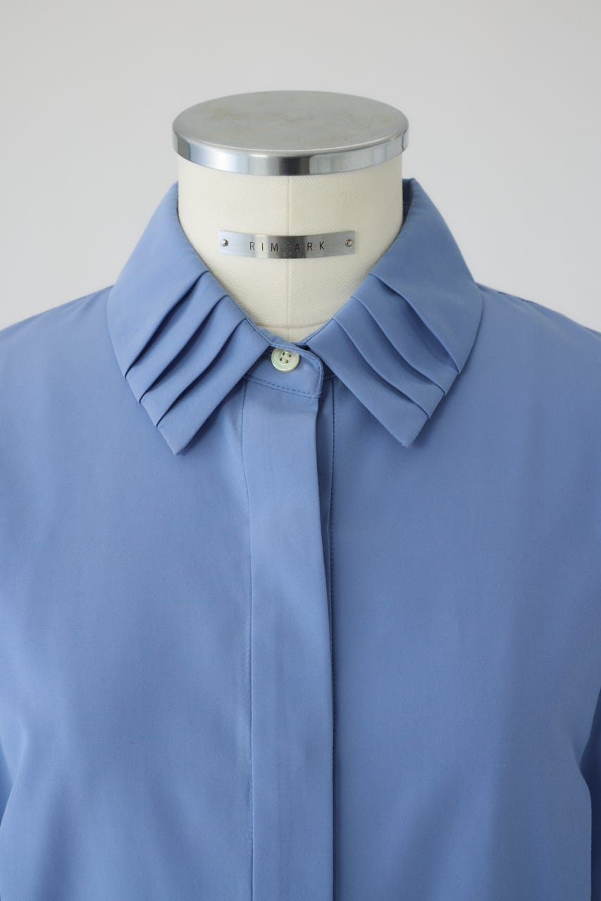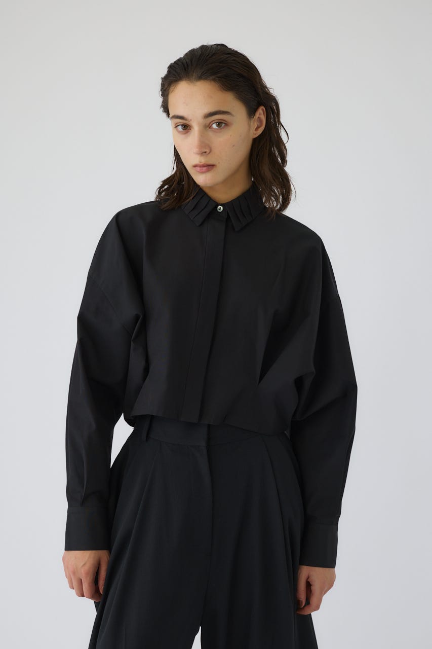 襟に施したプリーツが絶妙なモード感をプラスし、シンプルながら存在感を放つアイテム。