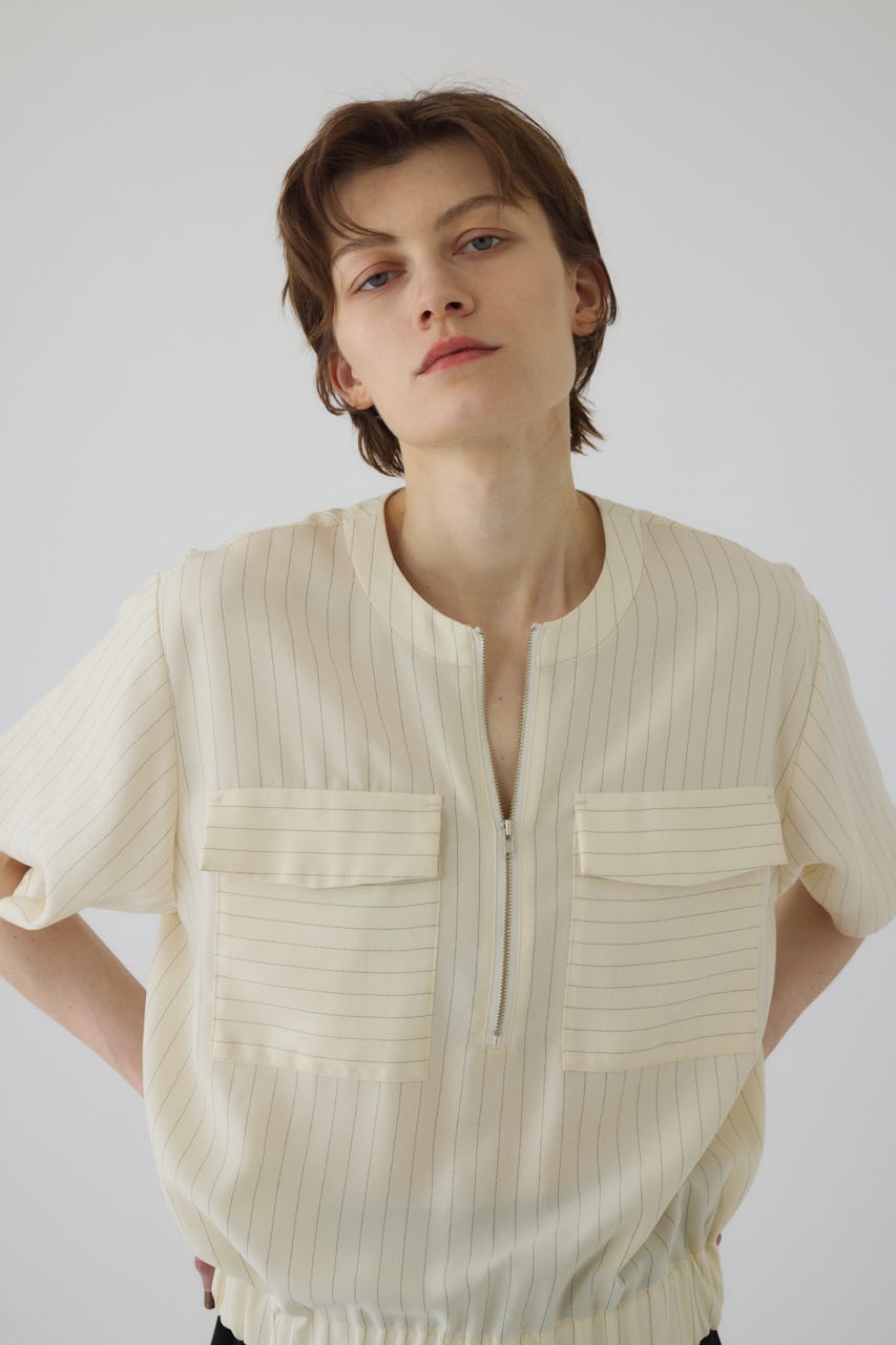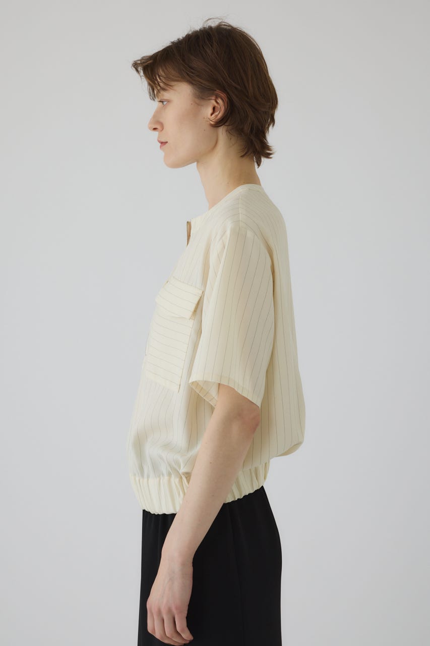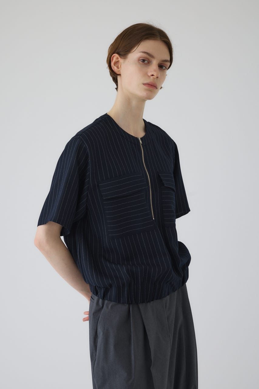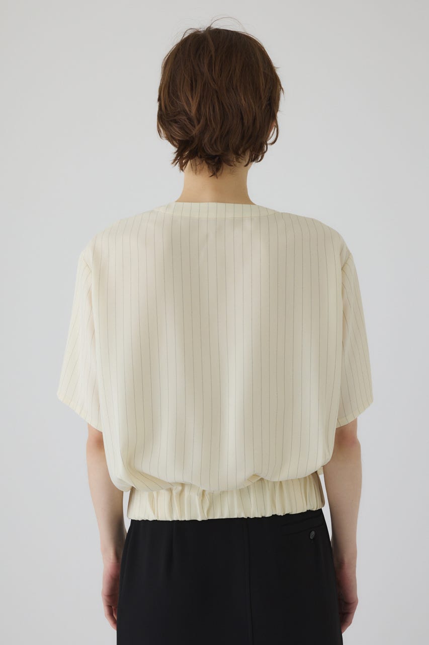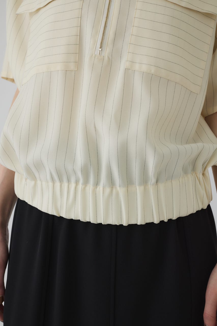 ■POINT:ストライプ柄のやや反発感のある薄手のポリエステル生地を使用した、ハーフスリーブトップス。