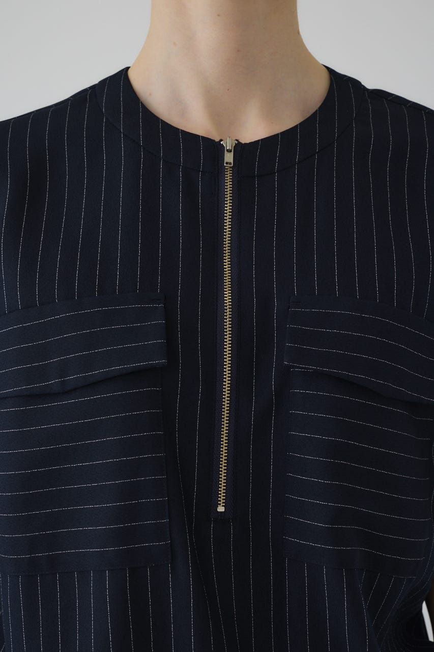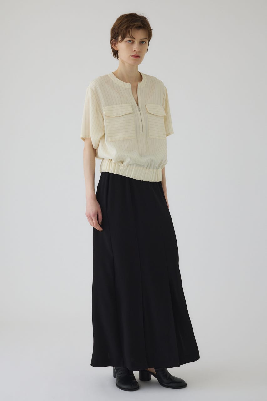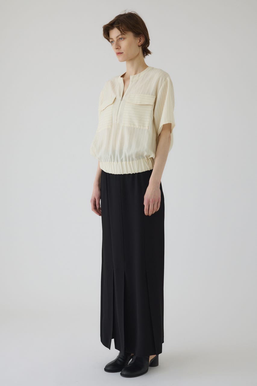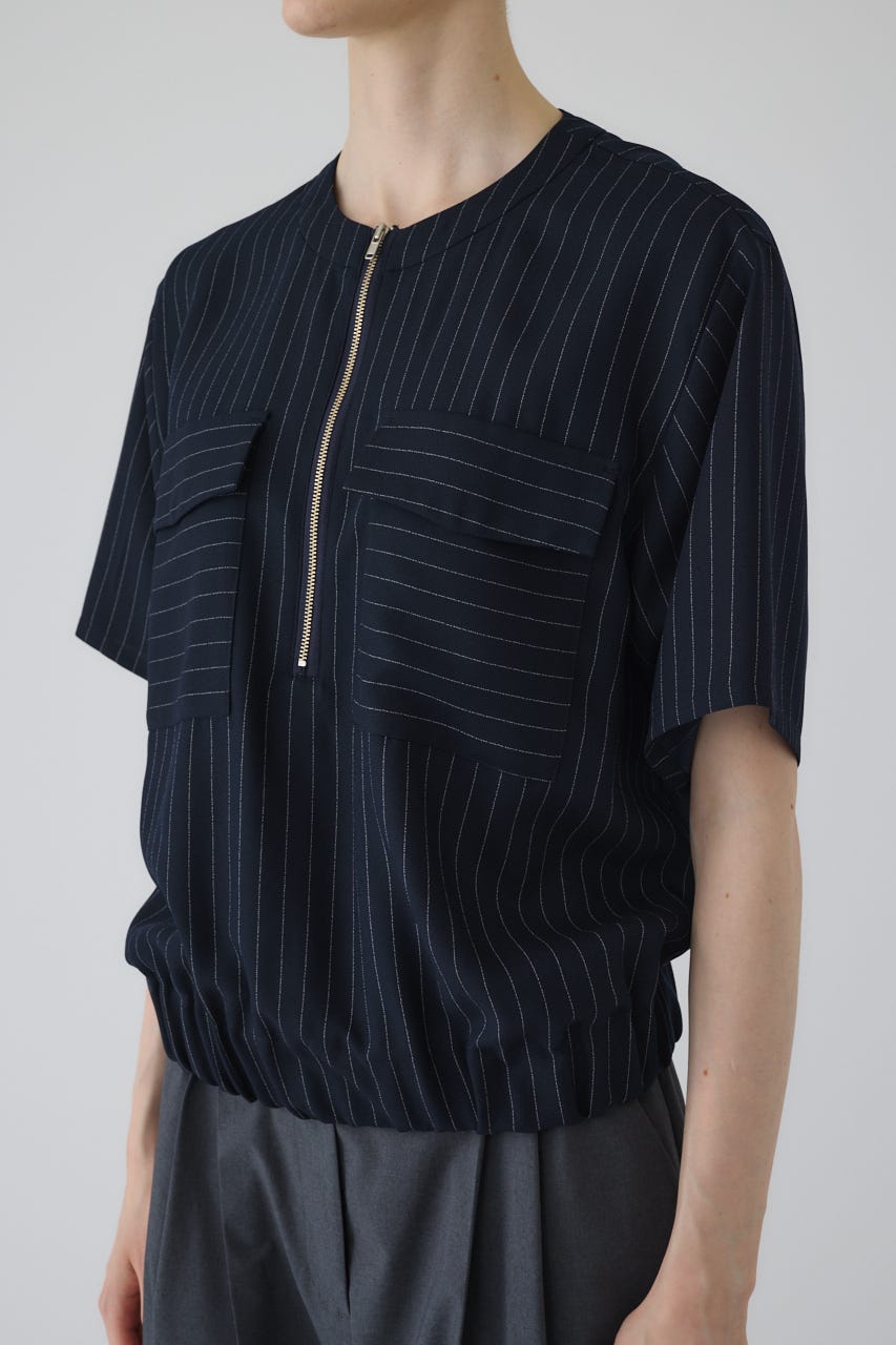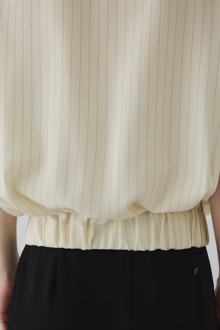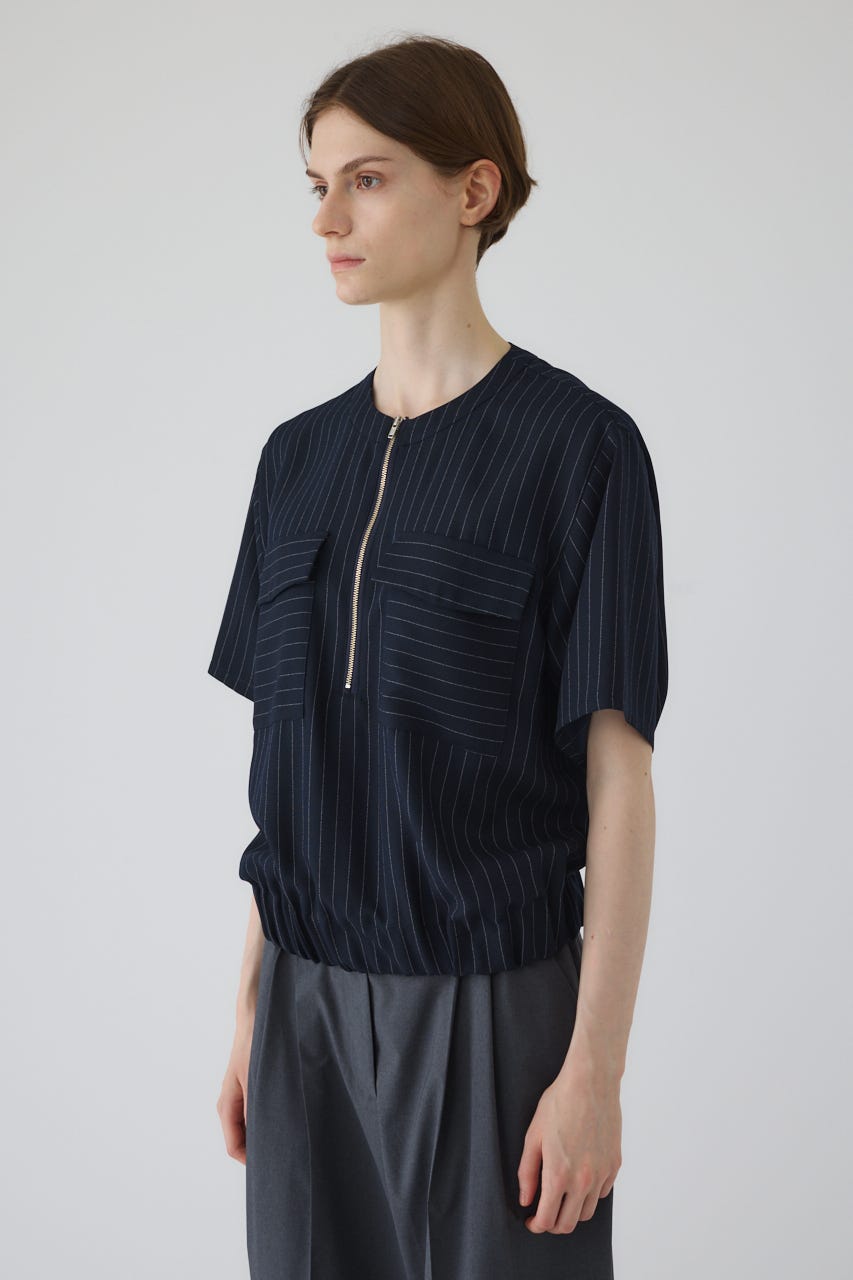 ■POINT:ストライプ柄のやや反発感のある薄手のポリエステル生地を使用した、ハーフスリーブトップス。