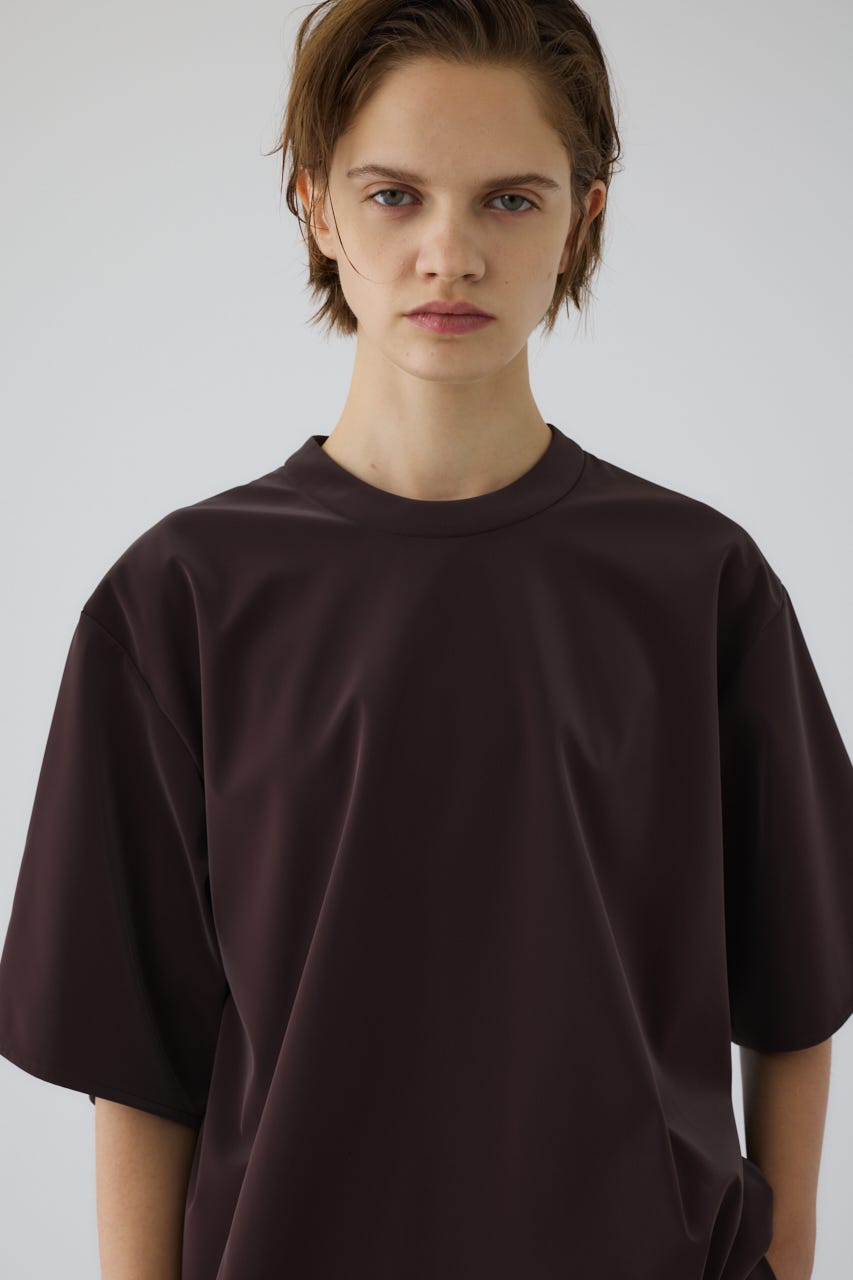 ■POINT:ベルベットにもレザーにも見える不思議な表情の生地を使用した、極薄でストレッチ性抜群のアシンメトリートップス。
