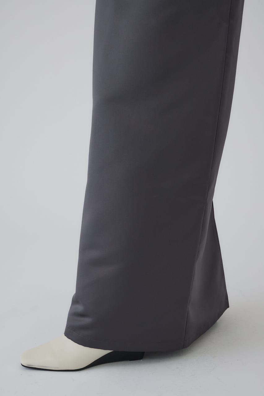 サテン特有のエレガントさにモードが加わったような印象で、大人のモードスタイルを楽しめる一着です。