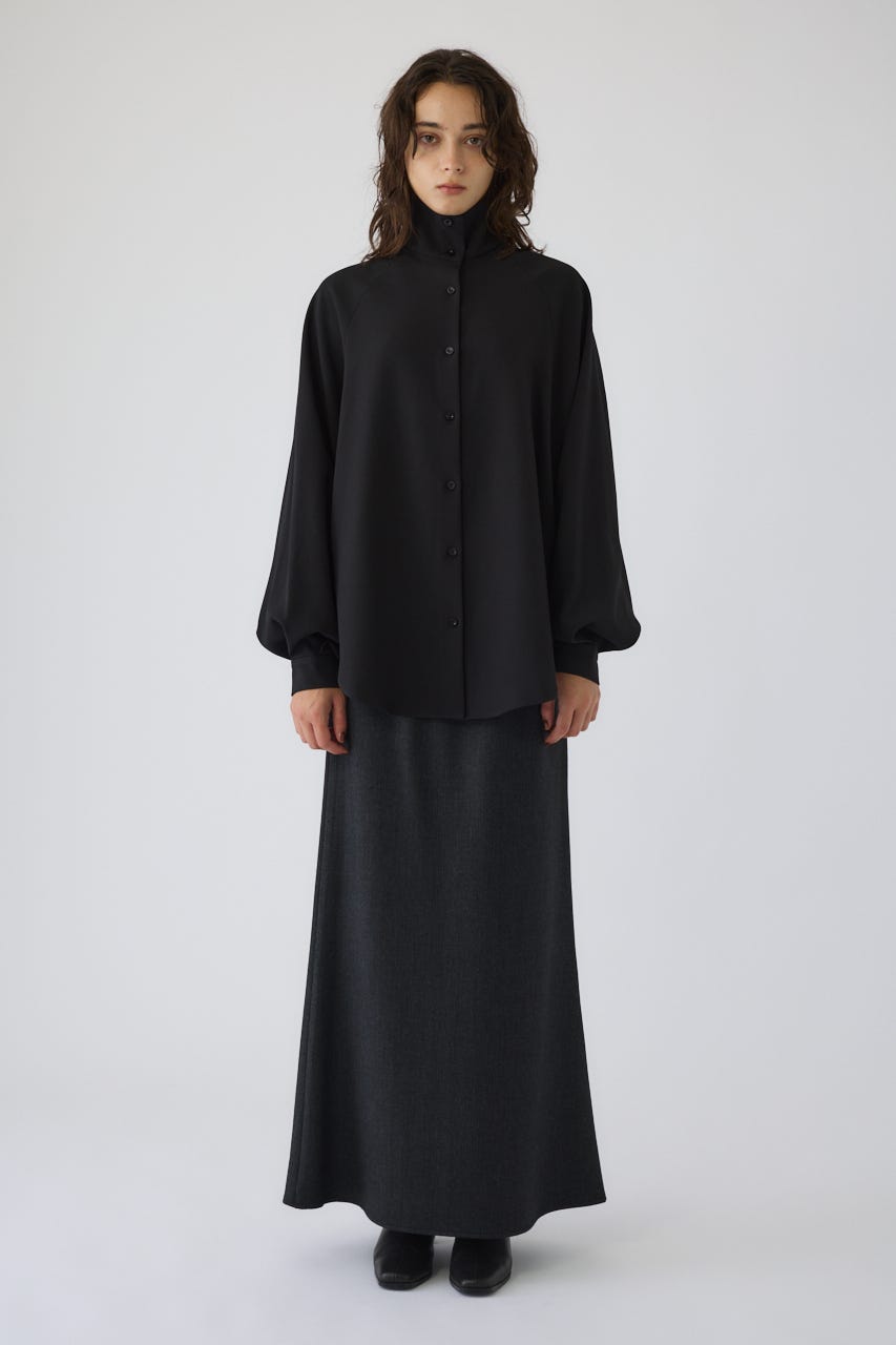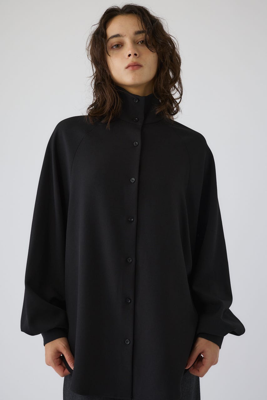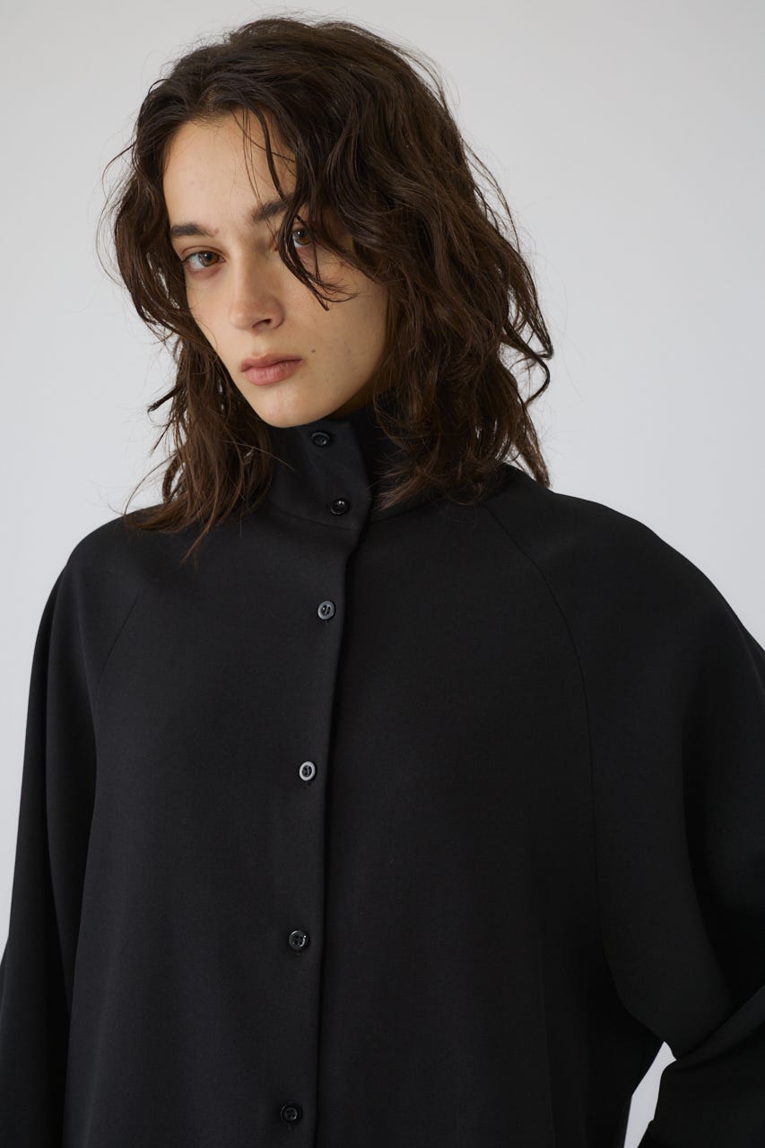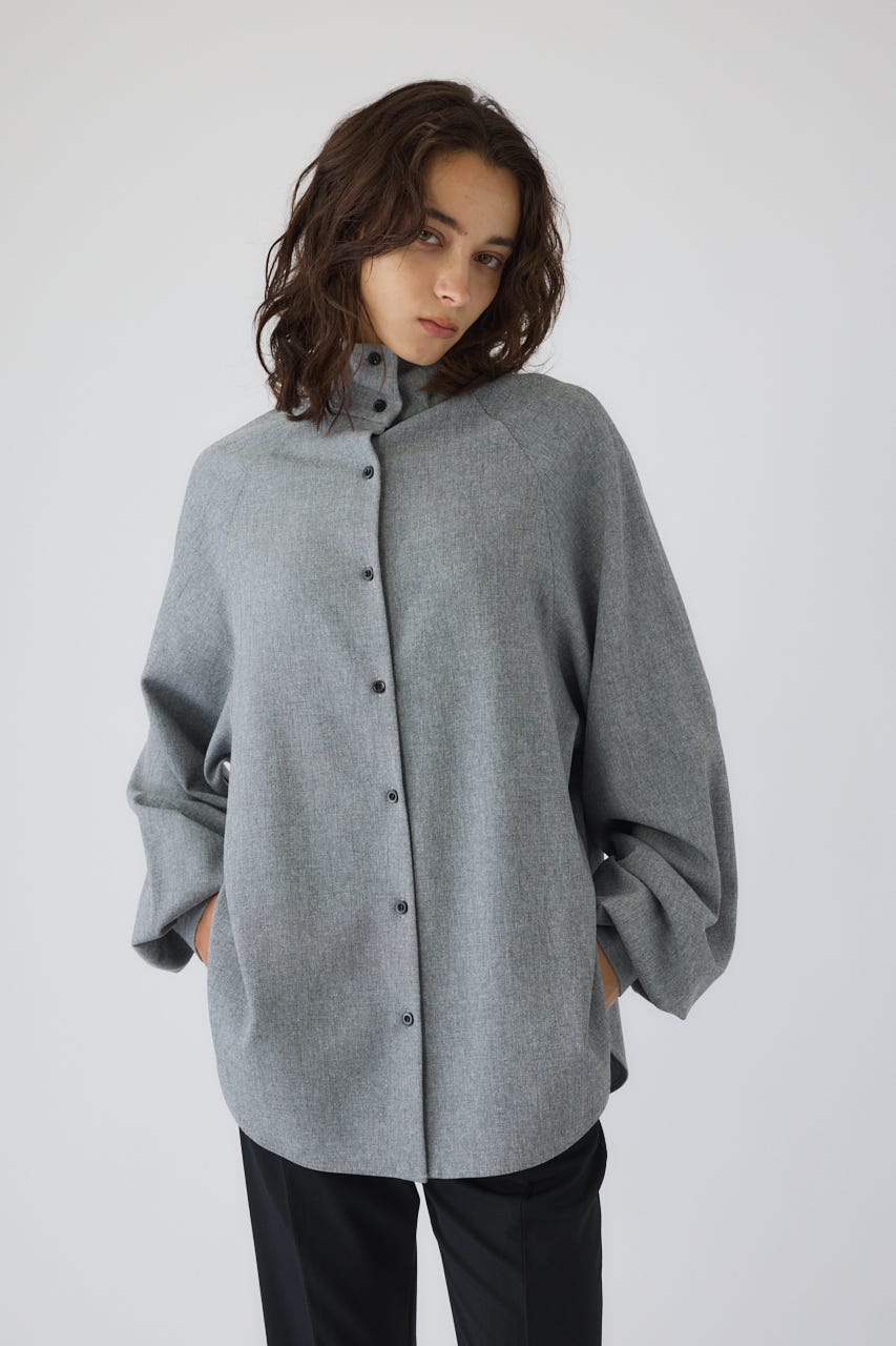 オーバーサイズながらもネックの高さとボリュームスリーブがエレガントな印象をプラス。