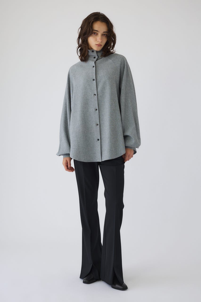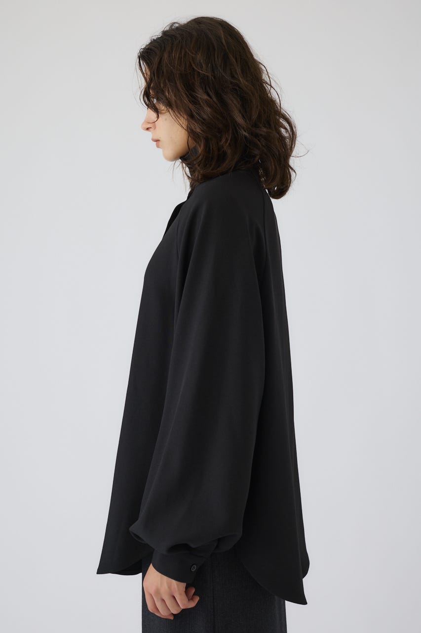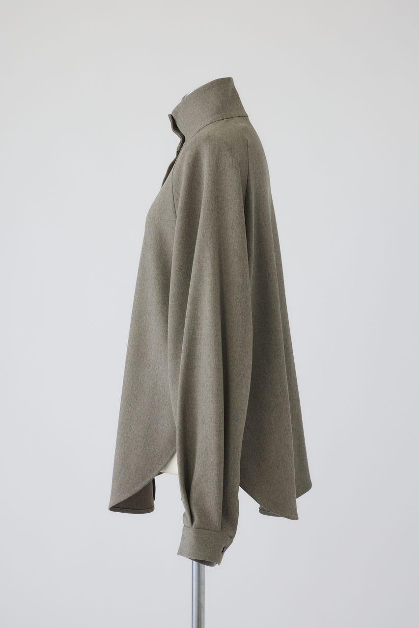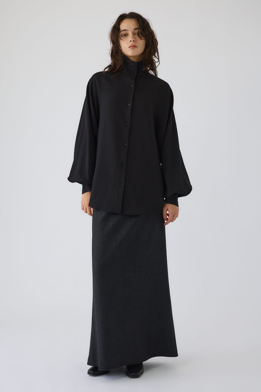 オーバーサイズながらもネックの高さとボリュームスリーブがエレガントな印象をプラス。