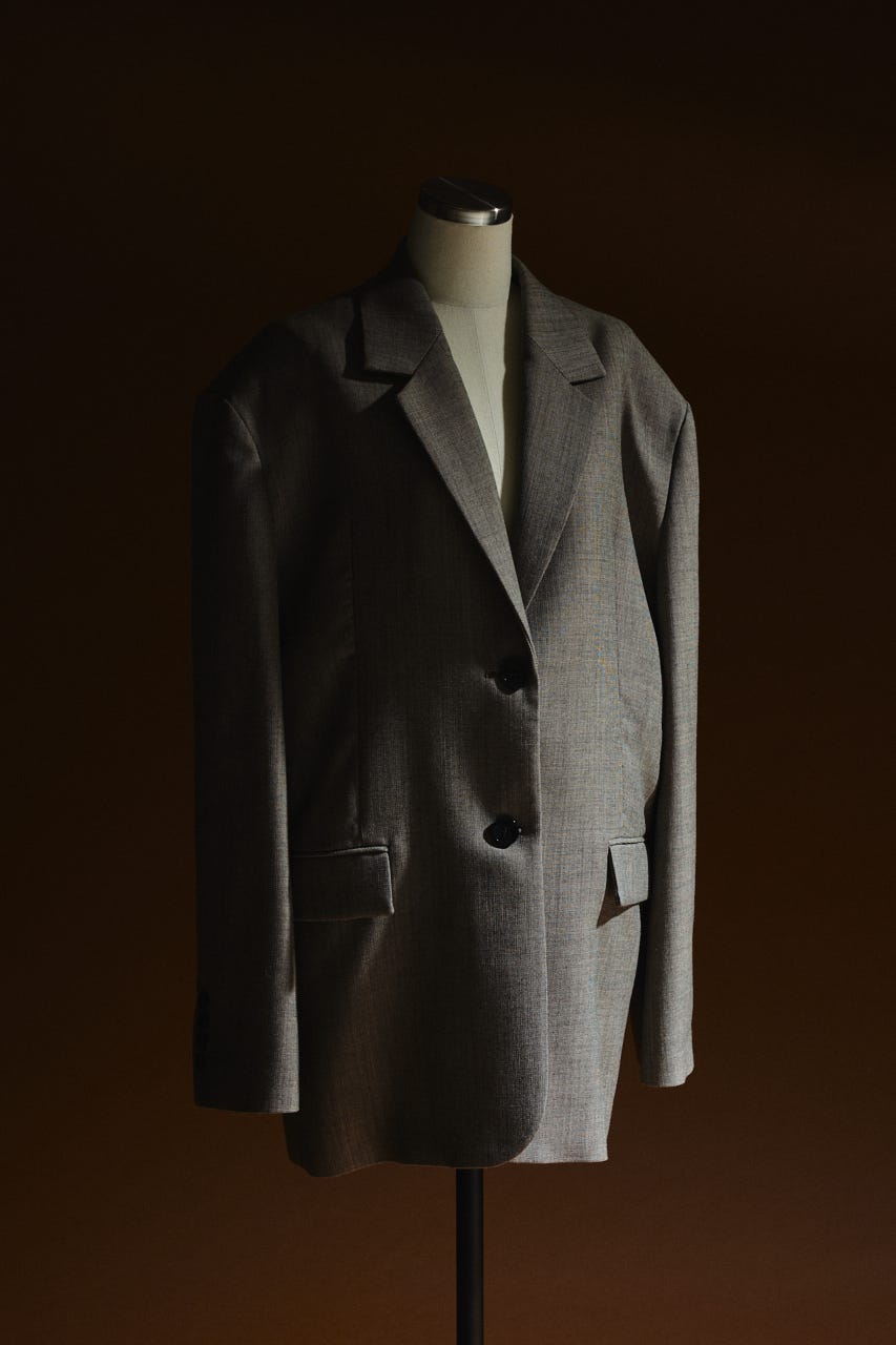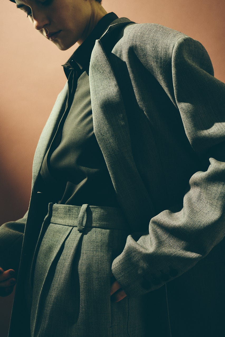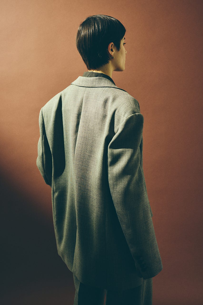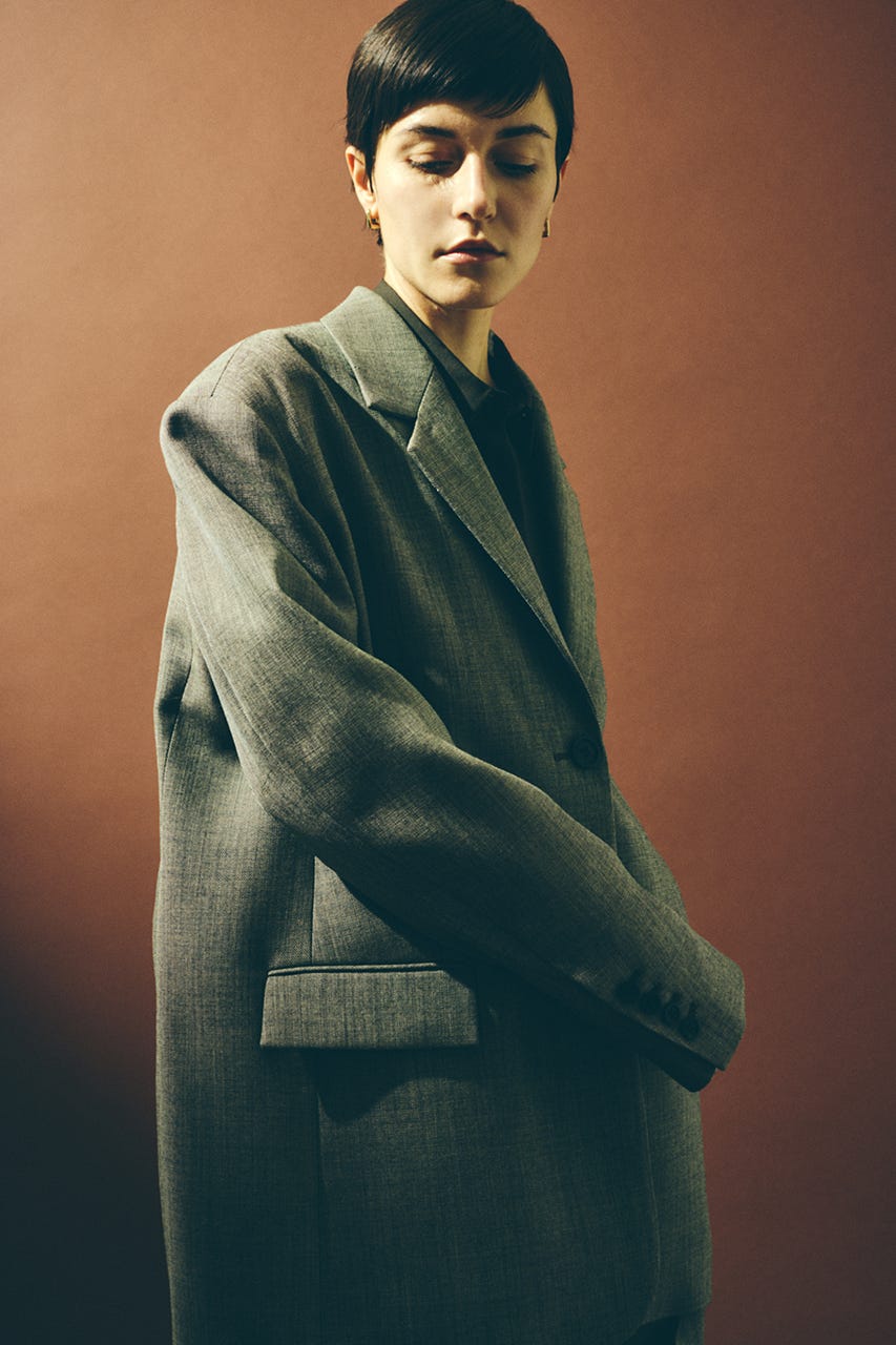メンズのジャケットを意識したオーバーサイズにしっかりと肩を立たせたボックスシルエットのジャケットは、女性が着ると身体をすっぽりと包み込み、華奢に見せてくれます。