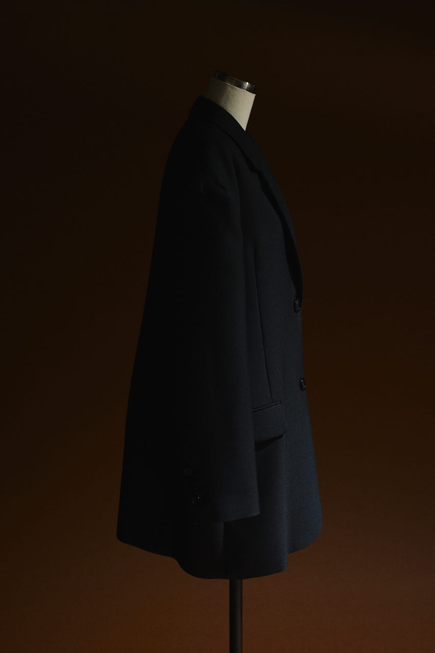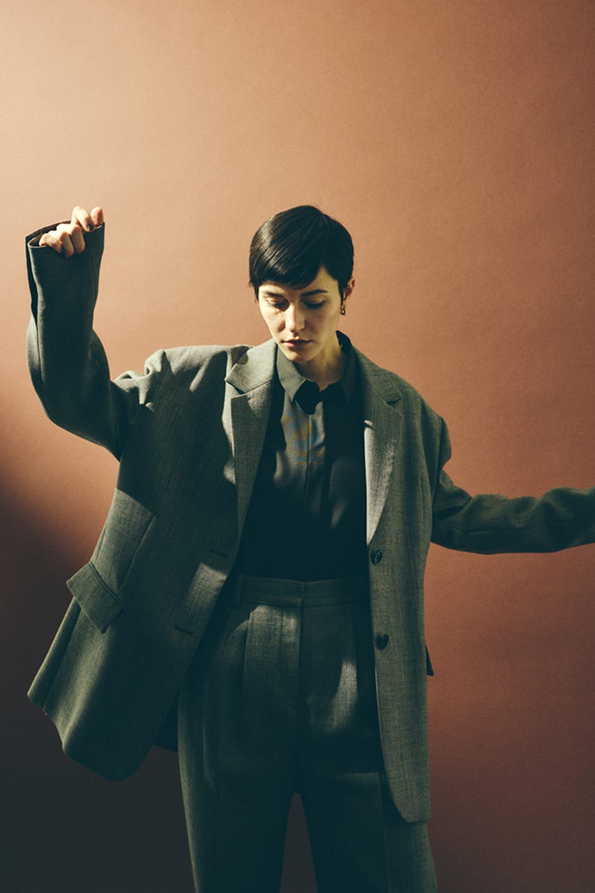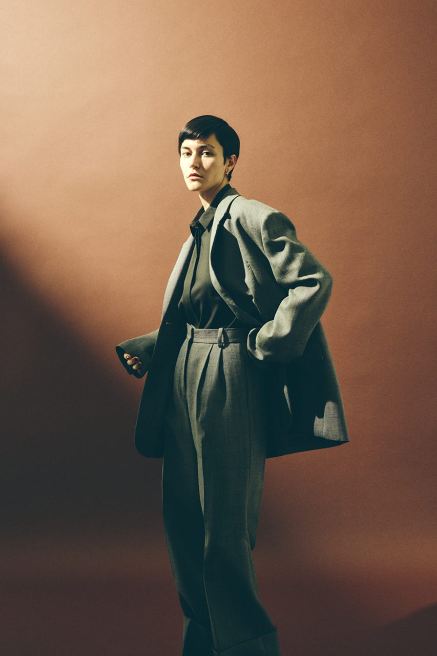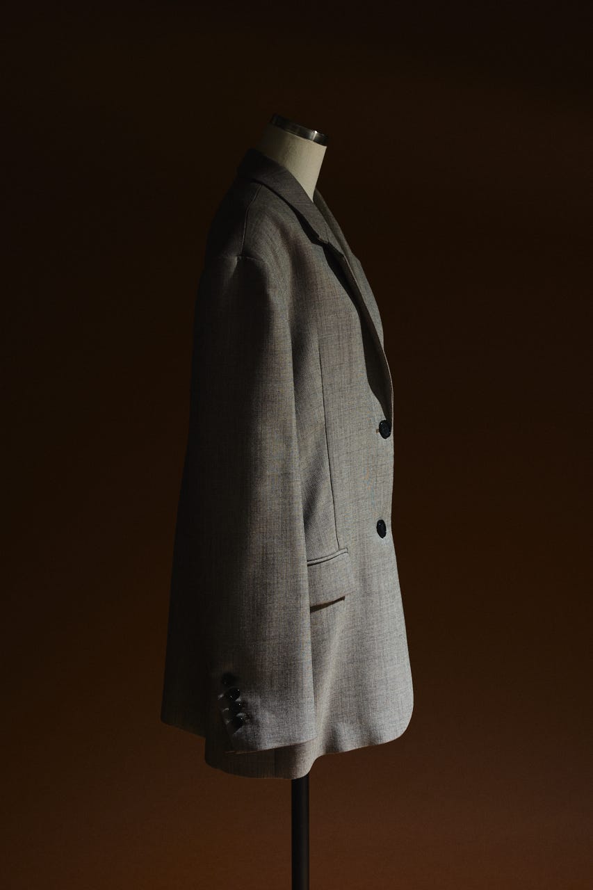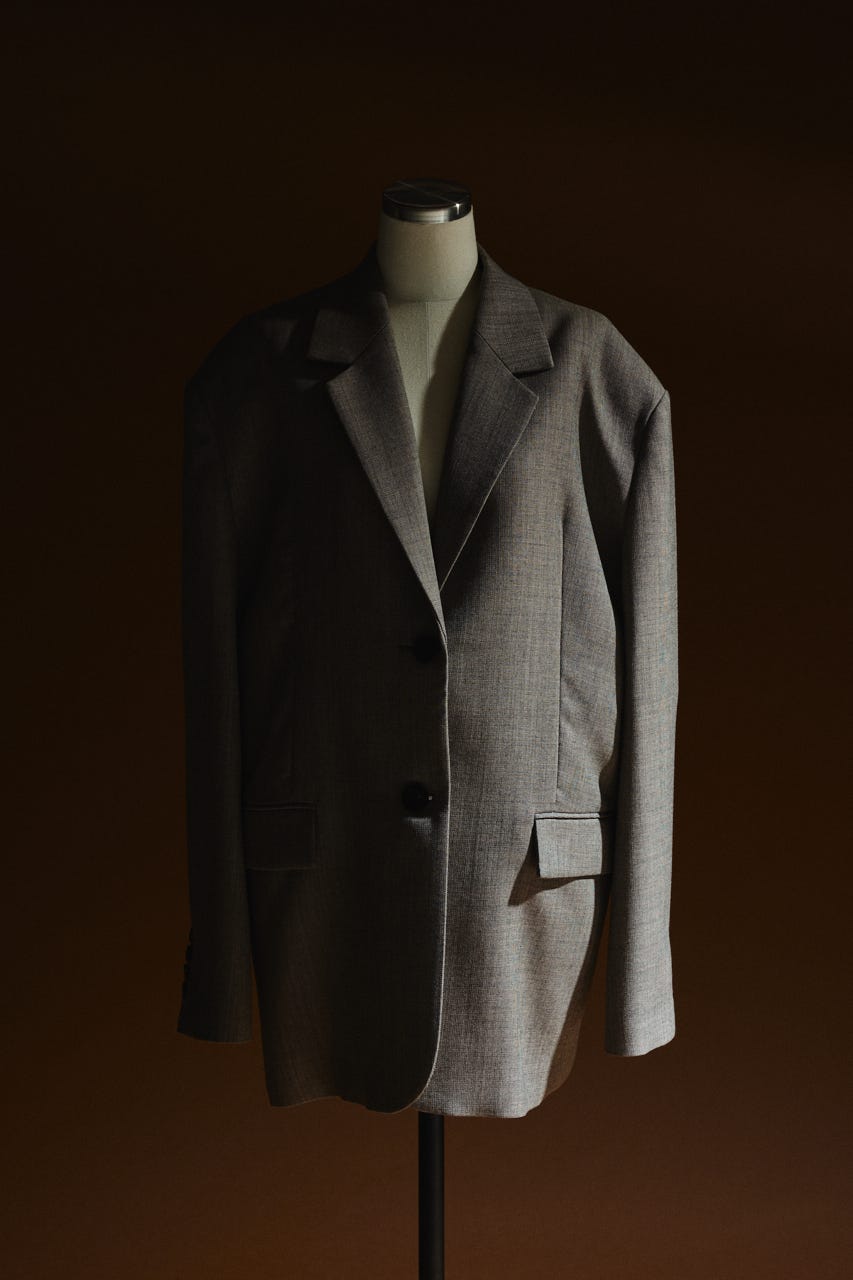 メンズのジャケットを意識したオーバーサイズにしっかりと肩を立たせたボックスシルエットのジャケットは、女性が着ると身体をすっぽりと包み込み、華奢に見せてくれます。