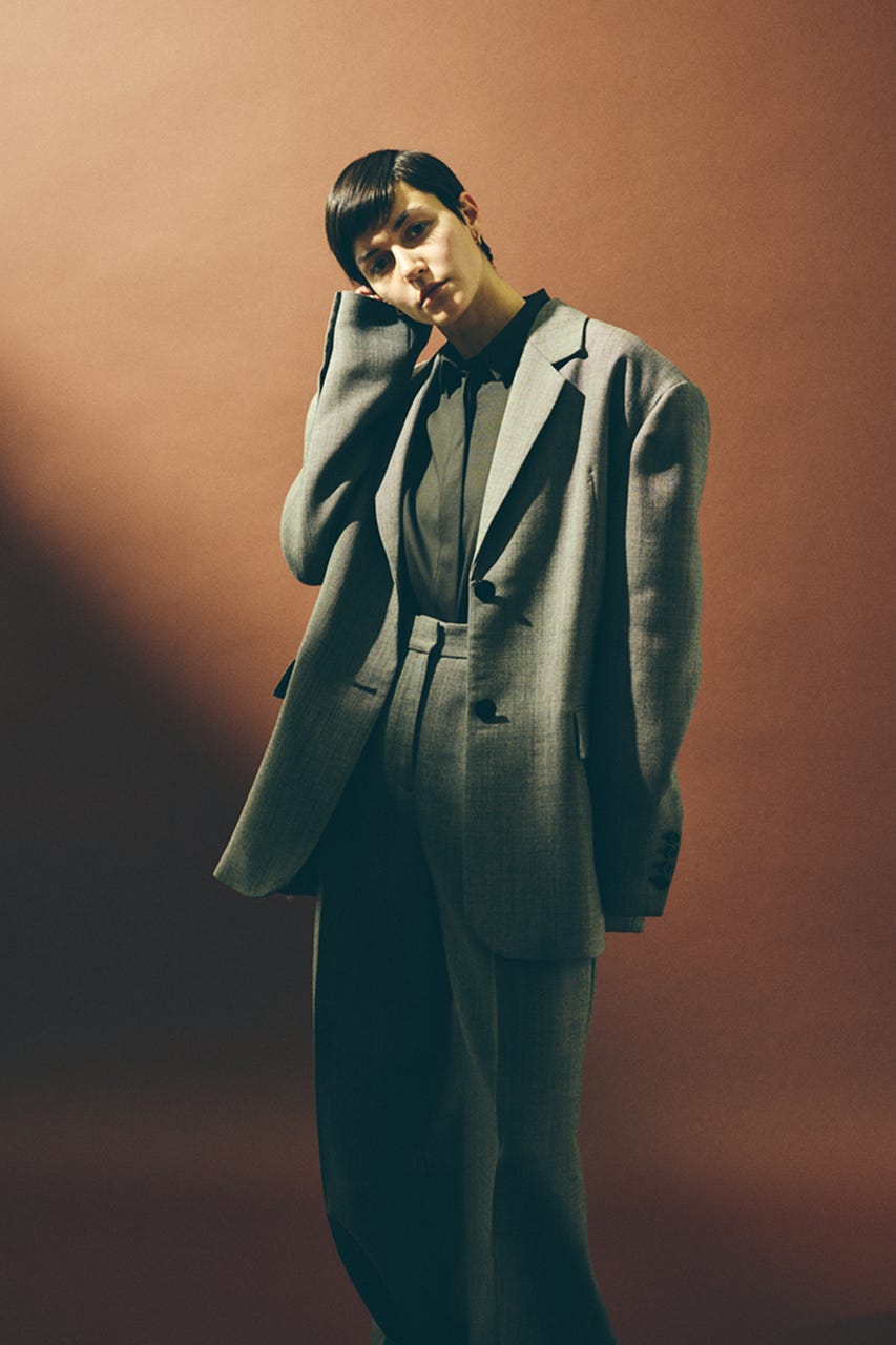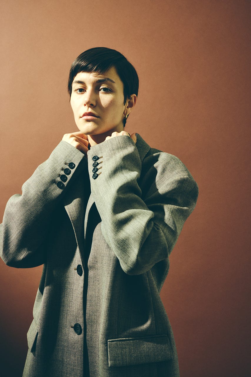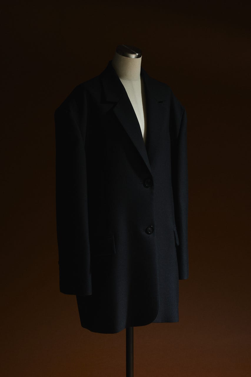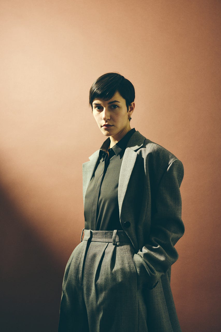 メンズのジャケットを意識したオーバーサイズにしっかりと肩を立たせたボックスシルエットのジャケットは、女性が着ると身体をすっぽりと包み込み、華奢に見せてくれます。