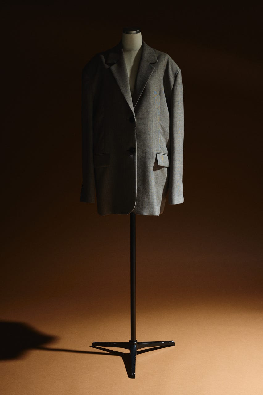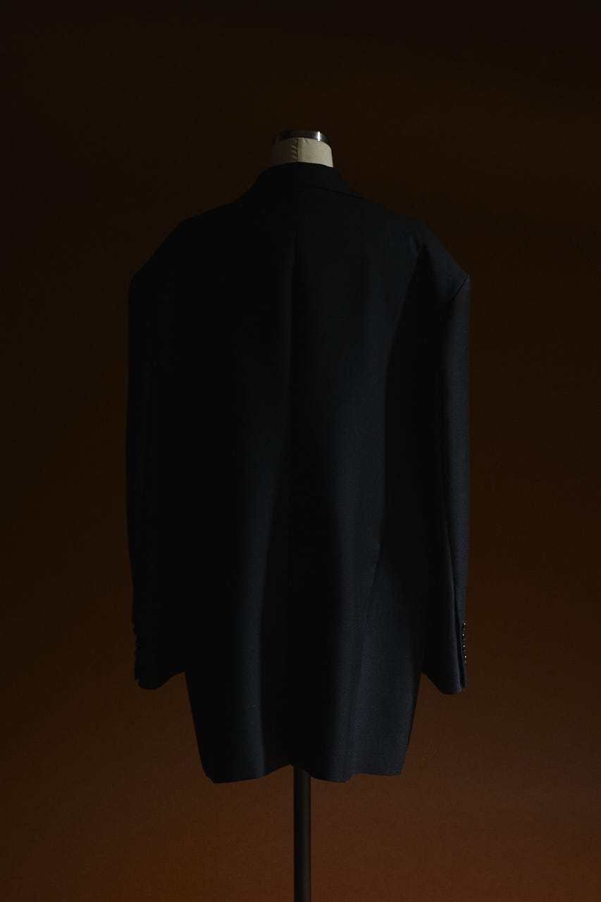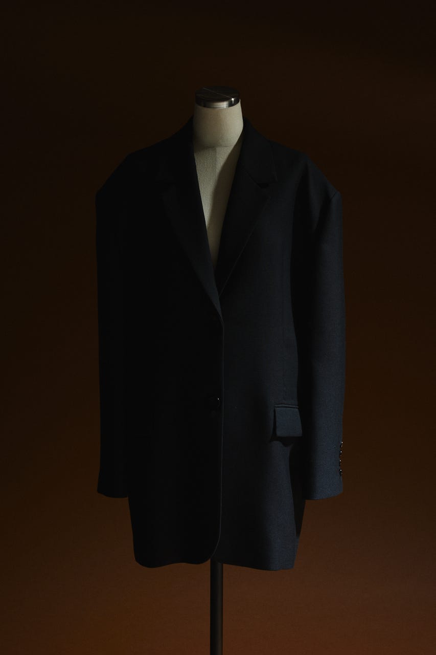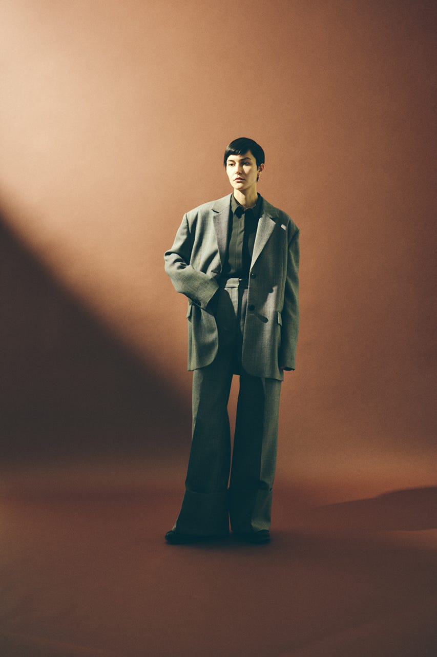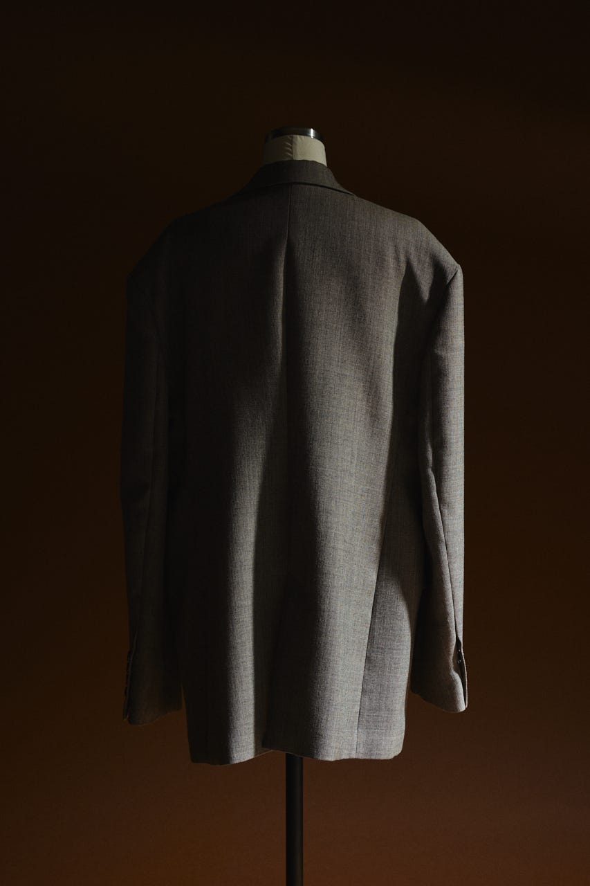 メンズのジャケットを意識したオーバーサイズにしっかりと肩を立たせたボックスシルエットのジャケットは、女性が着ると身体をすっぽりと包み込み、華奢に見せてくれます。