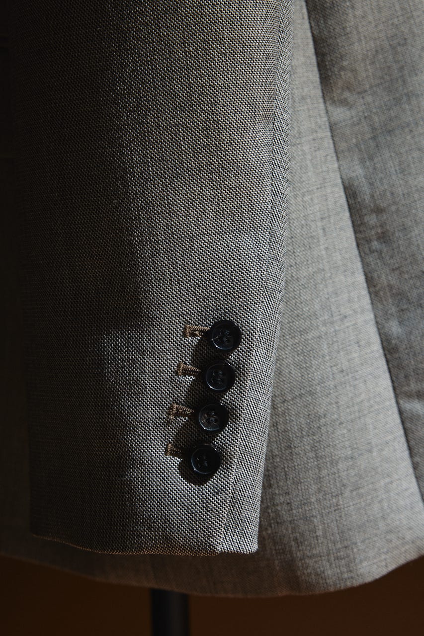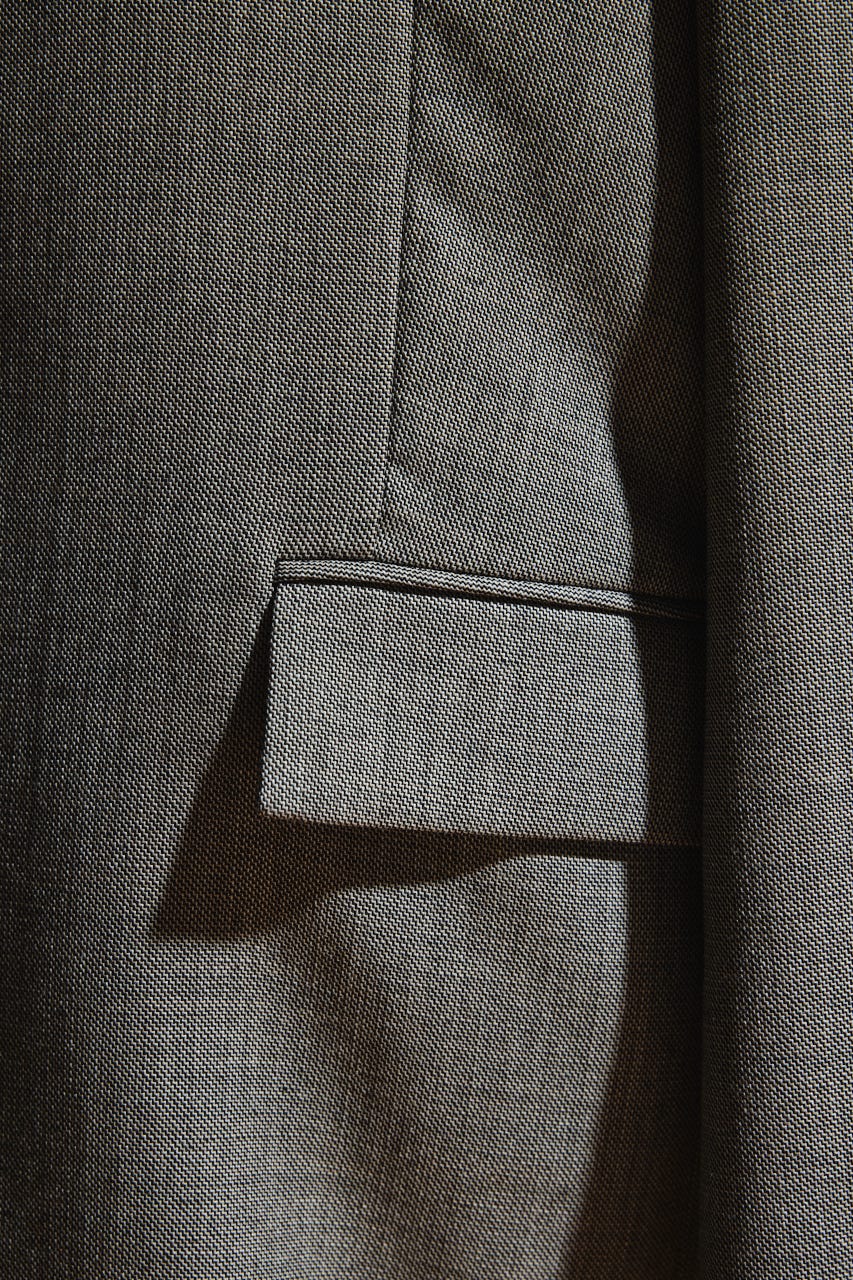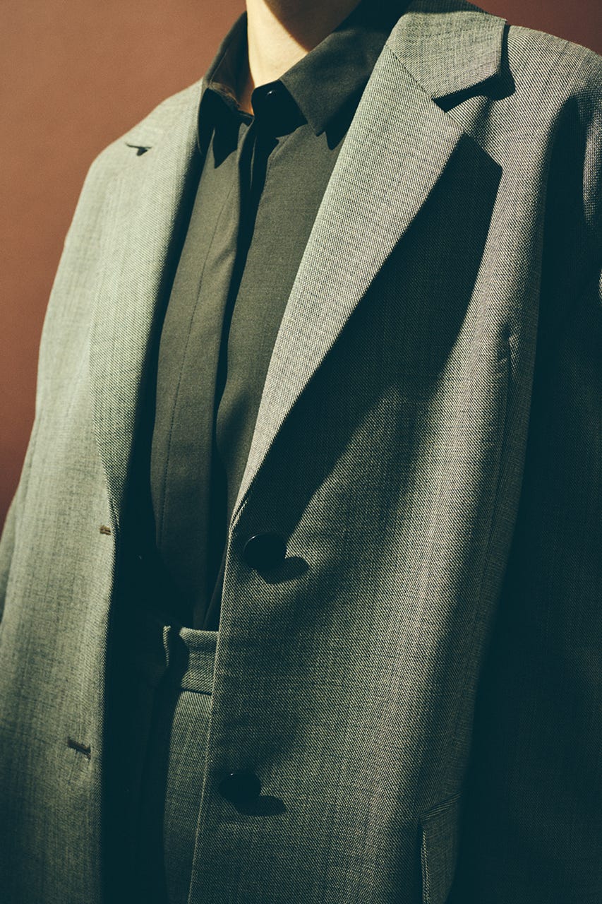 梳毛のクリアな見た目とクラシックなシャークスキンのコンビネーションに加工で弾力のある反発感を加えたハイクオリティな生地は、高度な技術力を持つ日本屈指の機屋が研究を重ねて作り上げたもの。
